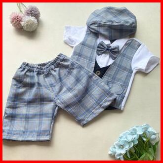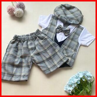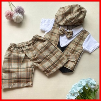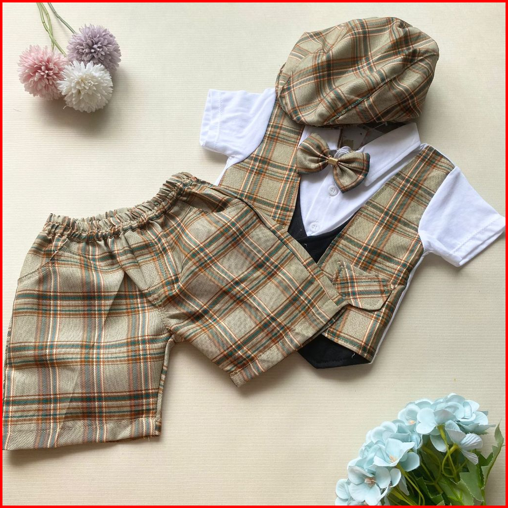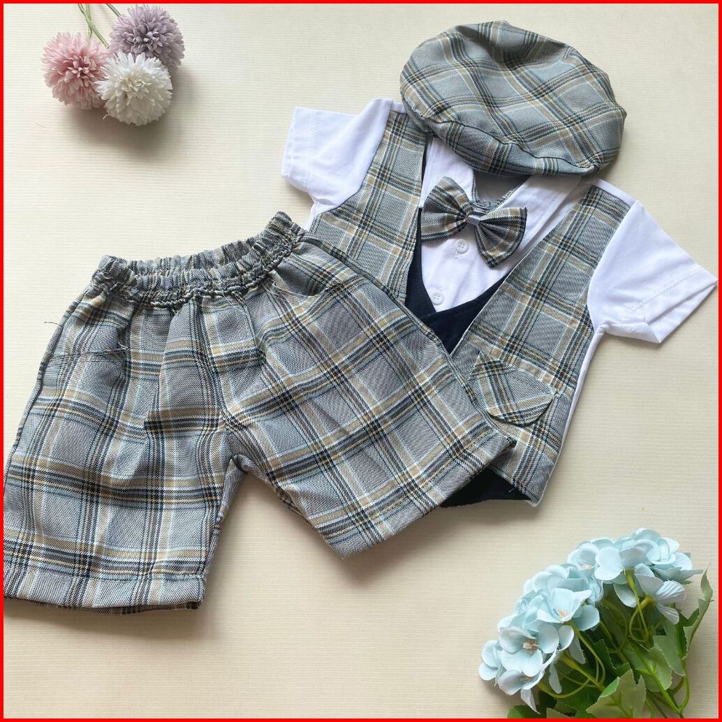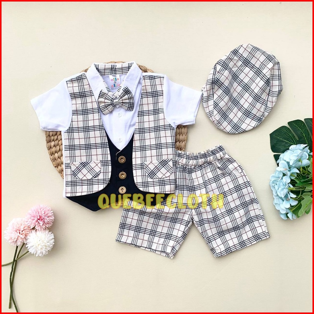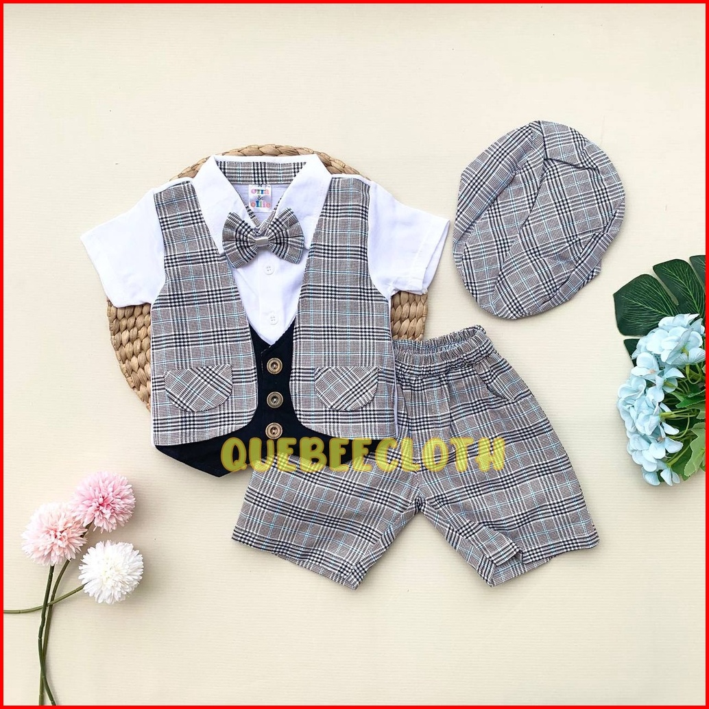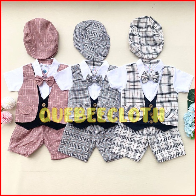 Quebeecloth Fashion Bayi Cowok Setelan Tuxedo Celana Dasi Topi Motif Kotak Rompi Sambung Anak Laki Laki -mic