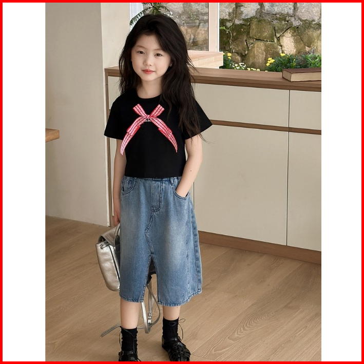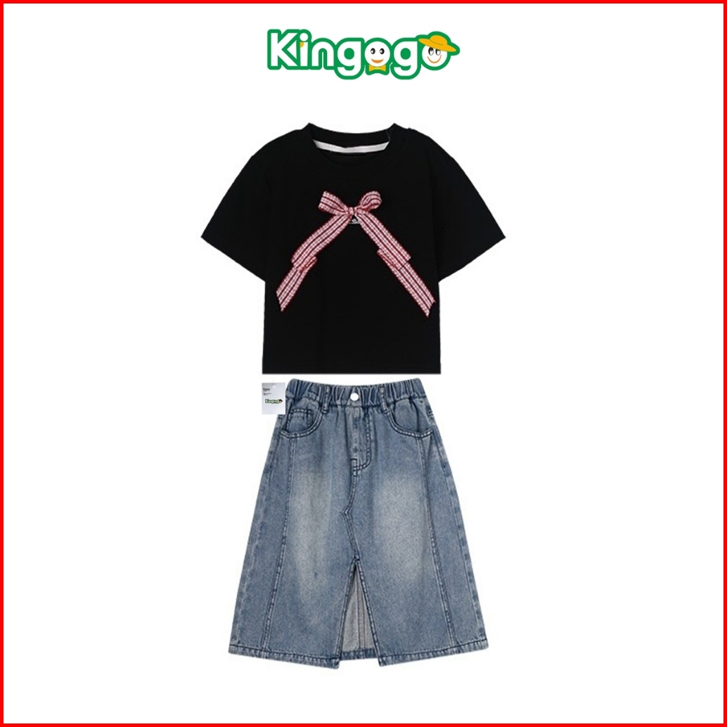 Kingogo Terbaru Setelan Anak Perempuan 3d Korean Pop Bow Hitam Lengan Pendek T-shirt Rok Denim Baju Anak Casual