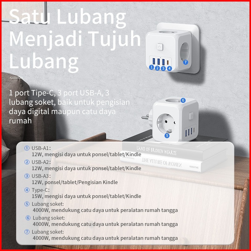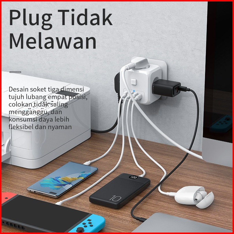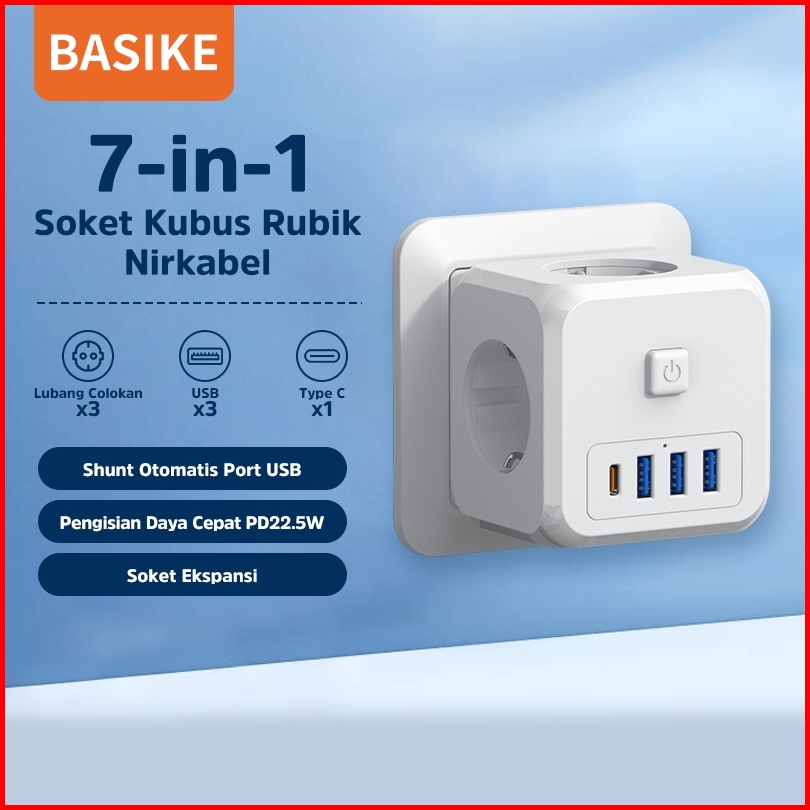Basike Stop Kontak 3 Lubang 7-in-1 Colokan Listrik Kubus Usb Type C Fast Charging Sambungan Kabel