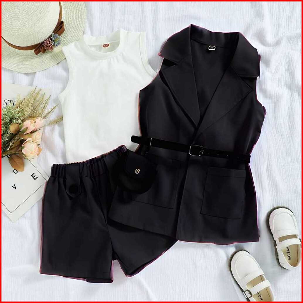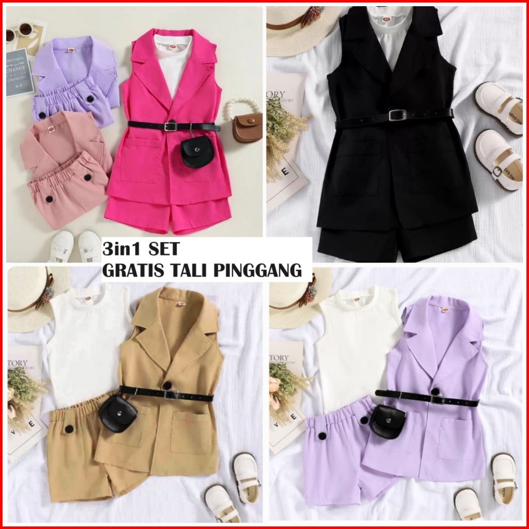 Meandboss Ssp27- Free Belt Setelan Set 3in1 Anak Perempuan Blazer Short Pant Fashion Korea