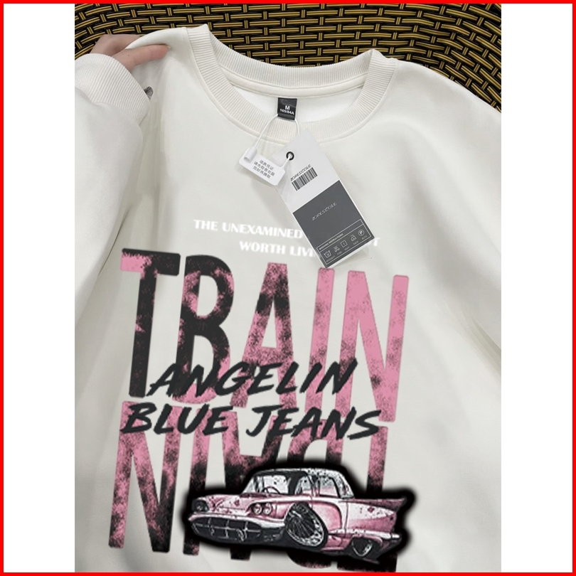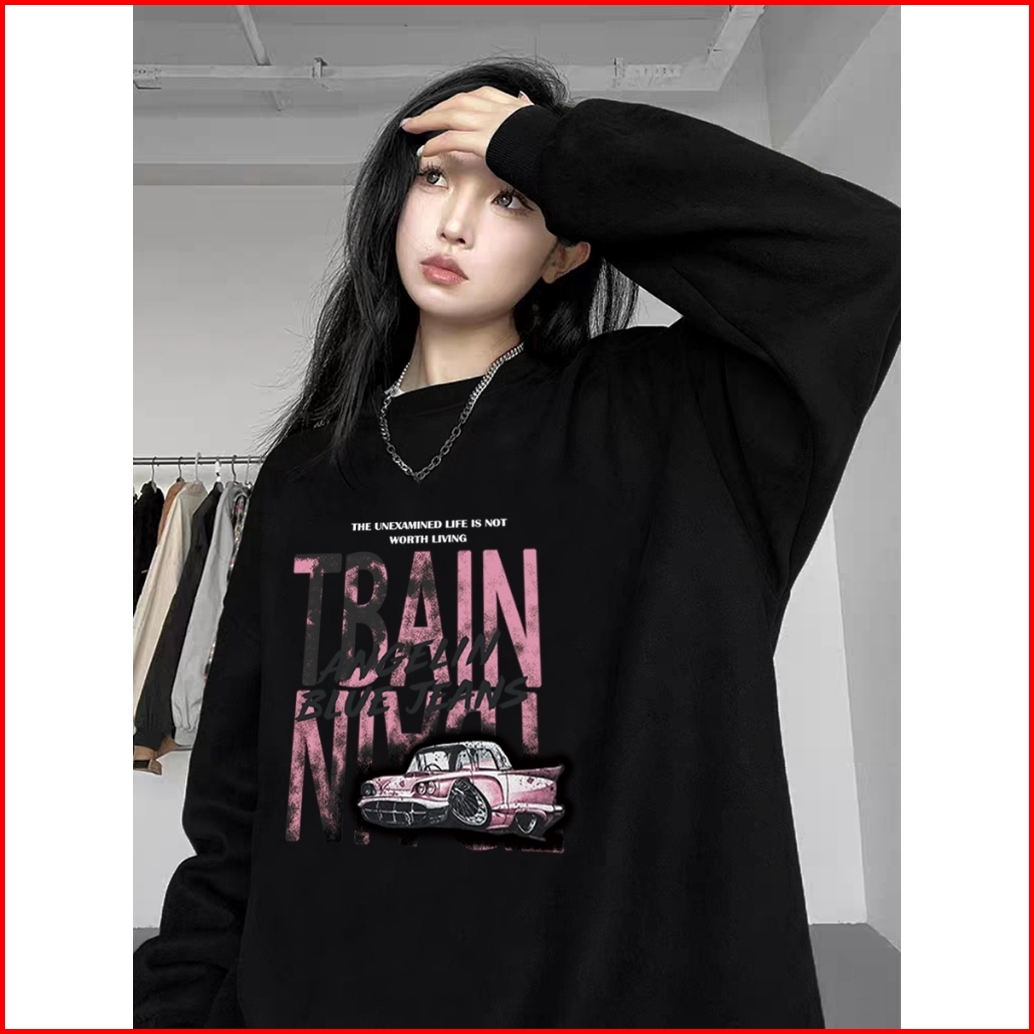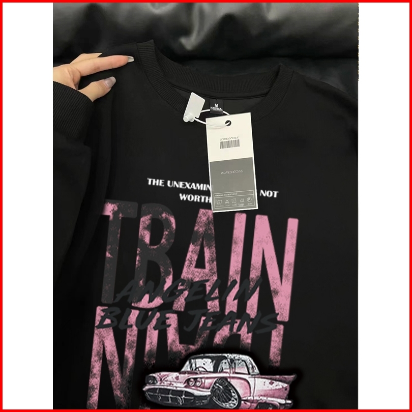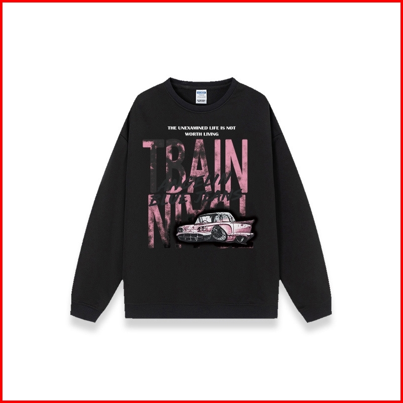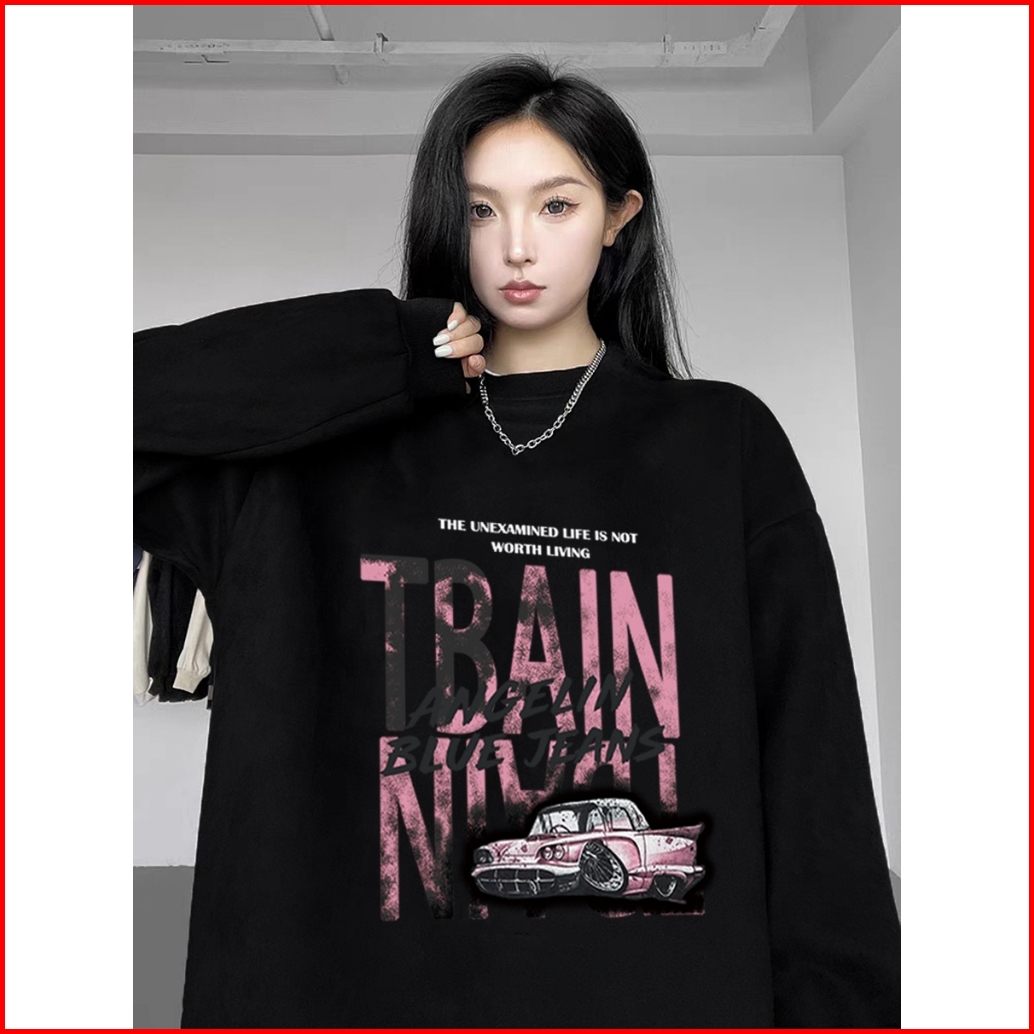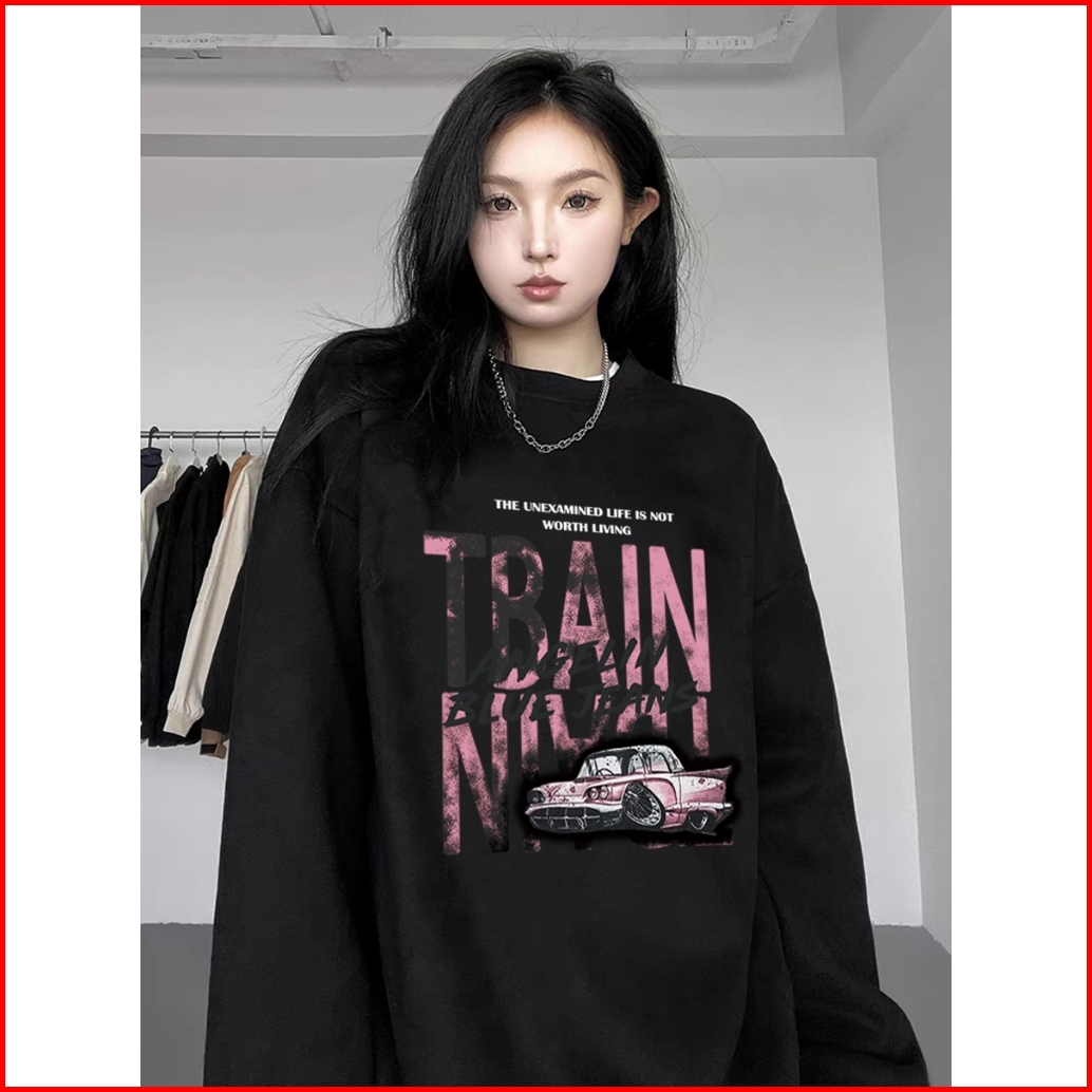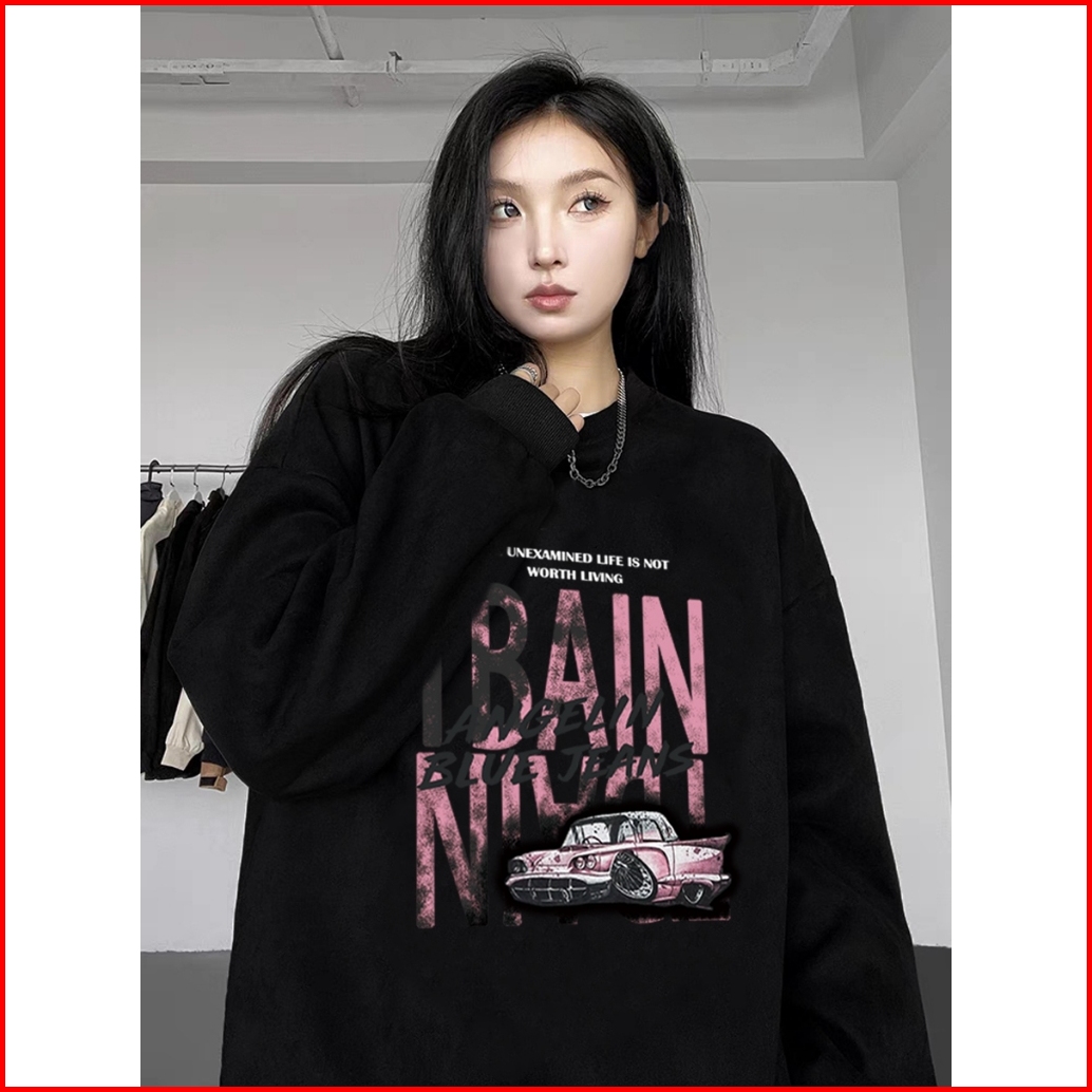 Fastfash Crewneck Sweater Lengan Panjang Oversize Hitam American Car Alphabet Switer Street Style Unisex