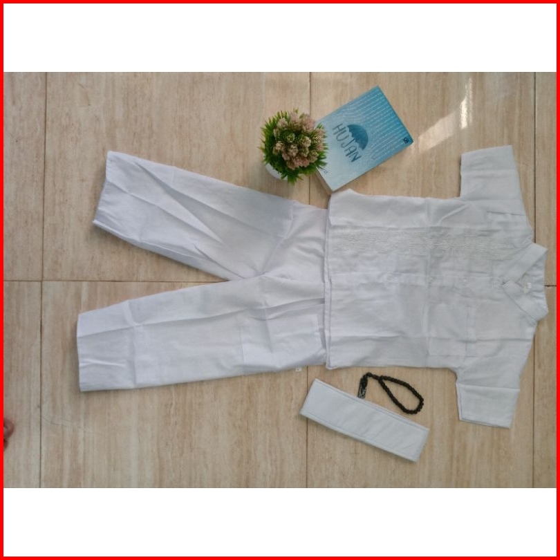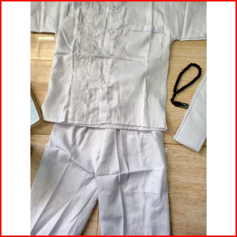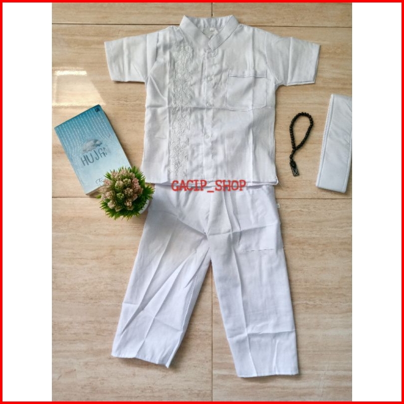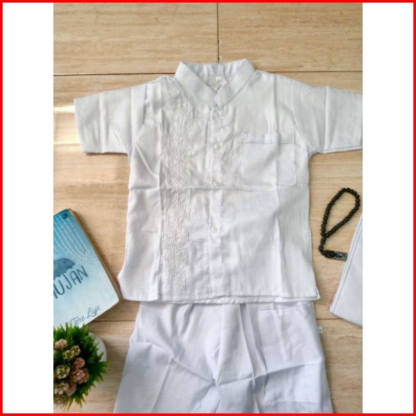 Baju Koko Putih Pendek Anak Laki Laki Motif Bordir Sigaret Saku Depan Usia 4-15thn