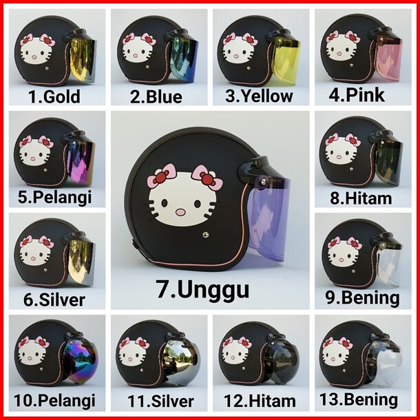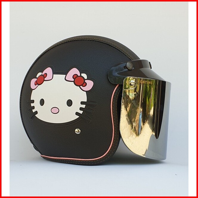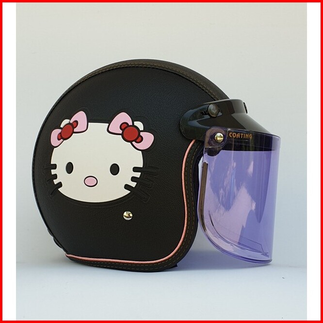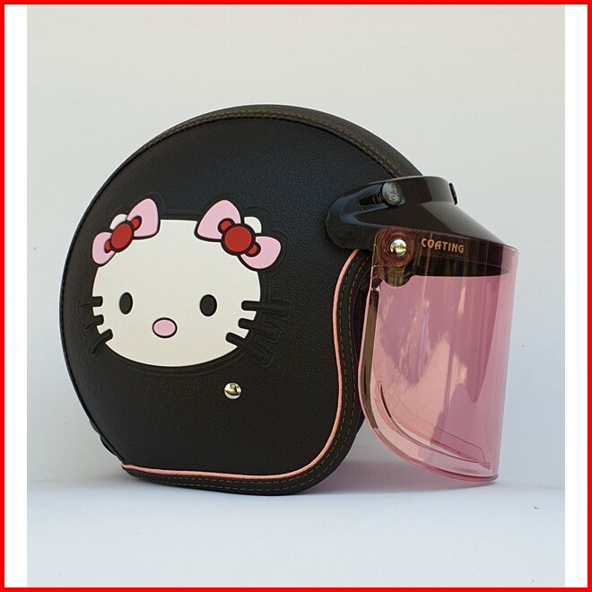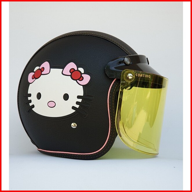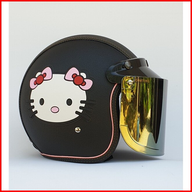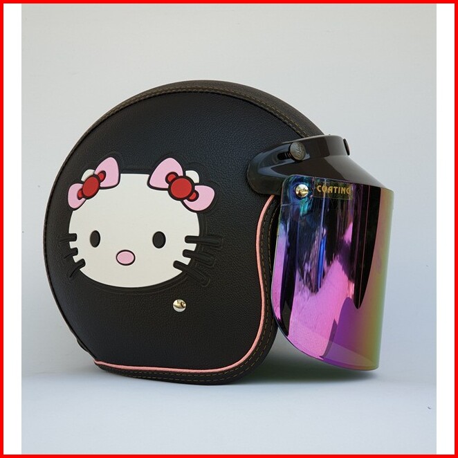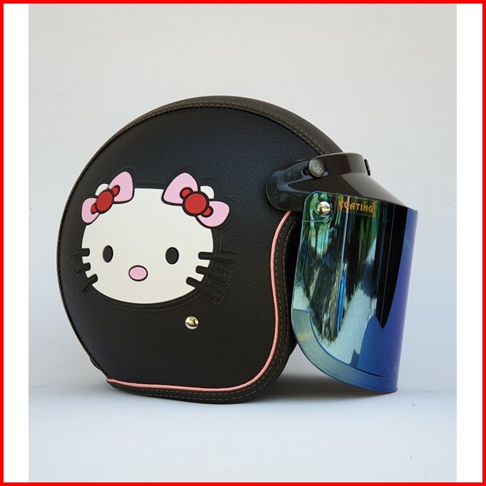 Helm Wanita Dewasa Bogo Kulit Warna Hitam Ful Leher Gambar Hellokity Dengan Kaca Datar Dan Cembung