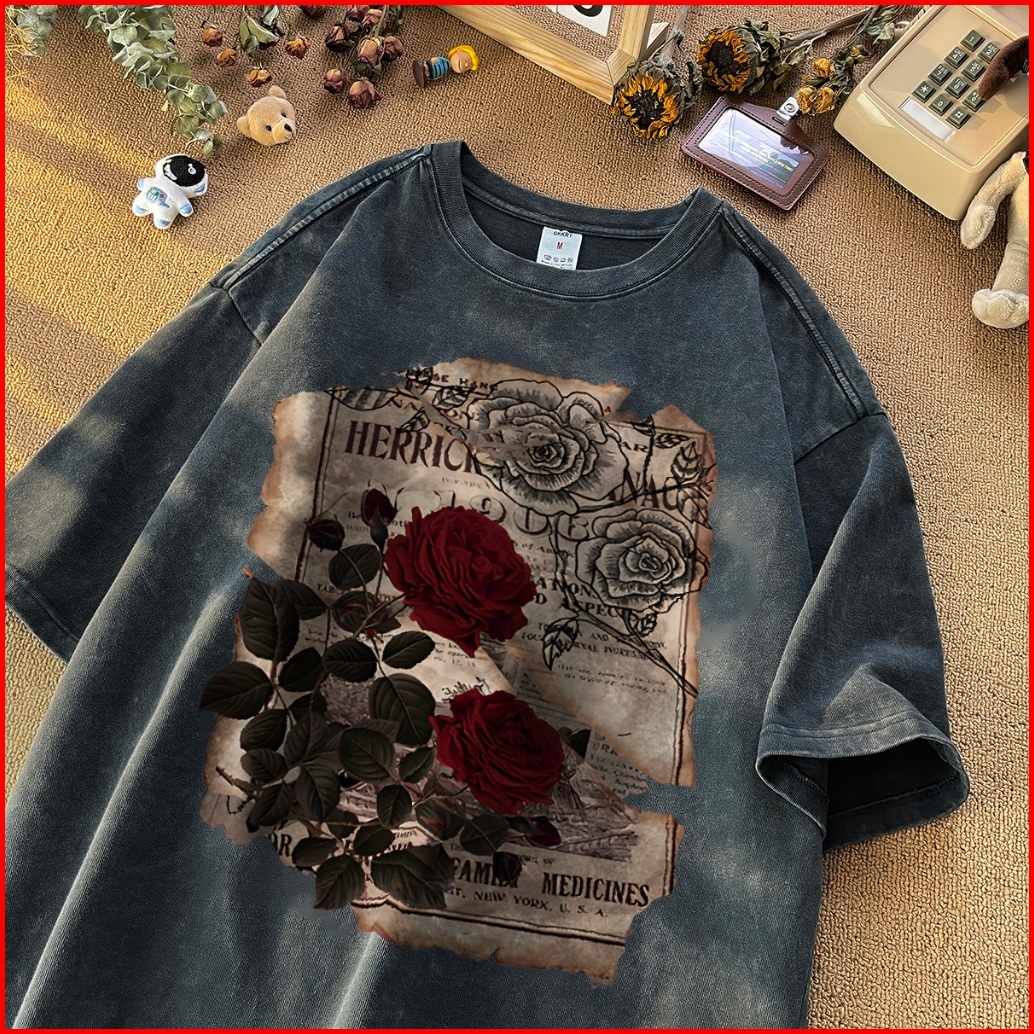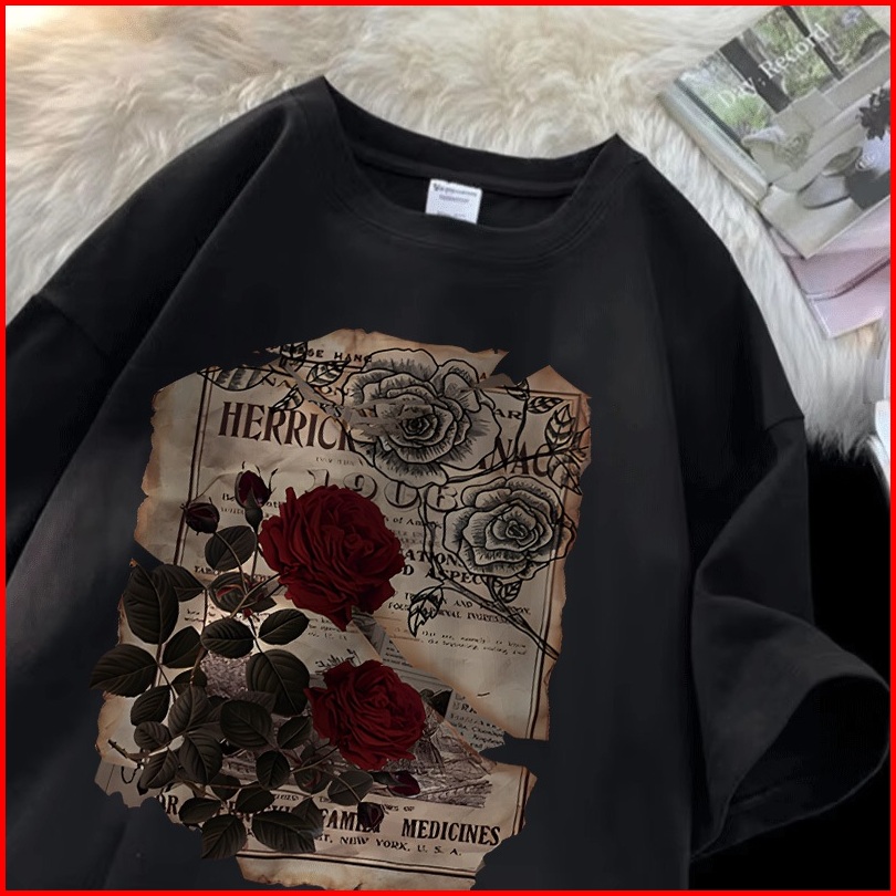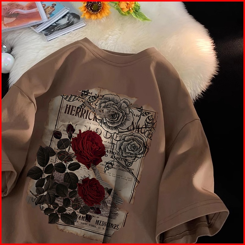 Fastfash Kaos Lengan Pendek Pakaian Pria Dan Wanita Oversize Vintage Retro Rose Flower - Baju Kaos Polos Putih Bergaya N