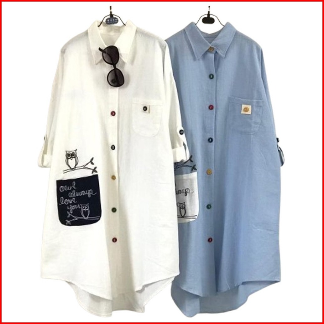 - Owl Long Tunik Patch Pocket Atasan Wanita Muslim Cringkle All Size Fit To Xl Ootd Casual Daily
