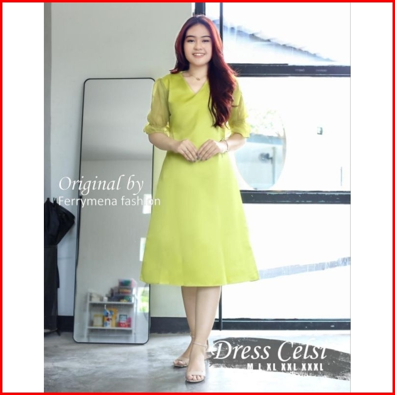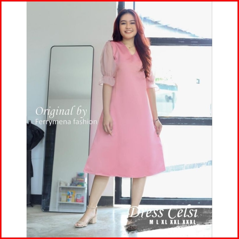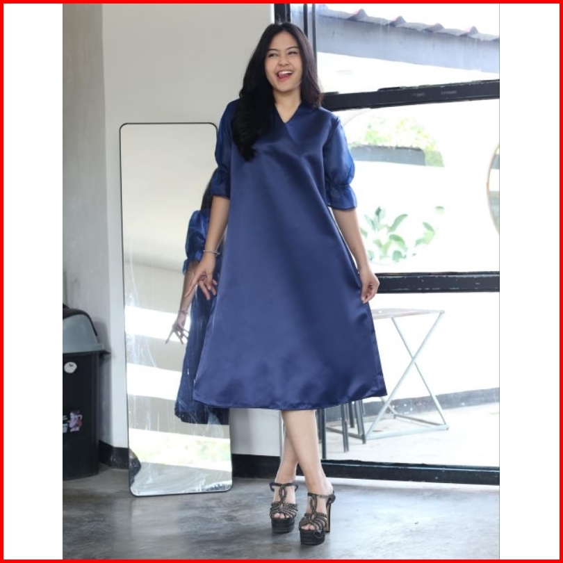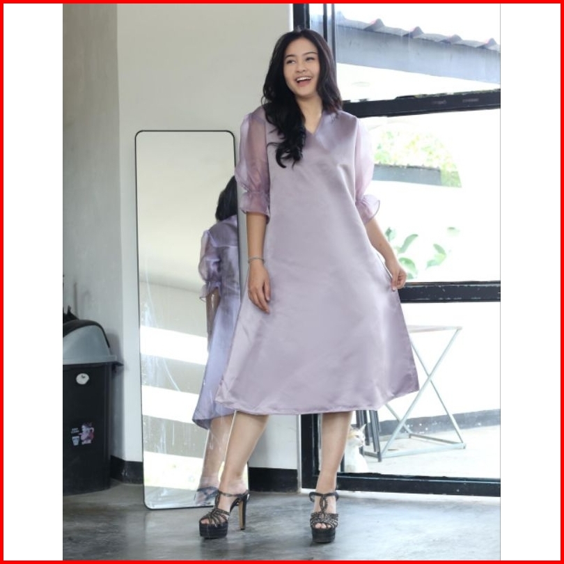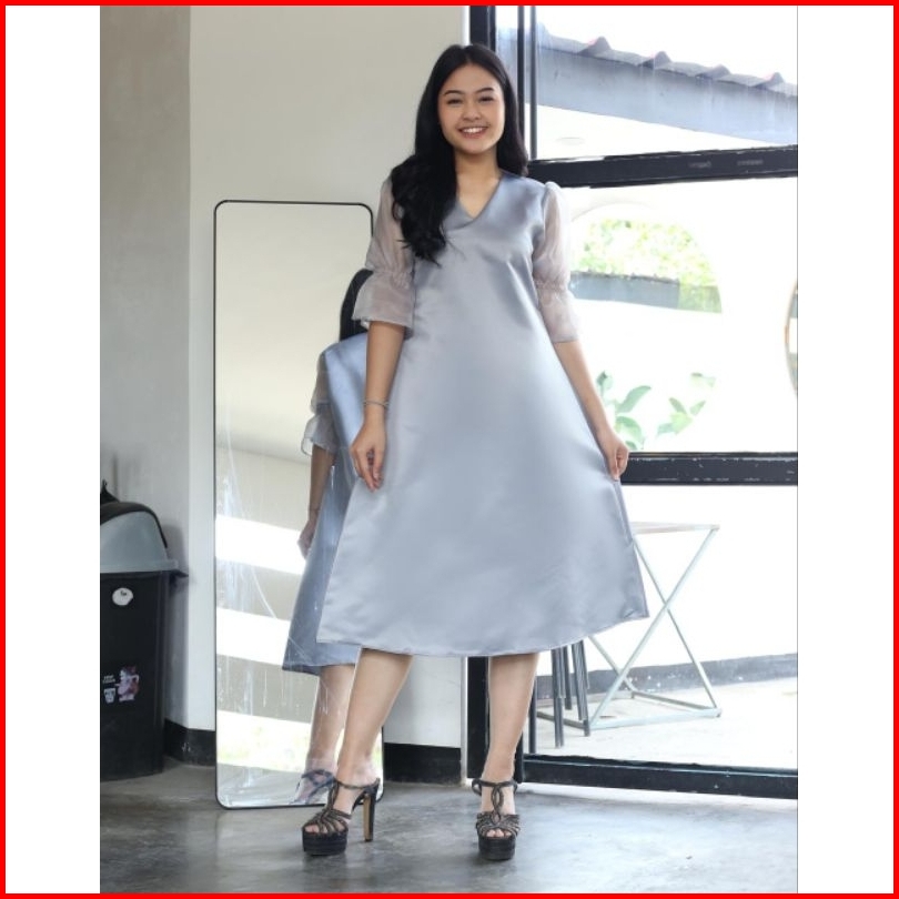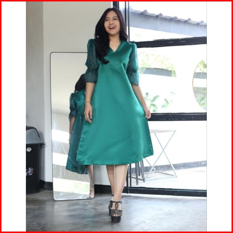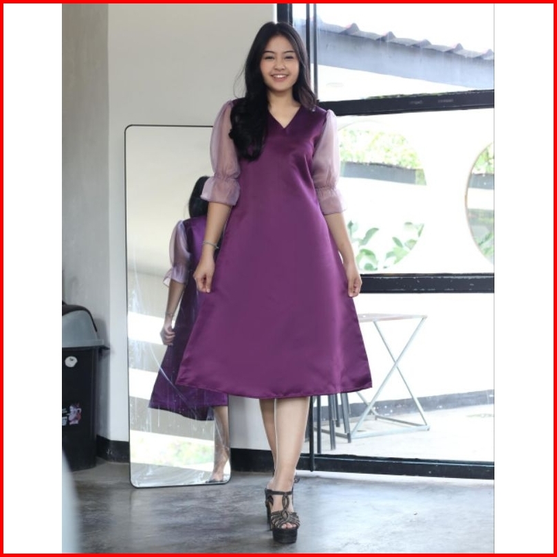 Dress Satin Premium Celsi Lengan Organza Mewah Pesta Natal Dan Tahun Baru 2025