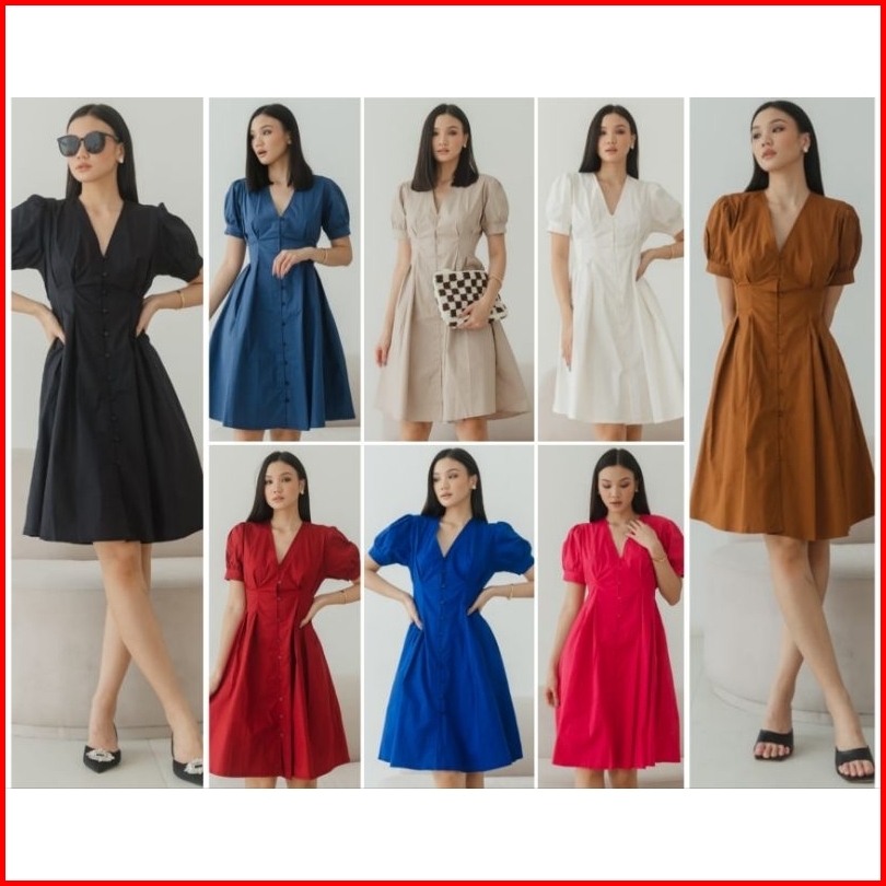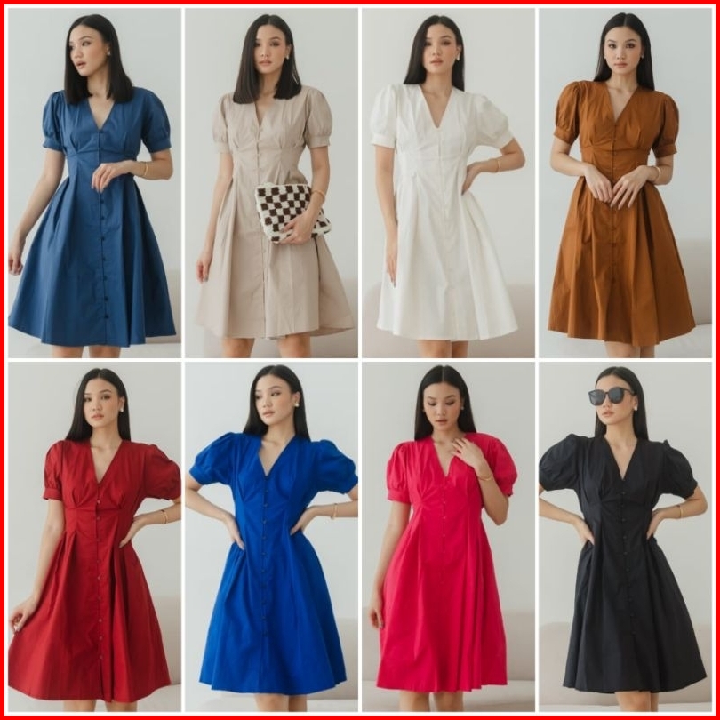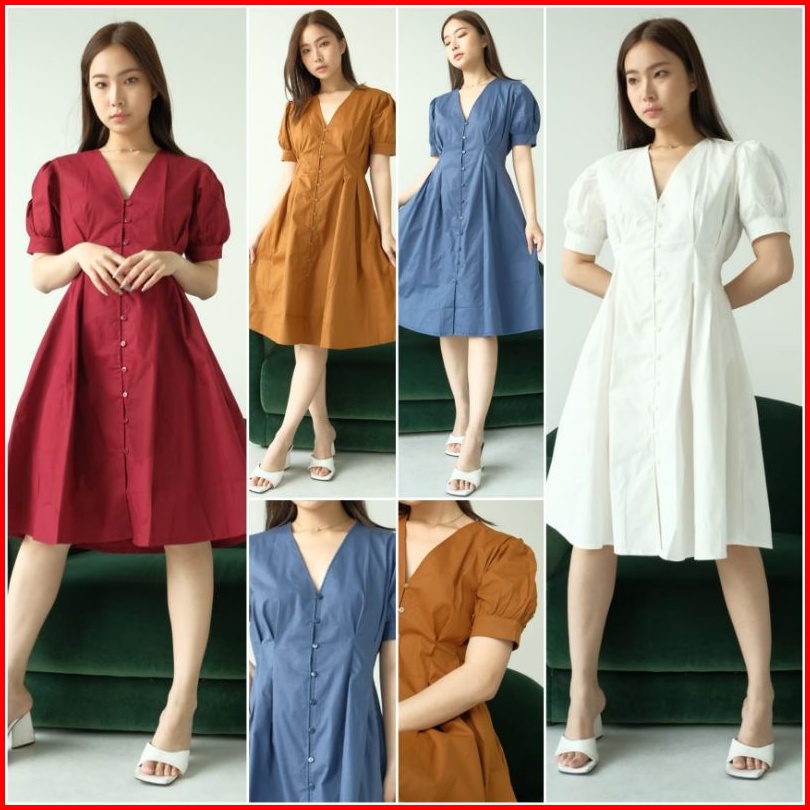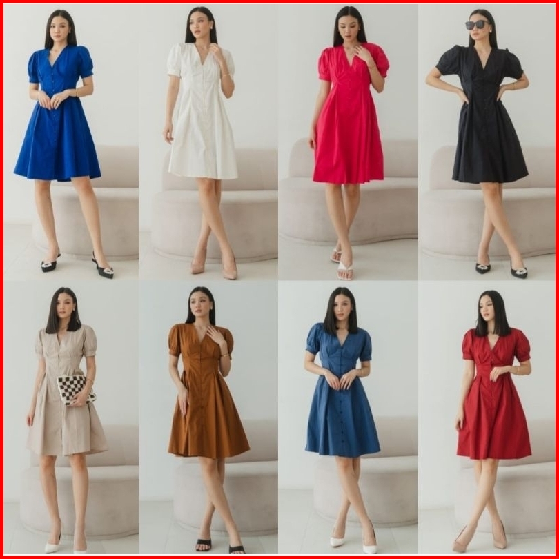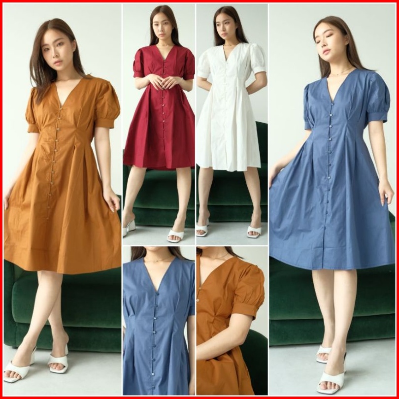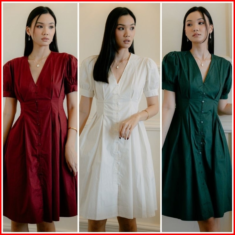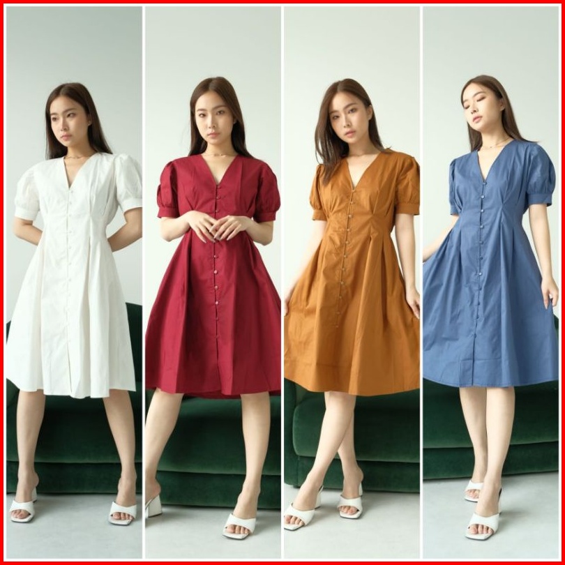 Sheliciousroom Premium Lokal Best Seller Minella Cotton Poplin Dress Plain V-neck Button Flare Mini Katun Dress Christma
