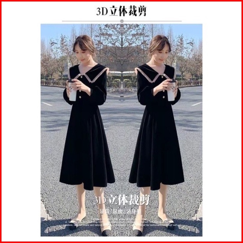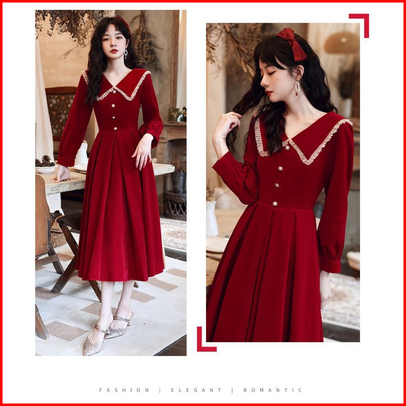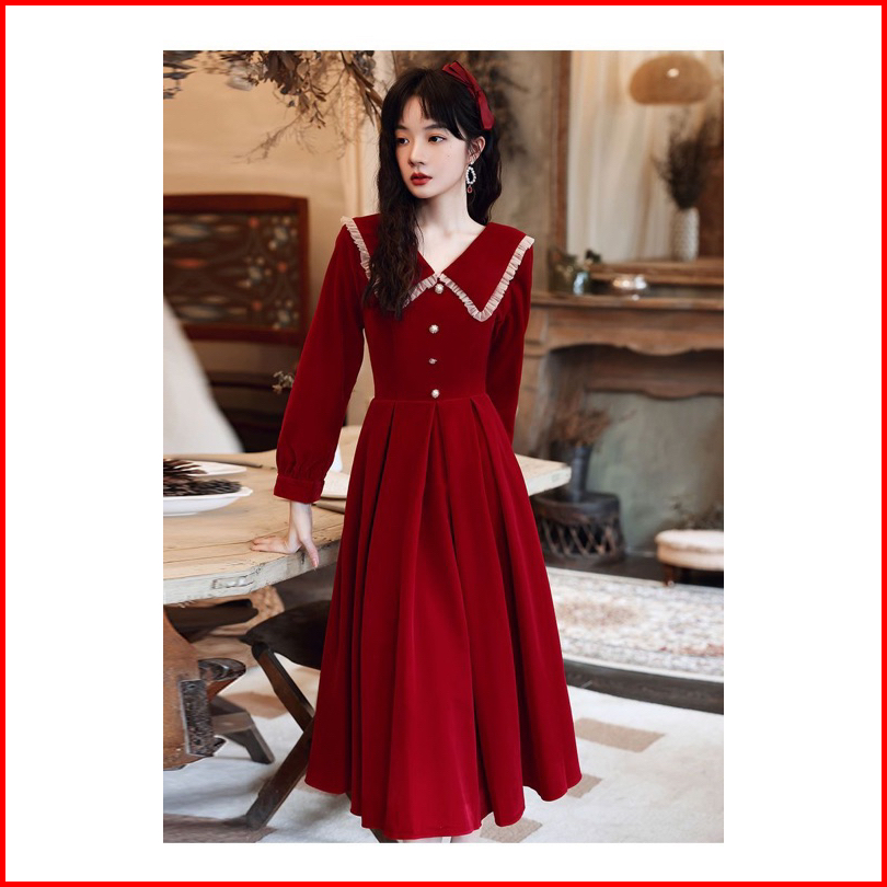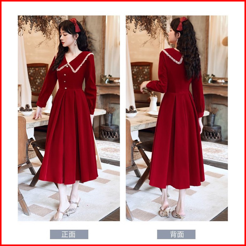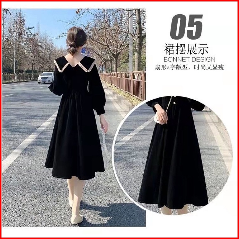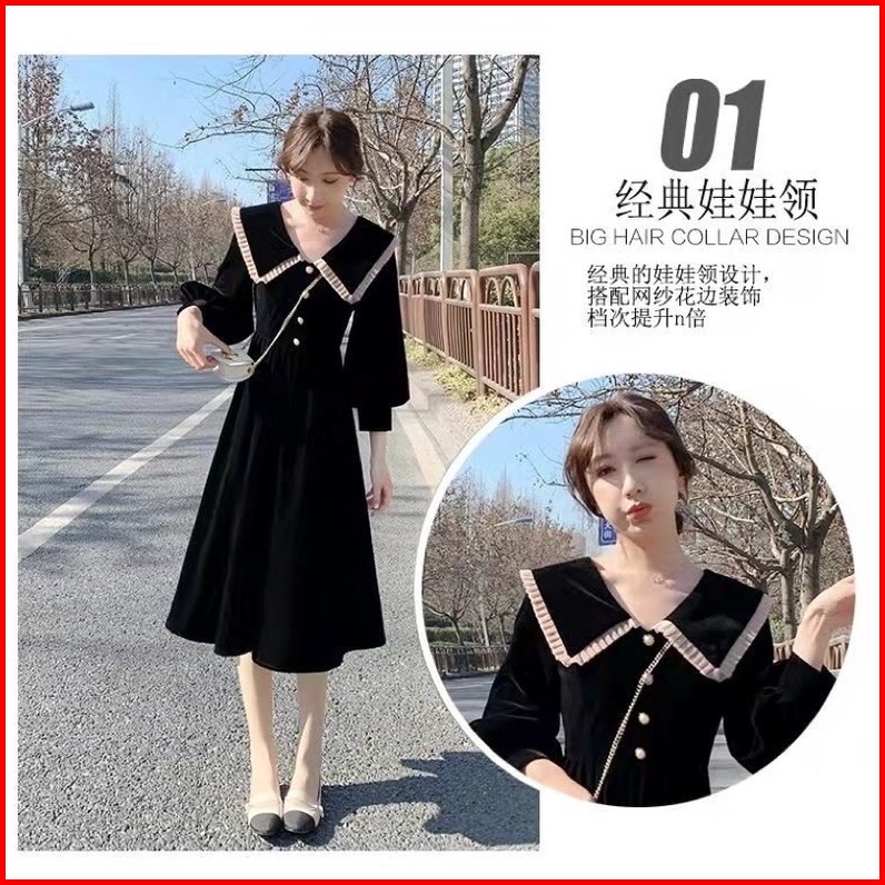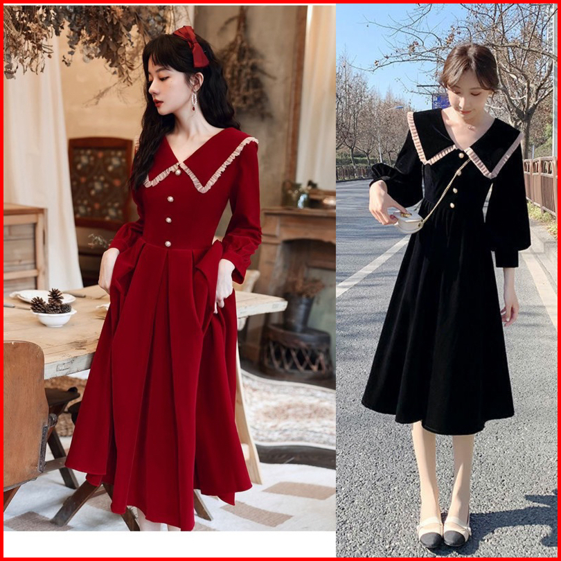 D21 21 Korea Velvet Dress Lengan Panjang Kerah Pita Midi Dress A Line Dress Long Sleeve Korean Style Vintage Dress