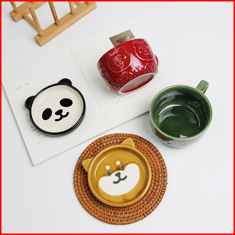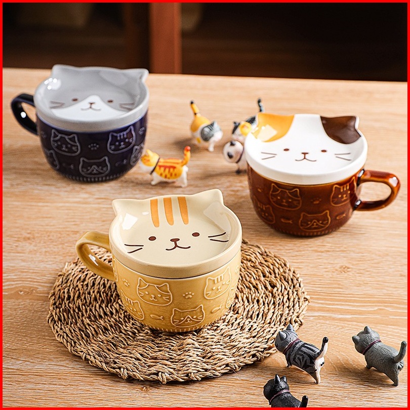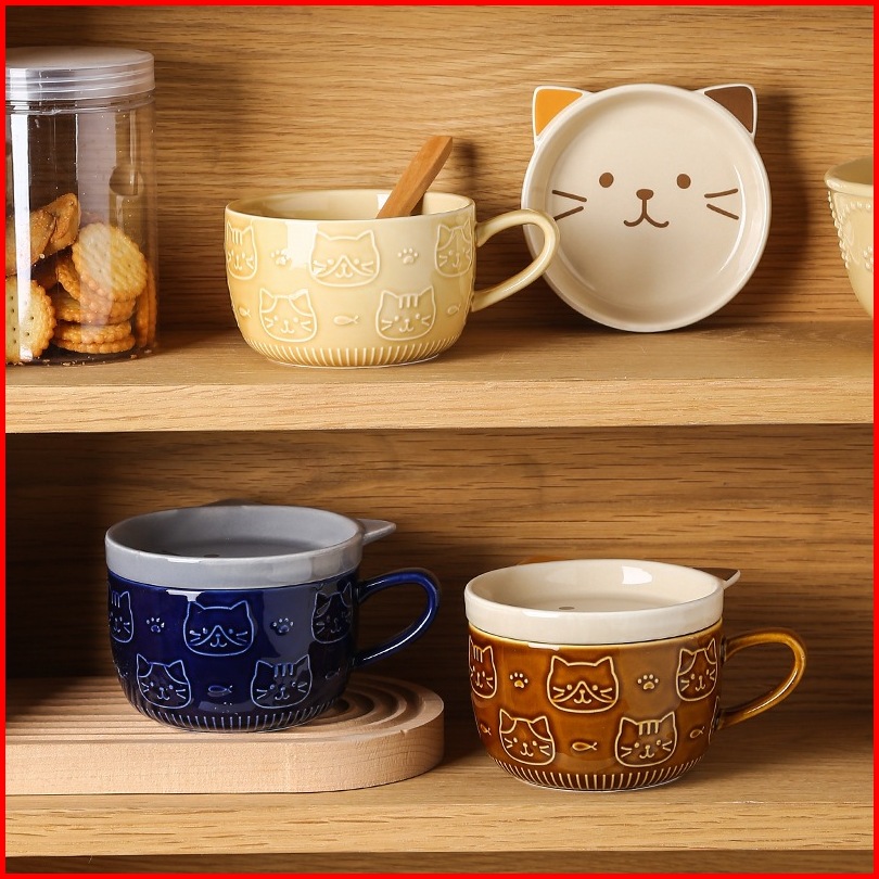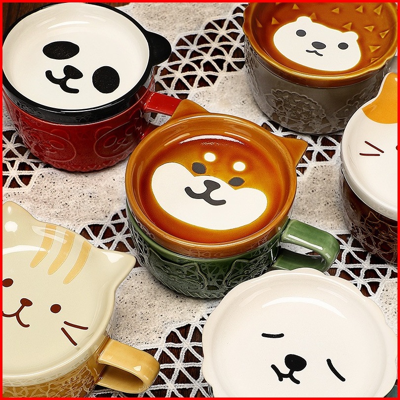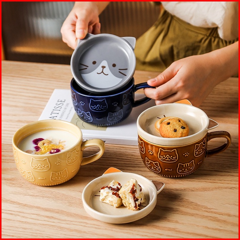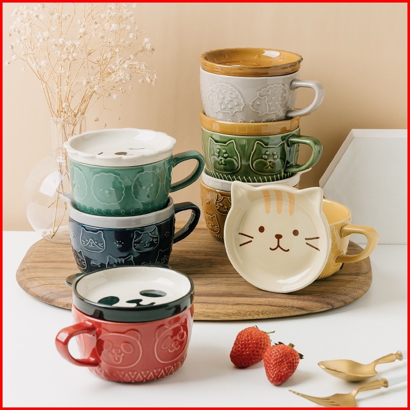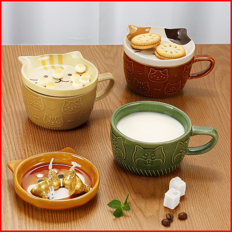 Ready Stock Mug Keramik Kartun 5 Warna Brown Cat Coaster Mug Set Mug Cartoon Kopi Keramik Dengan Tutup Mug Sarapan Lucu