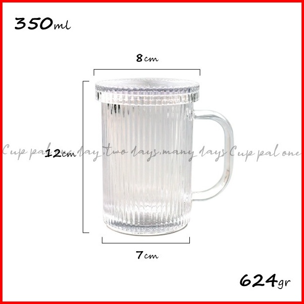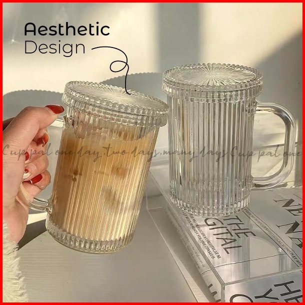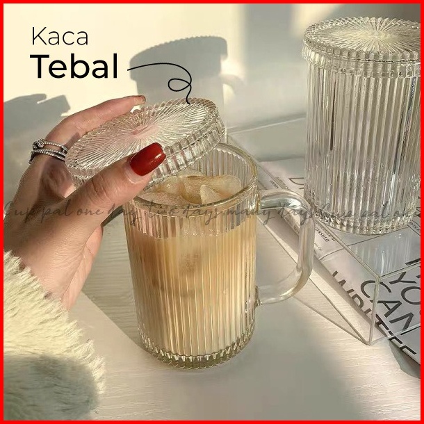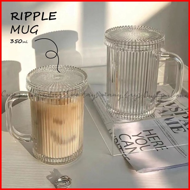 Mug Kaca Ripple Cangkir Gelas Minum Kaca 350ml Dengan Tutup Glass Kopi Jus Juice Teh Cantik Unik Pegangan