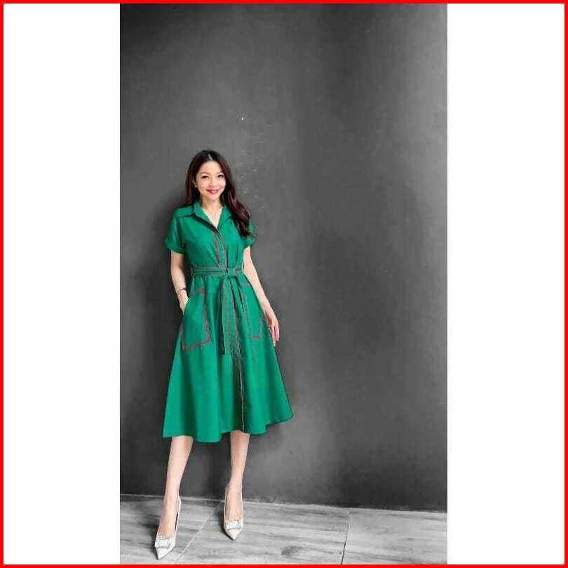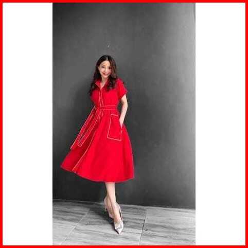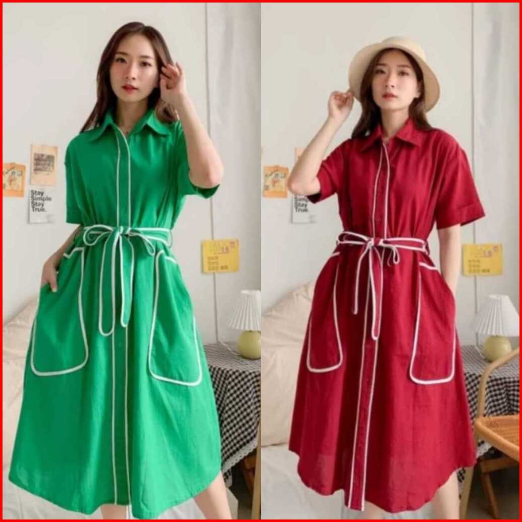 Mbo Dress Wanita Korea Kantong Dua Pinggang Tali Pita Midi Dress Bawah Lutut Natal Christmas