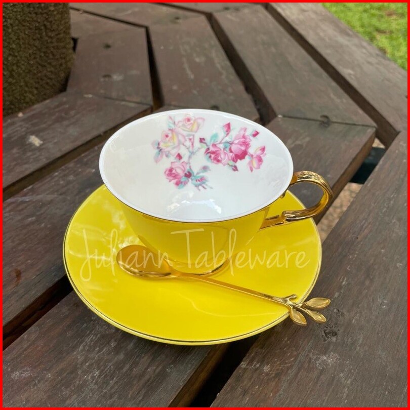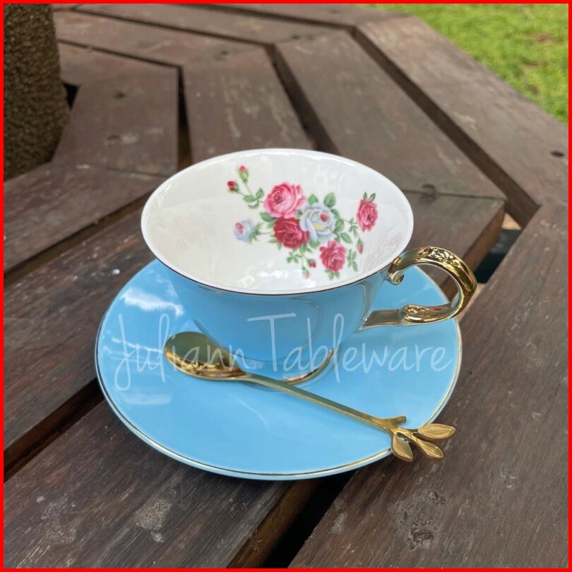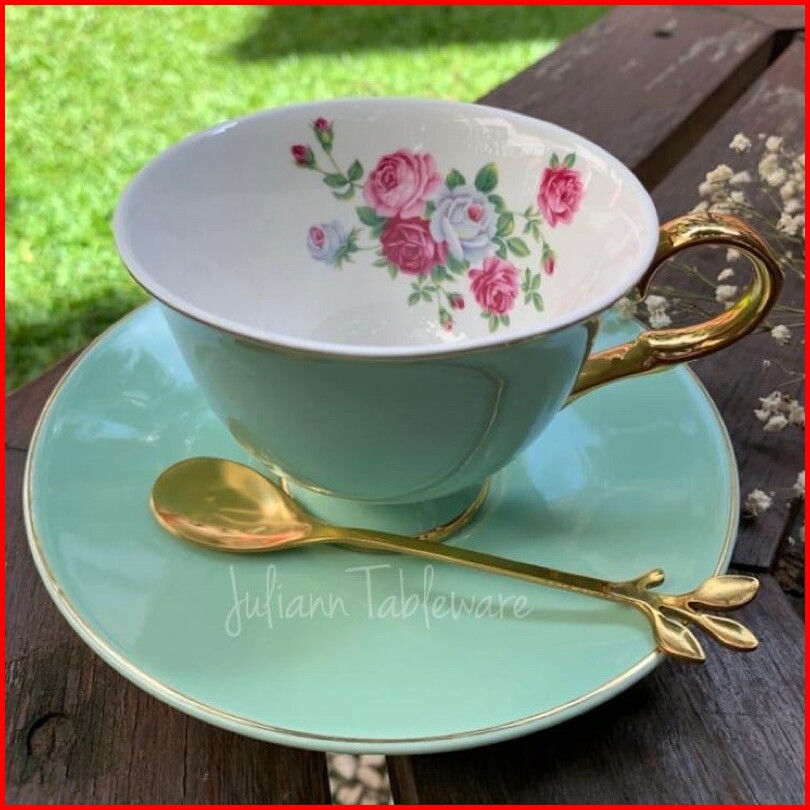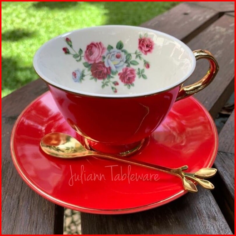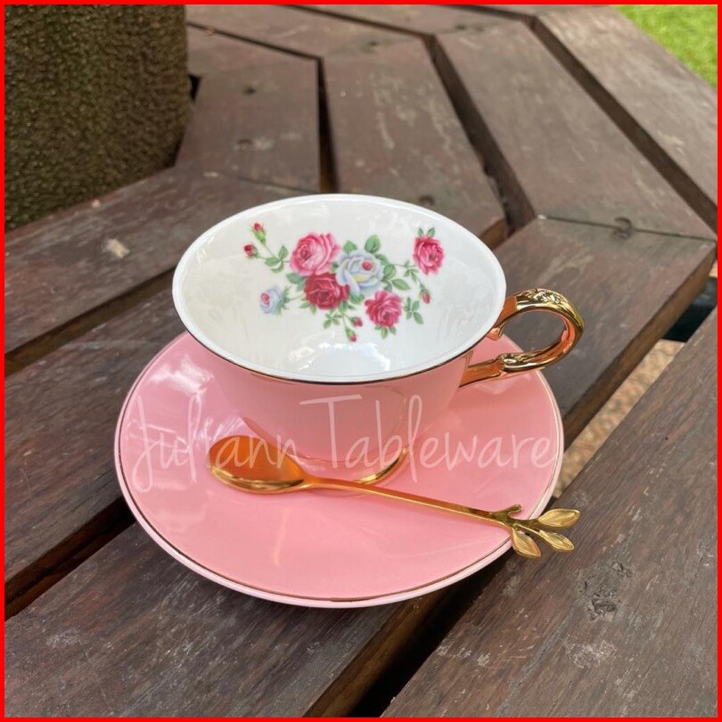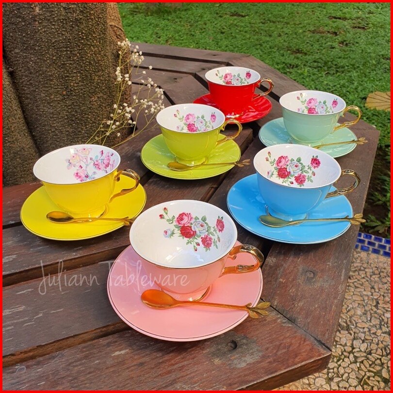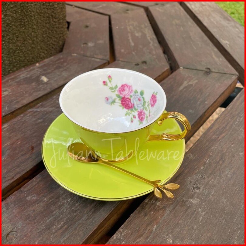 Cangkir Teh Kopi Keramik Motif Bunga Rose Cantik Mewah Sendok Piring