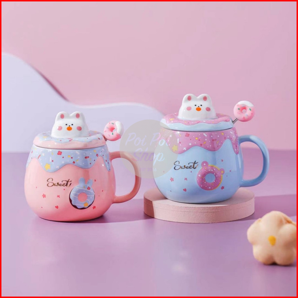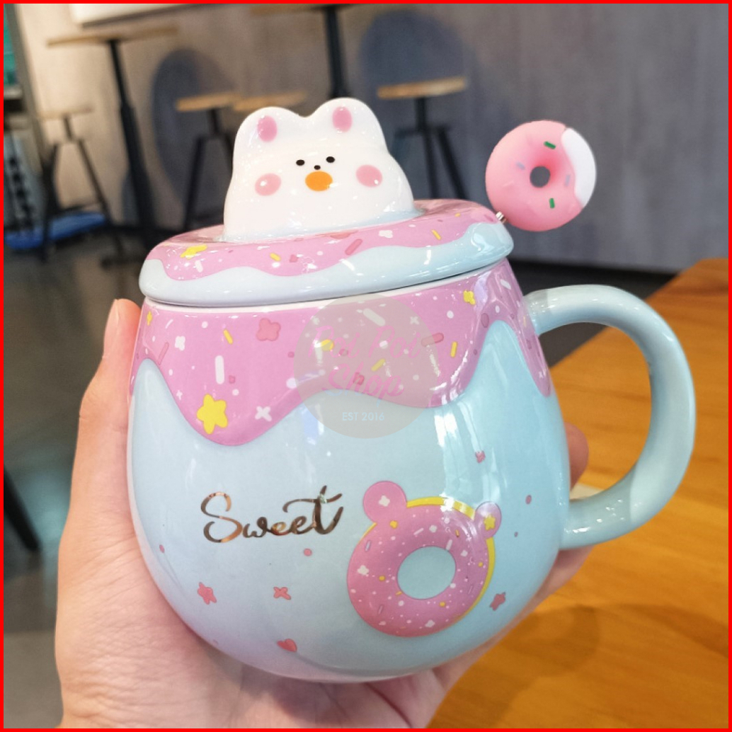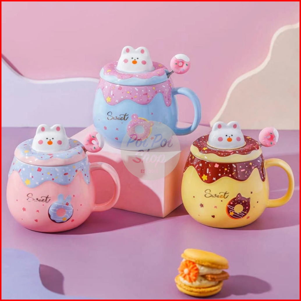 Cangkir Keramik Cat Cute Doughnut Rabbit Cup Gift Set Ceramic Mug 400 Ml Dengan Sendok Dan Tutup High Quality