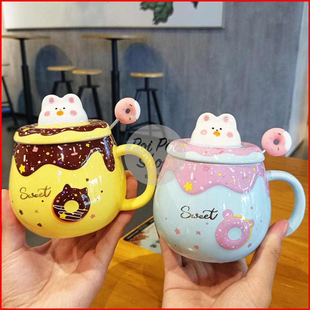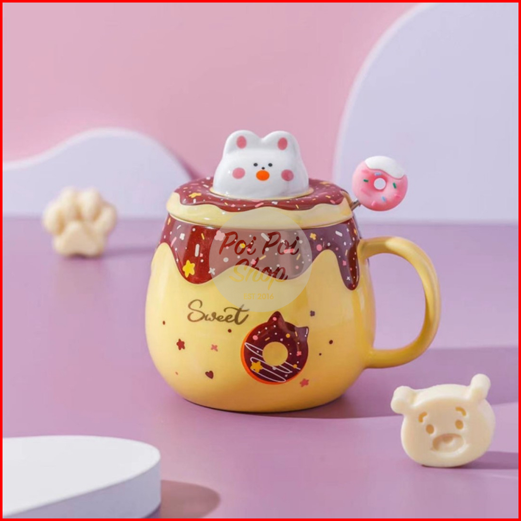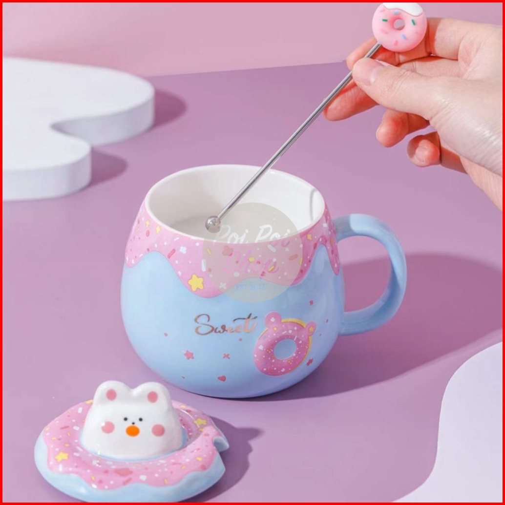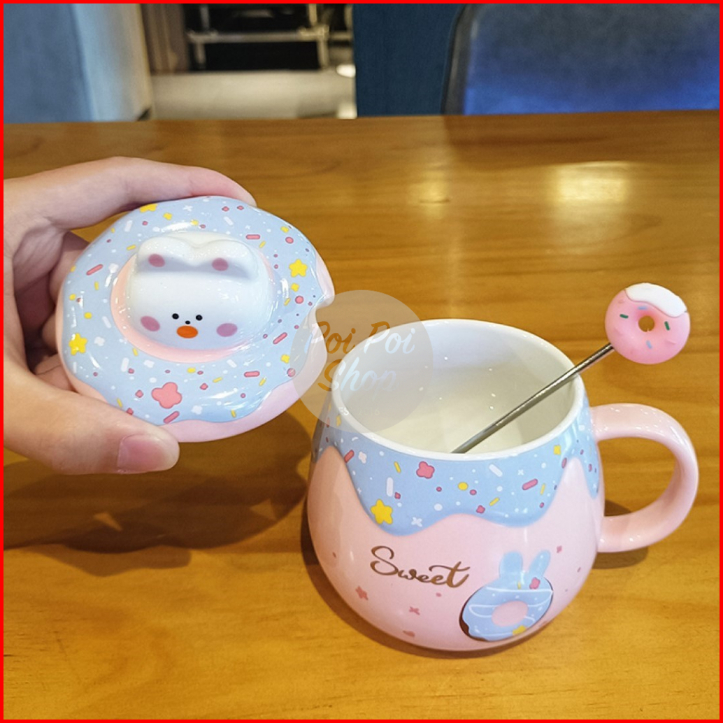 Cangkir Keramik Cat Cute Doughnut Rabbit Cup Gift Set Ceramic Mug 400 Ml Dengan Sendok Dan Tutup High Quality