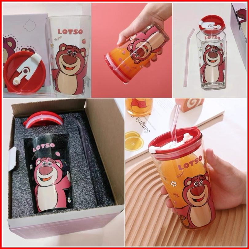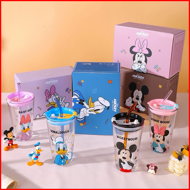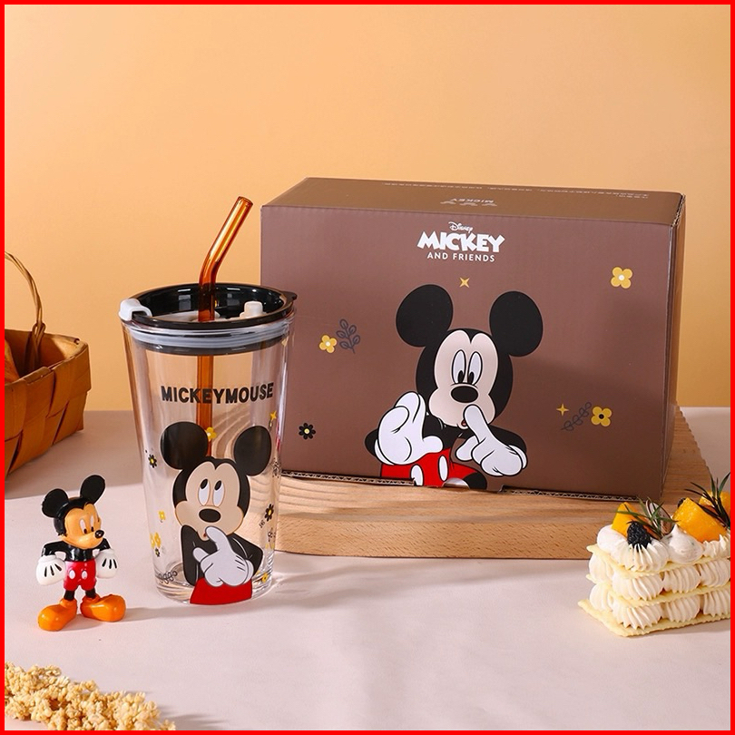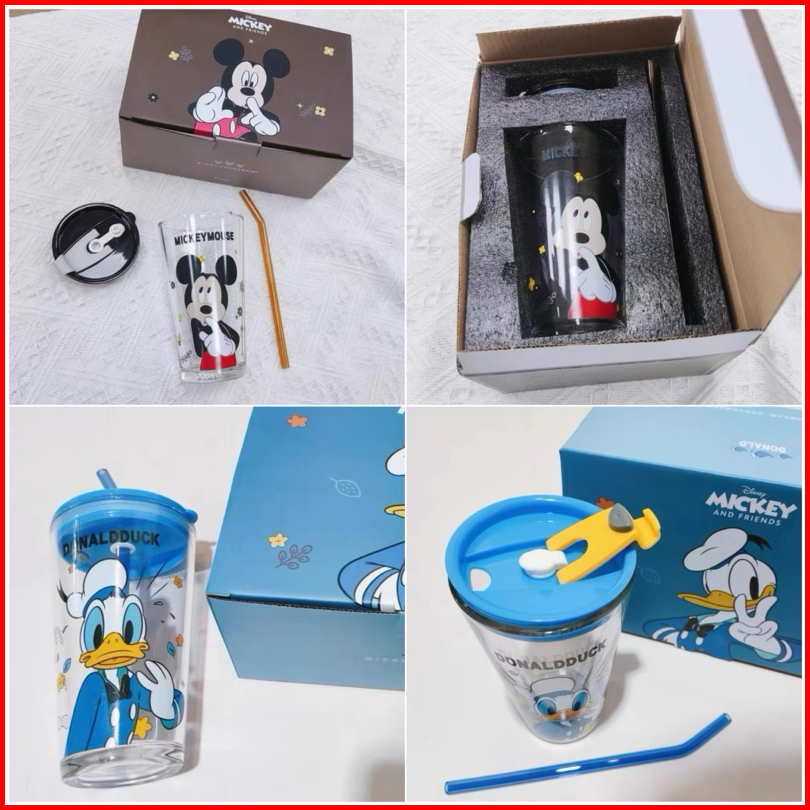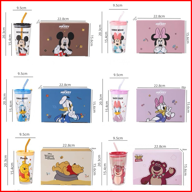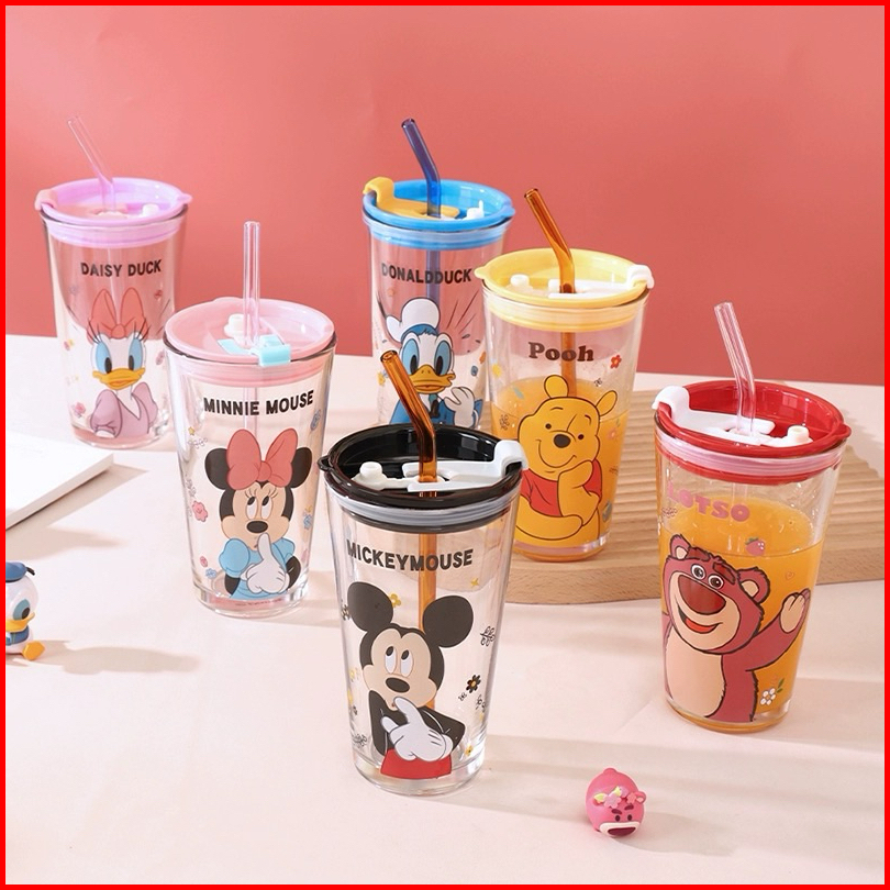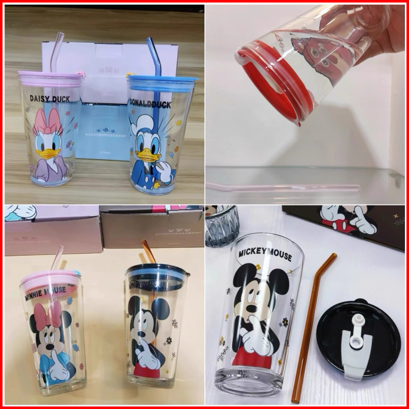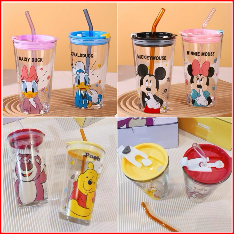 Disney Glass Tumbler Gelas Kaca Dengan Tutup Mickey Minnie Pooh Donald Glass Cute Tableware