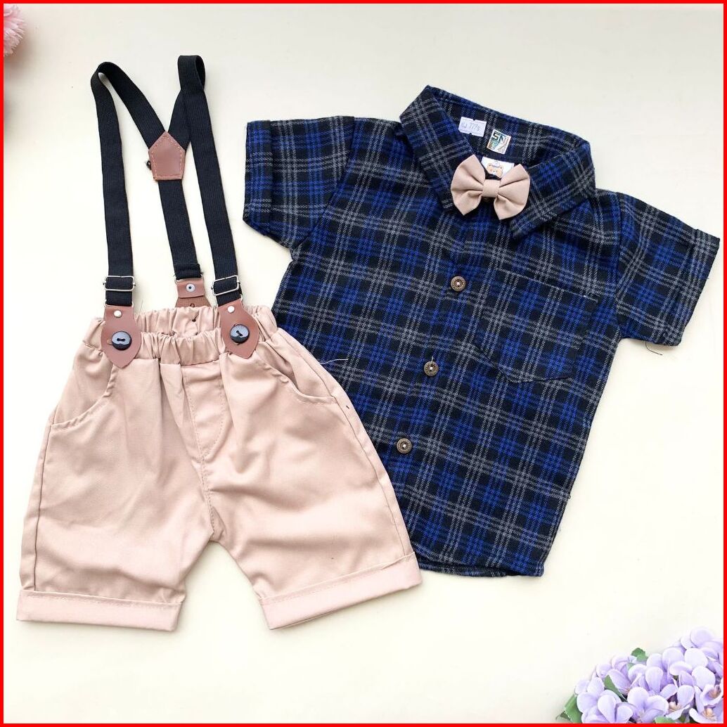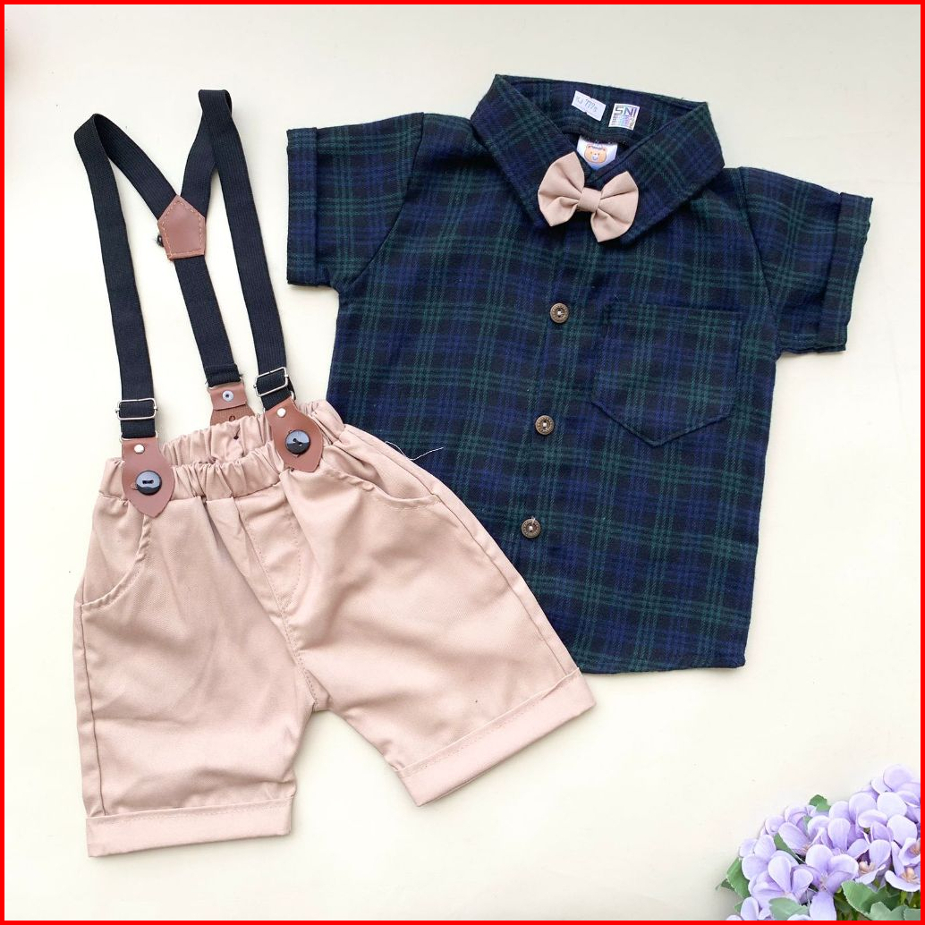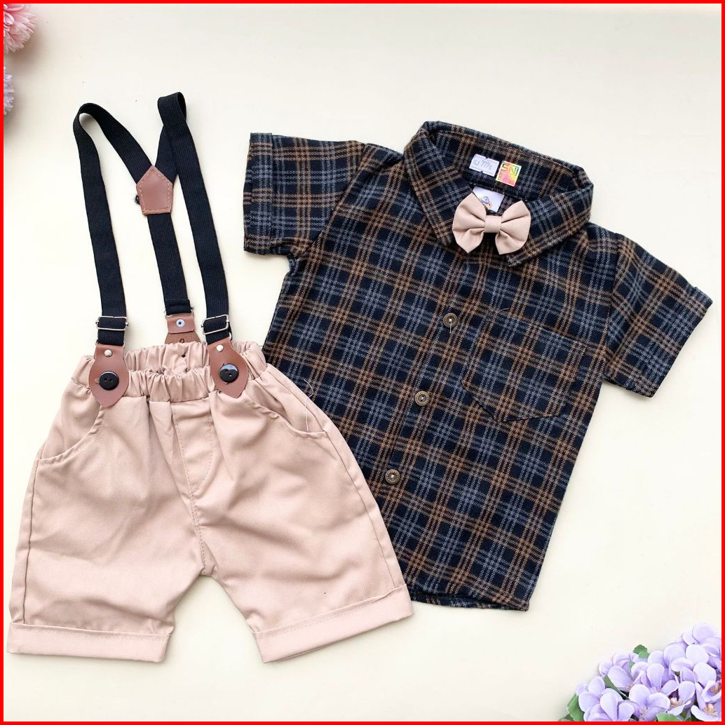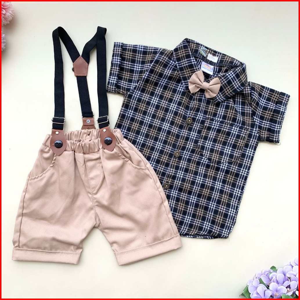 Quebeecloth-baju Setelan Jumper Celana Suspender Motif Kotak Pergi Jalan Fashion Anak Bayi Cowok Laki Murah -fla