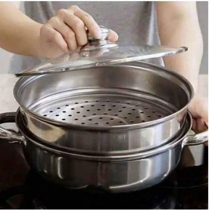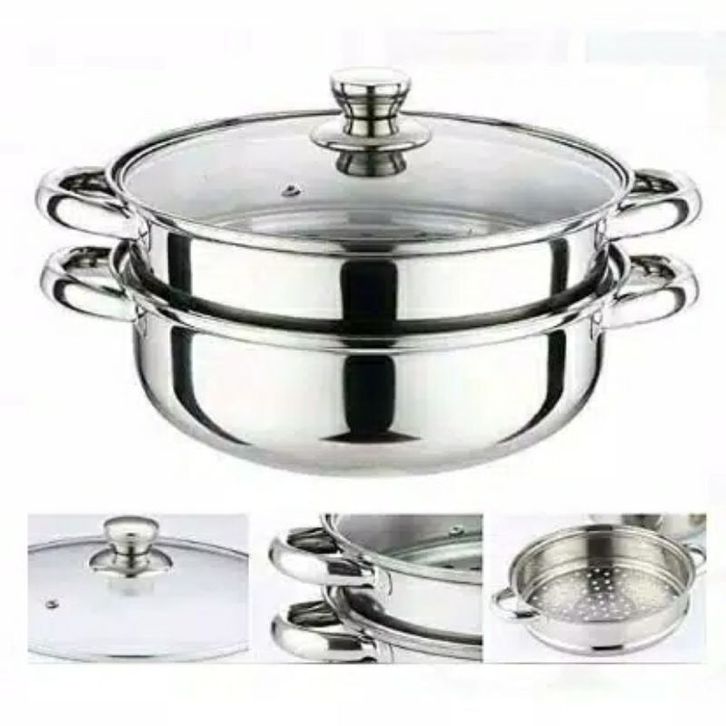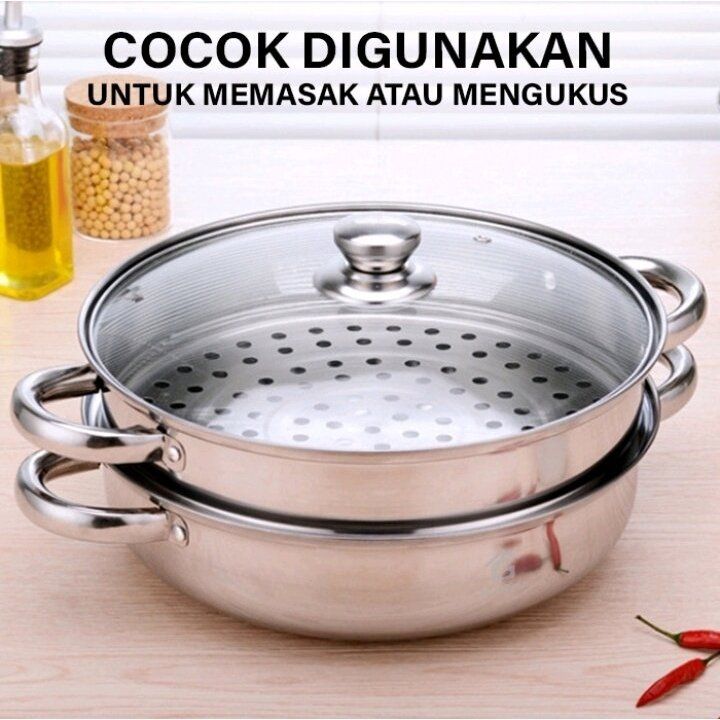 Panci Kukus Panci Steamer 2 Tingkat Susun Dandang Steamer Dilengkapi Tutup Kaca Stainless Steel Anti Karat Uk 28cm