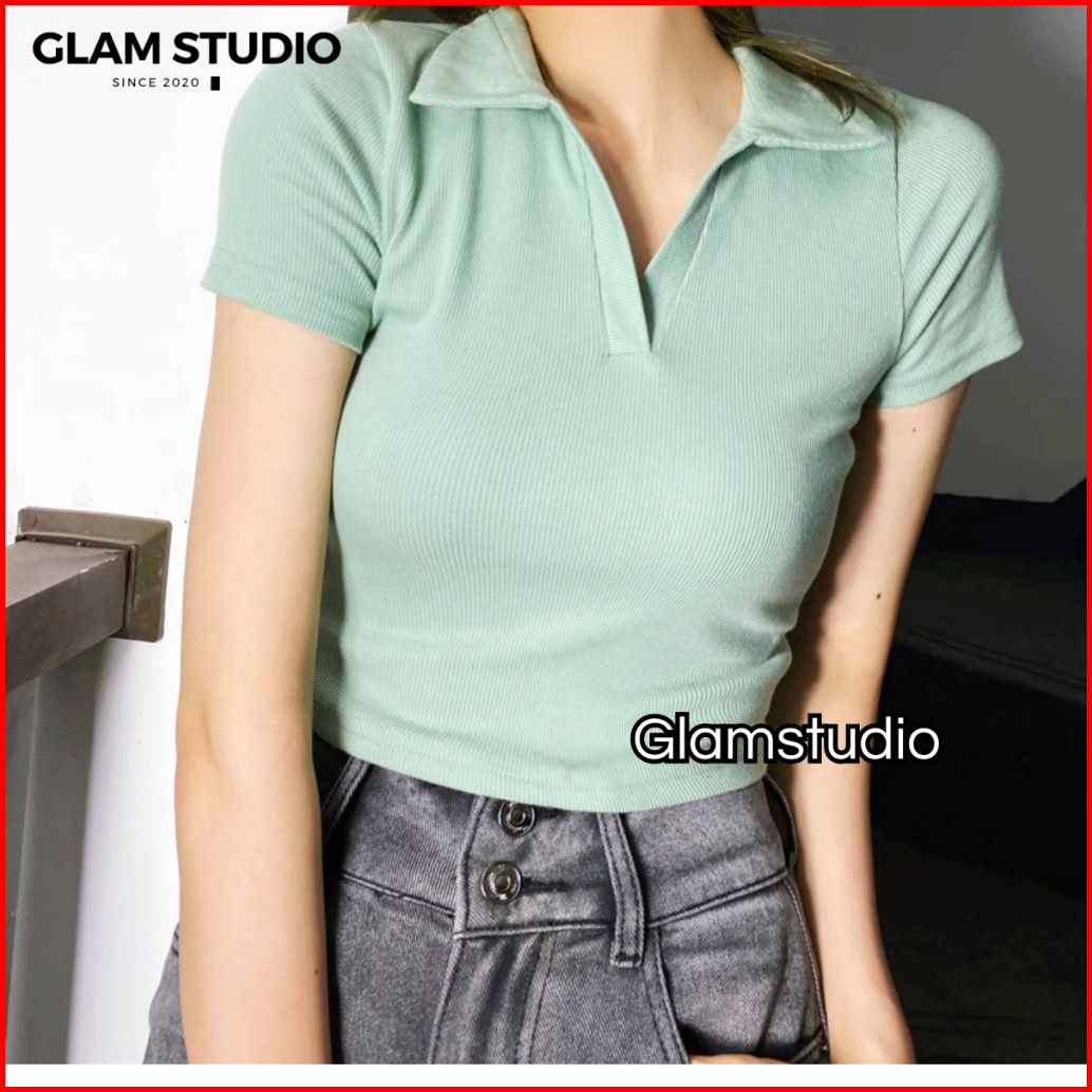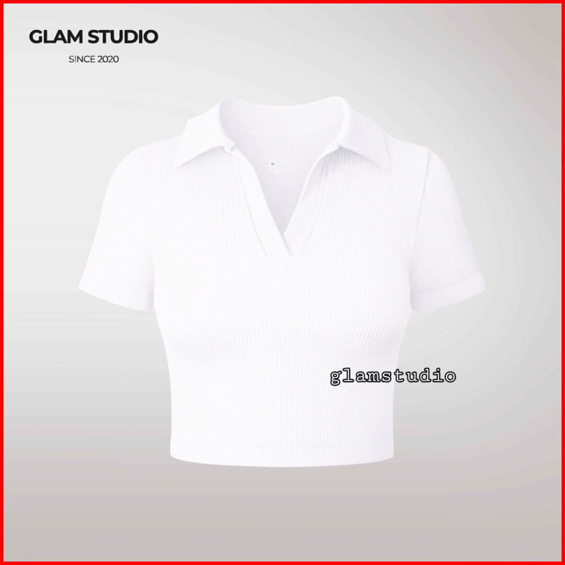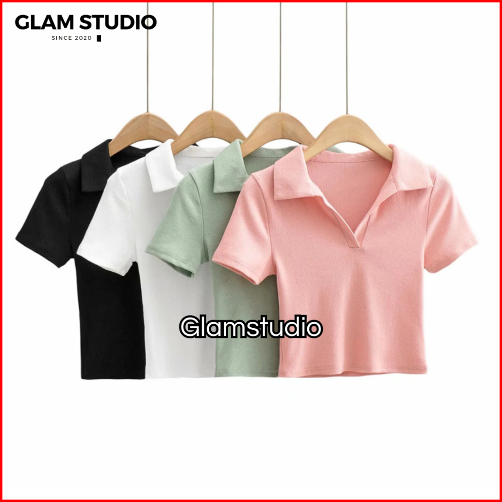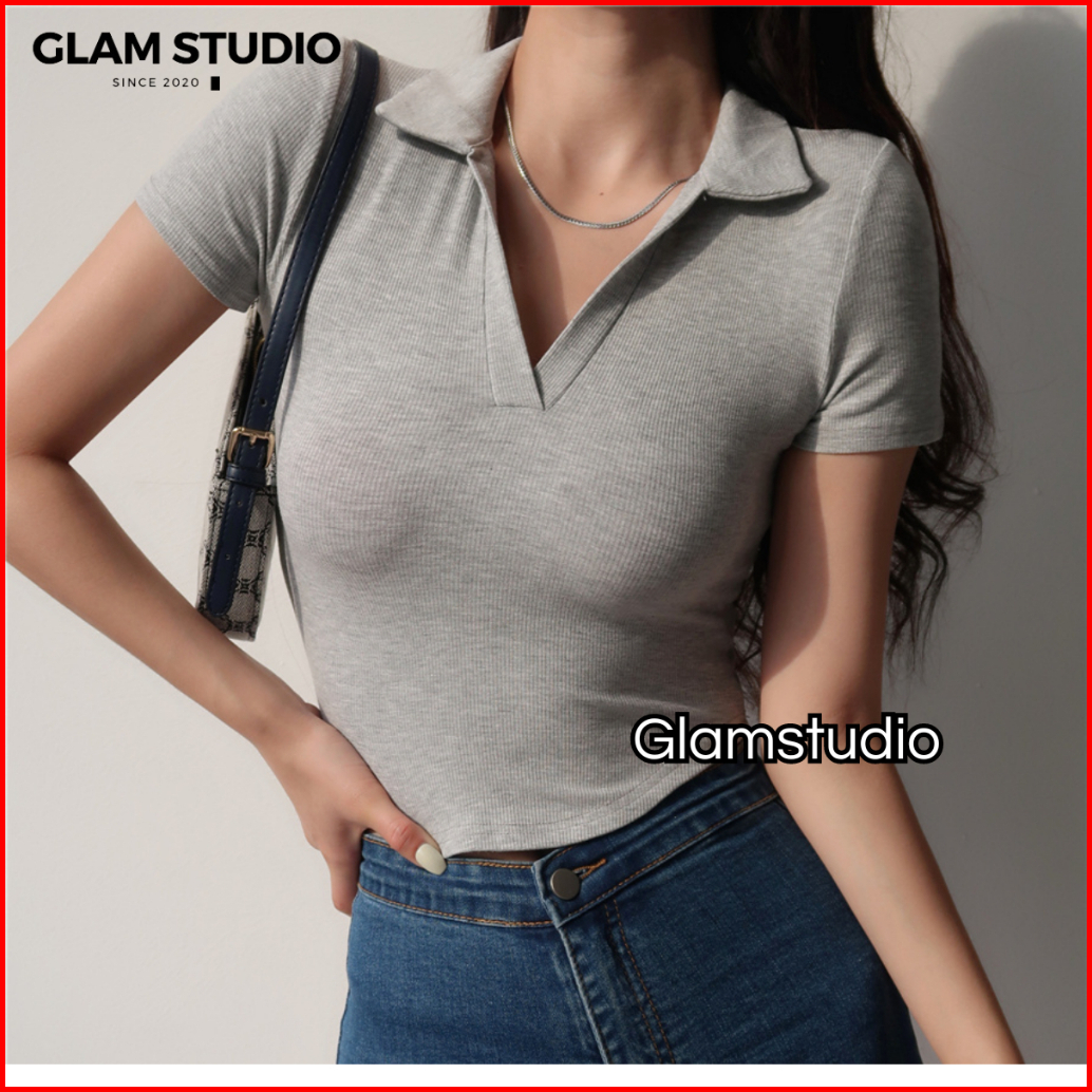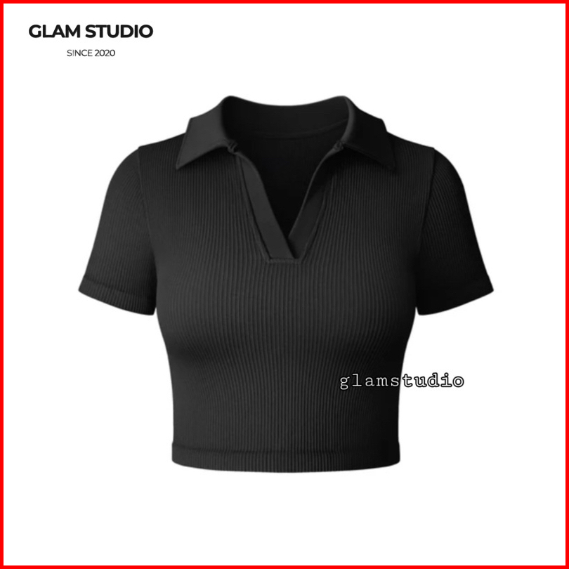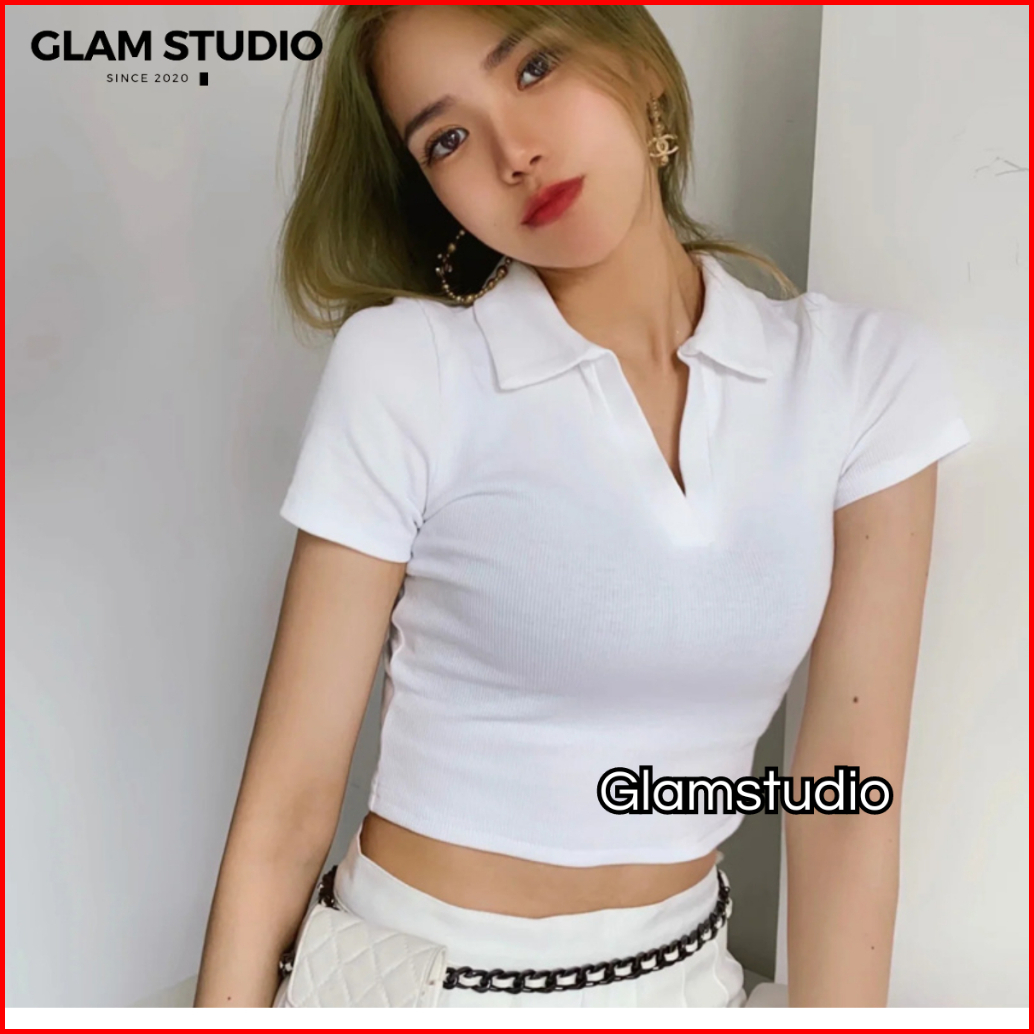 Glamstudio - Kaos Crop Top Kerah V Crop Tee Korea Leher V Korea Kekinian Ct 008 S M L