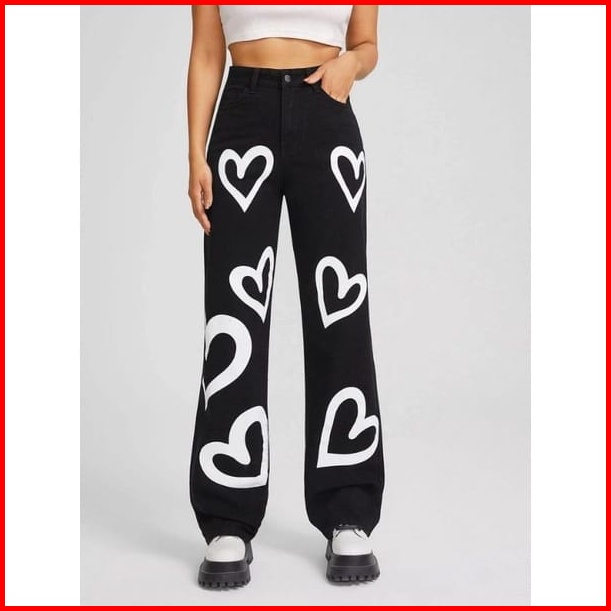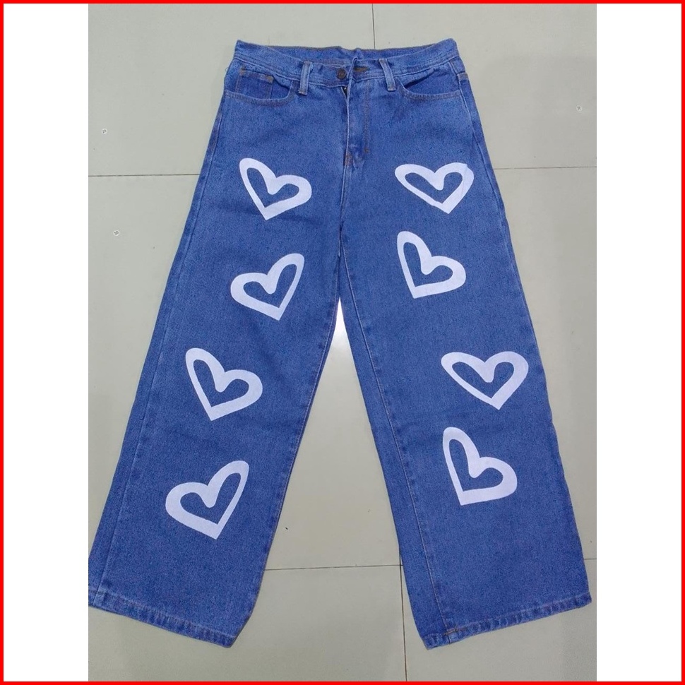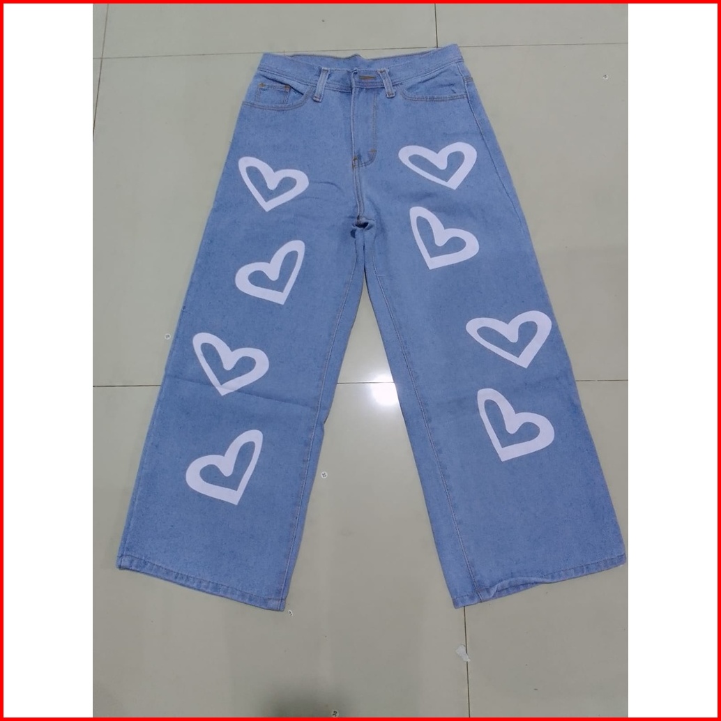 Highwaist Kulot Jeans Wanita Love Sablon Putih Celana Panjang Gaya Korea