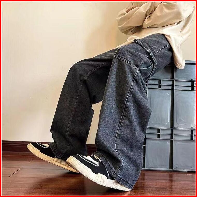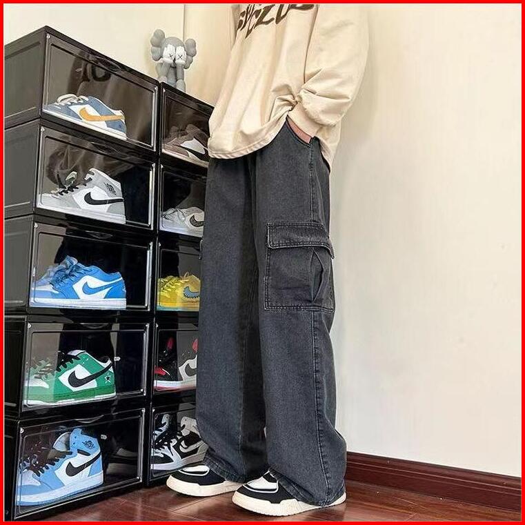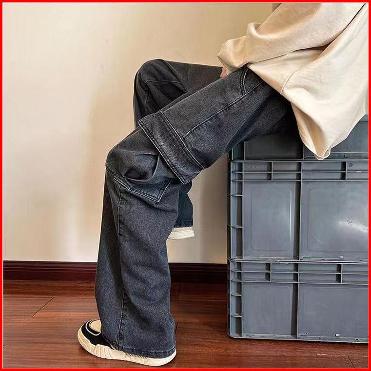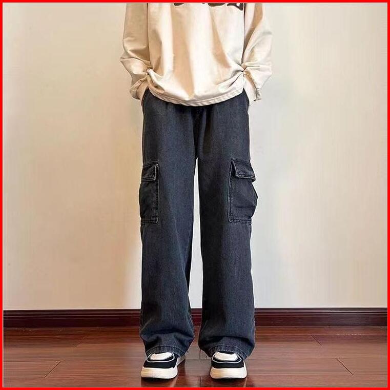 Celana Jeans Pria Cargo Panjang Abu Straight Baggy Dewasa Cowok Oversize Casual Denim Pants Korean Style