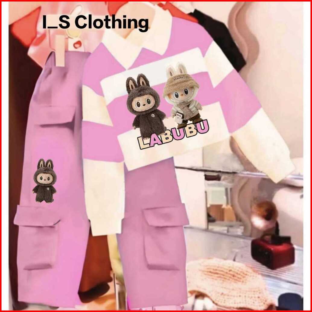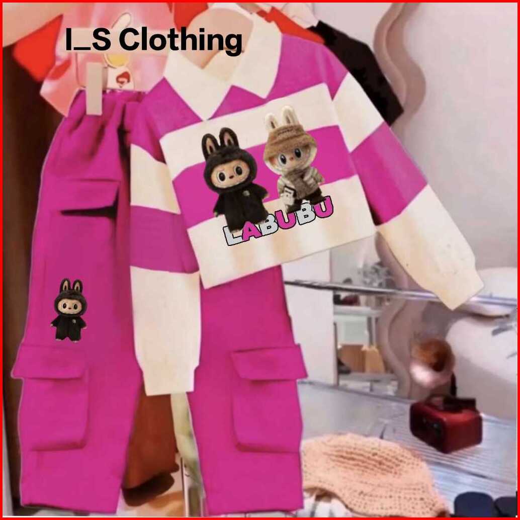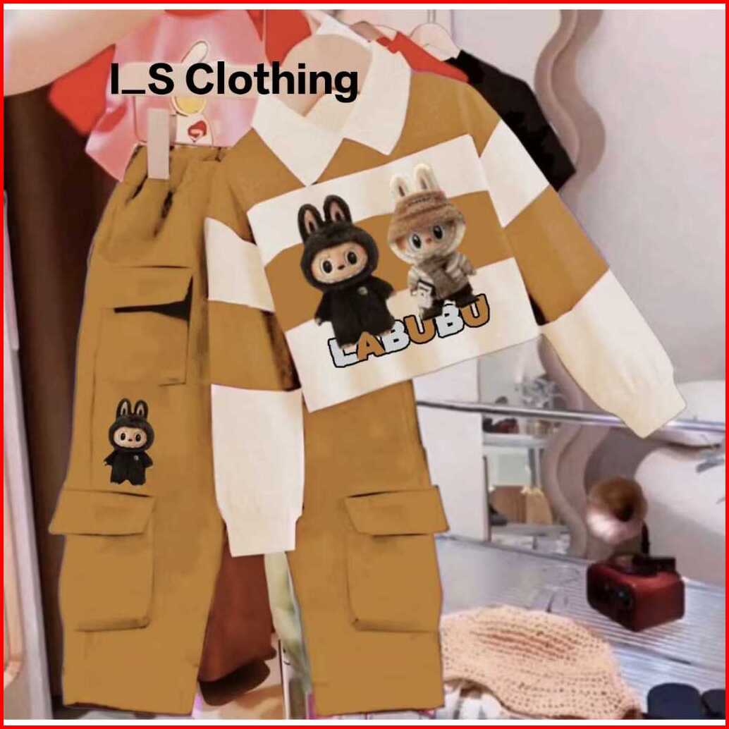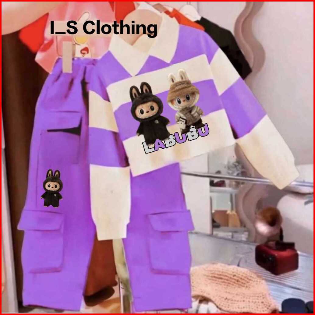 Set Baju Anak Perempuan Setelan Sweater Kerah Croptop Strip Kargo Viral Baju Dan Celana Panjnag