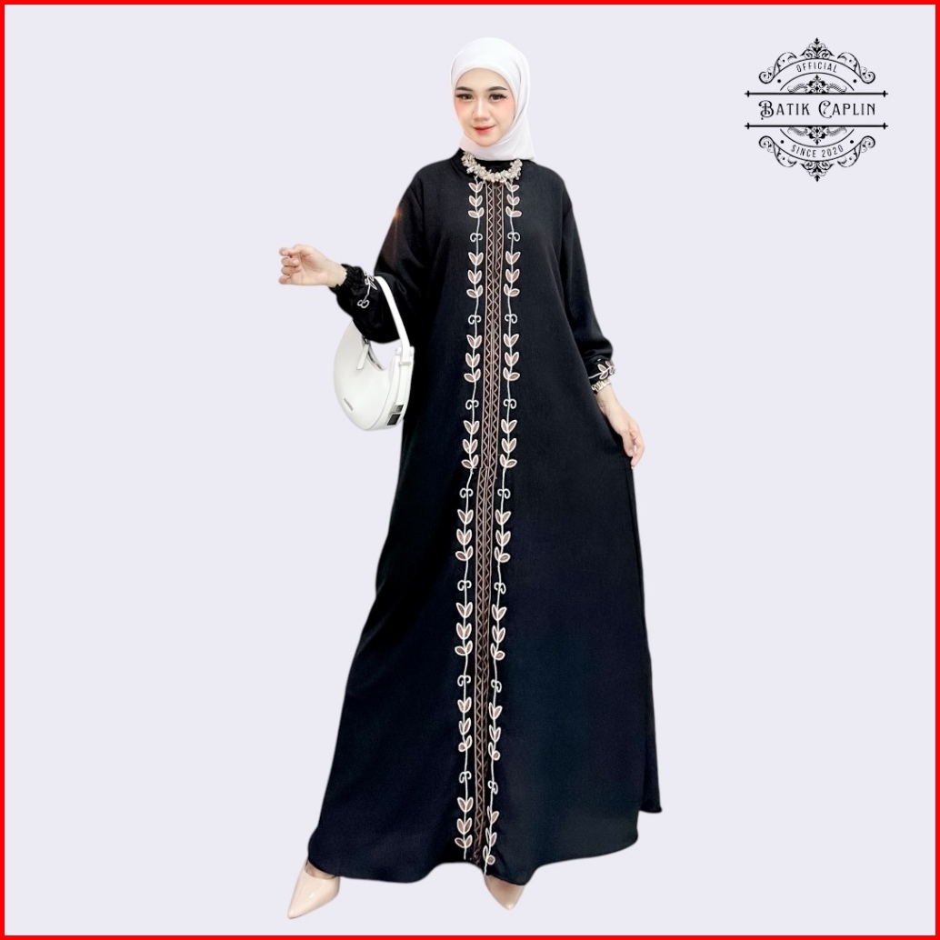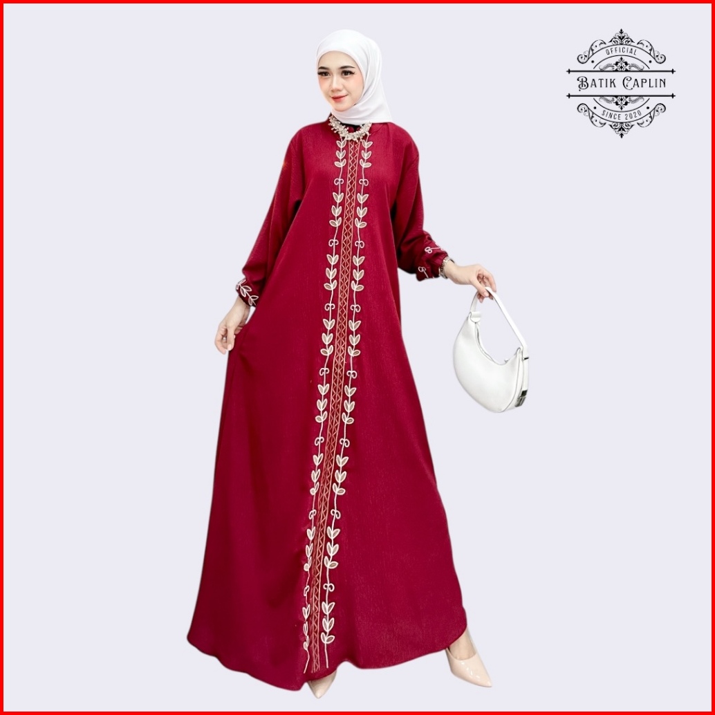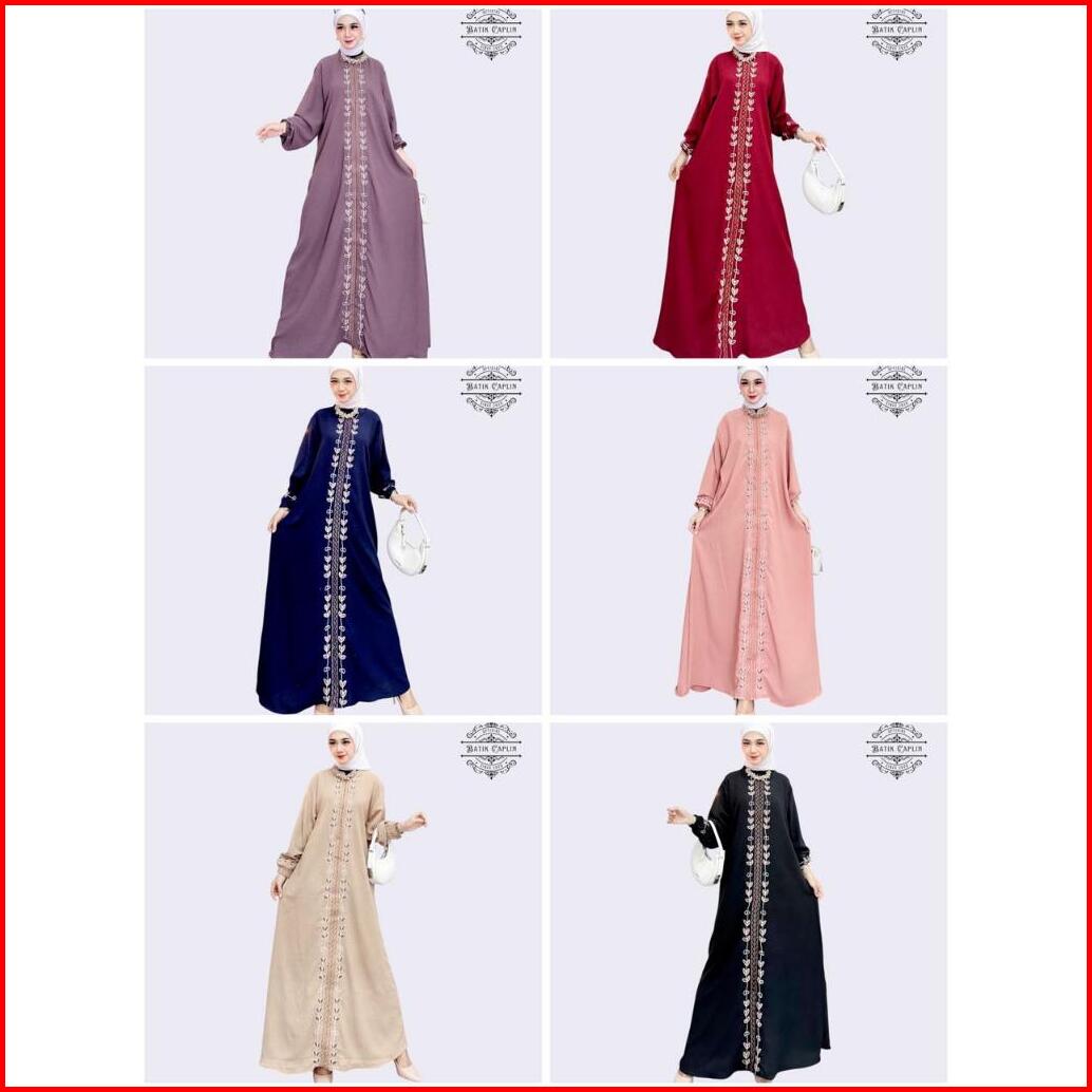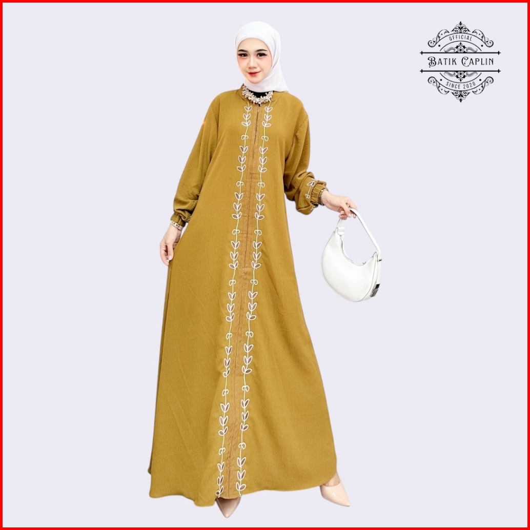 Batik Caplin - Gamis Bordir Crinkle Amecca Lebaran Busui Resleting Lengan Karet