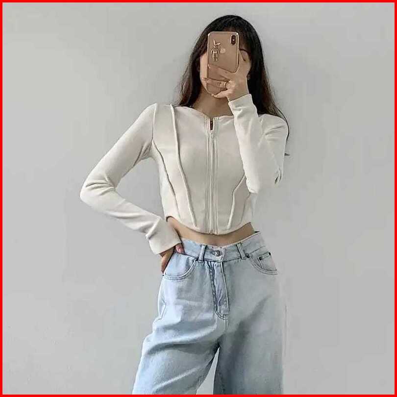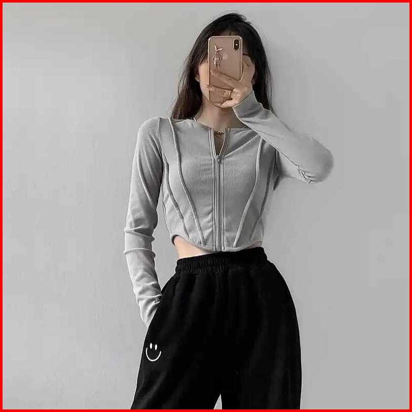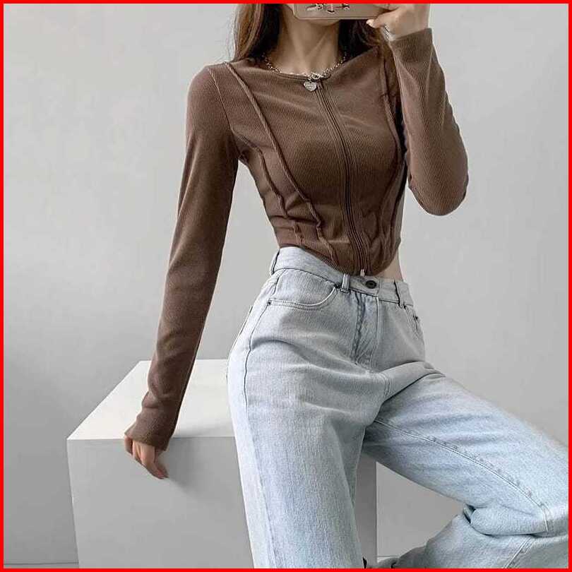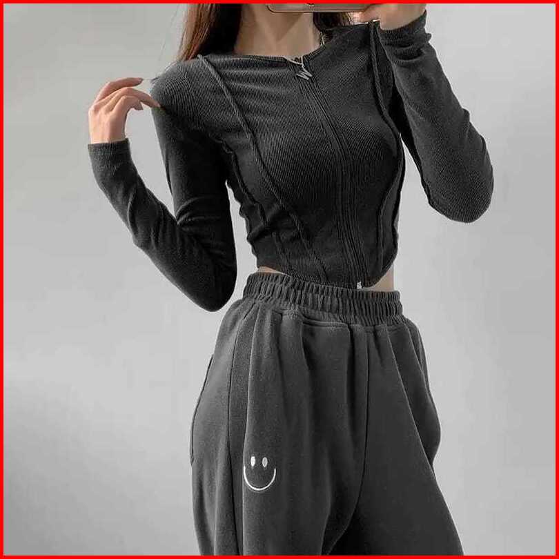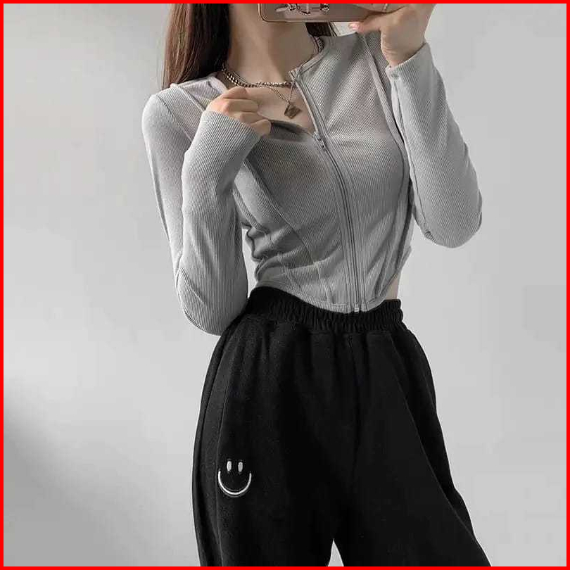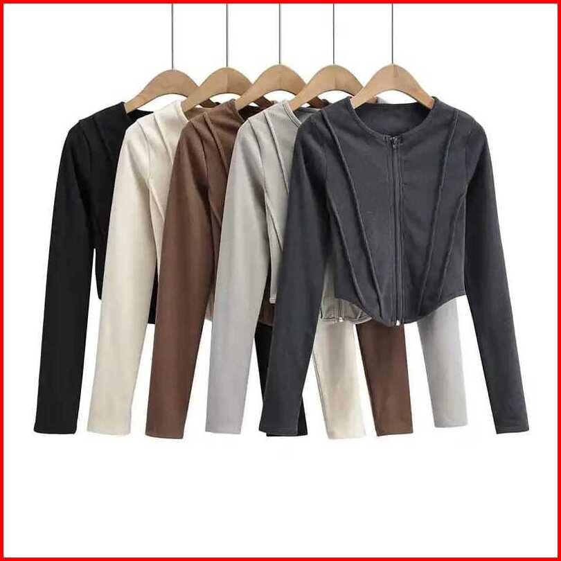 Sweater Wanita Coluna Zipper Crop Top Rib Basic