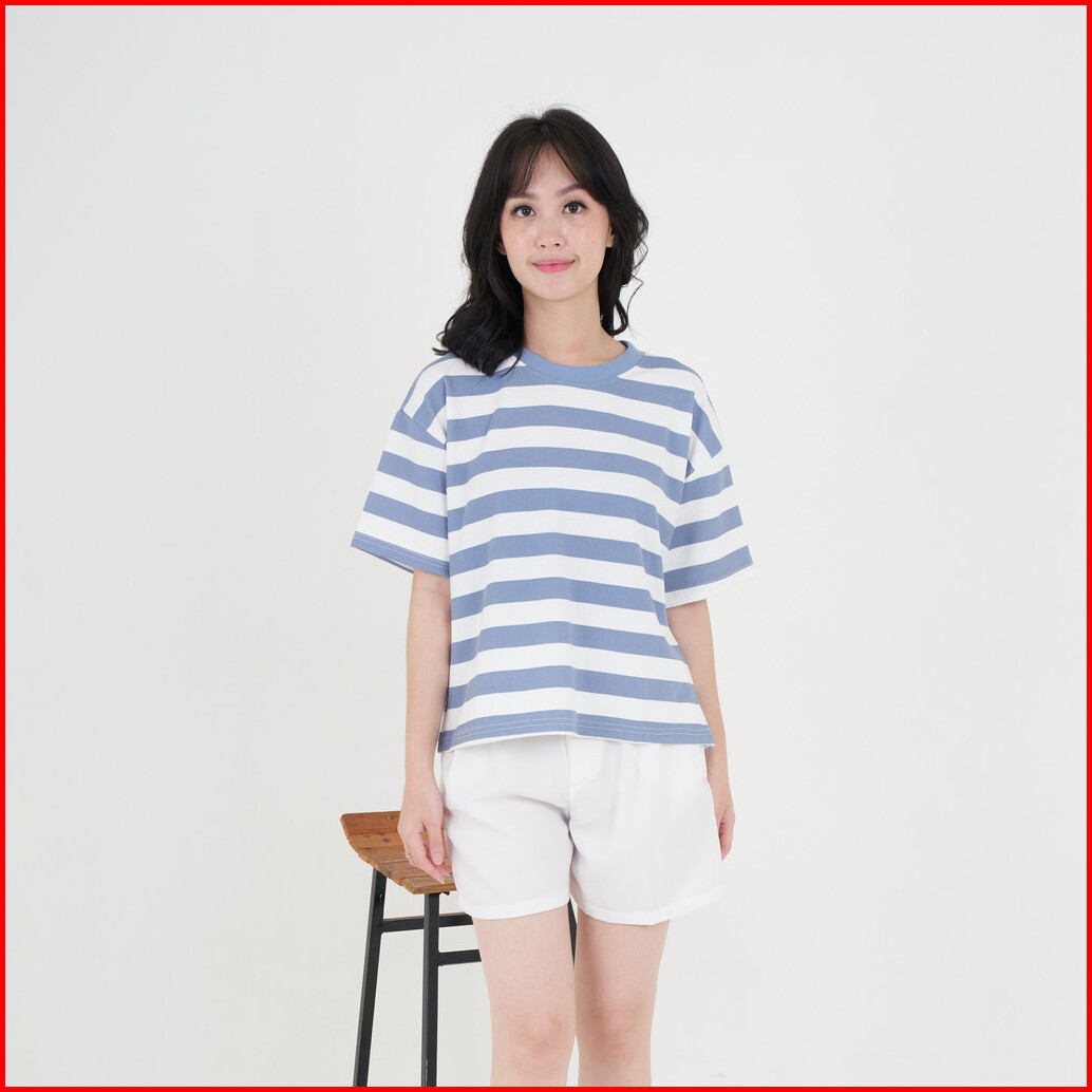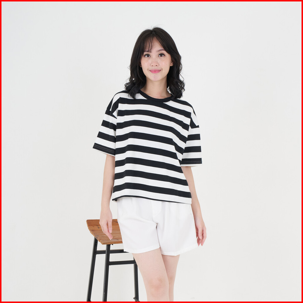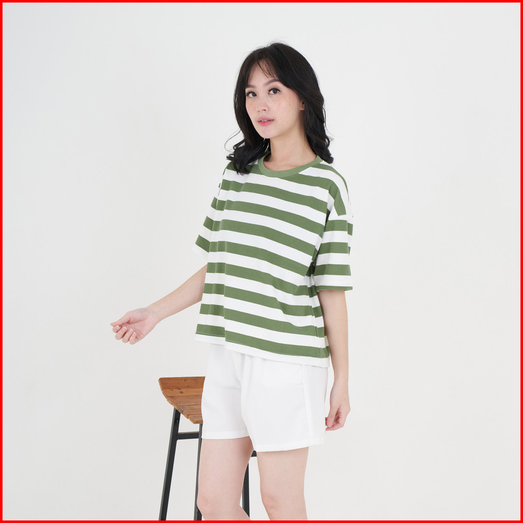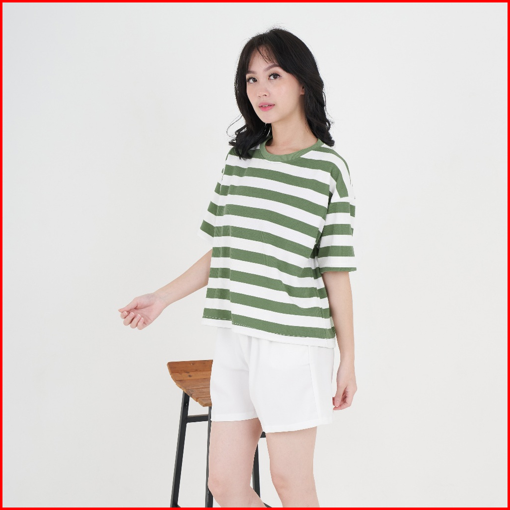 Queentin Kaos Wanita Casual 0623 Stretch Caramel Knit Motif Salur Lengan Pendek
