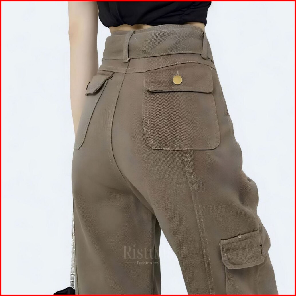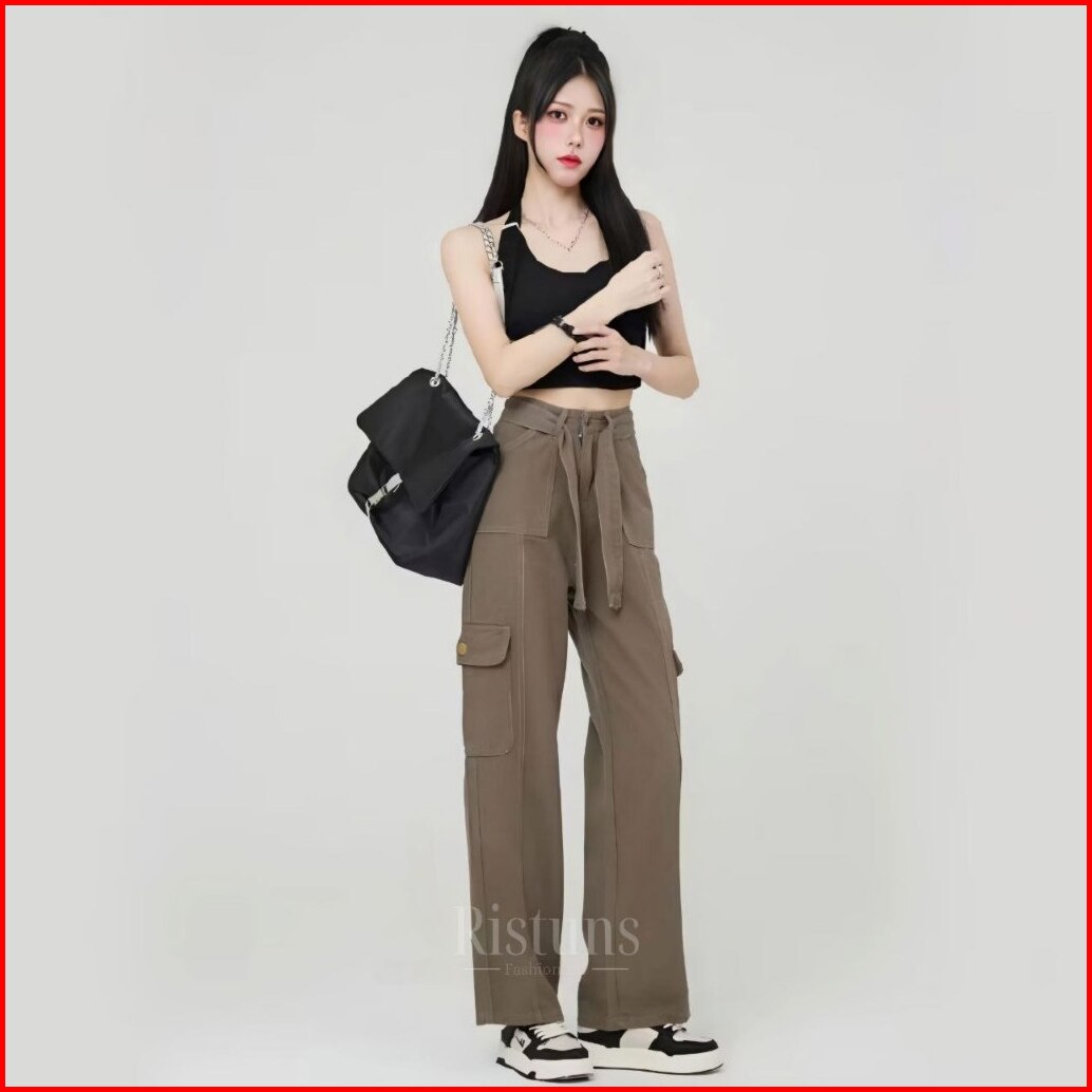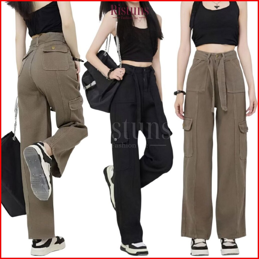 Celana Cargo Jeans Cewek Highwaist Model Gesper Streetwear Trendy