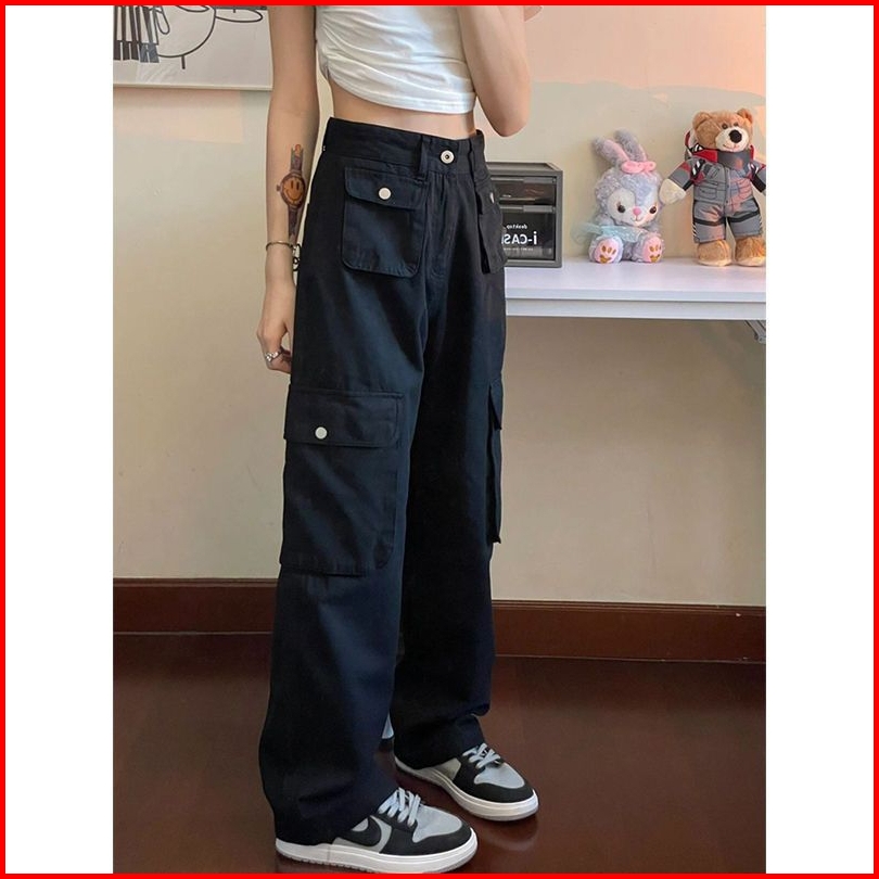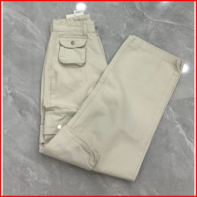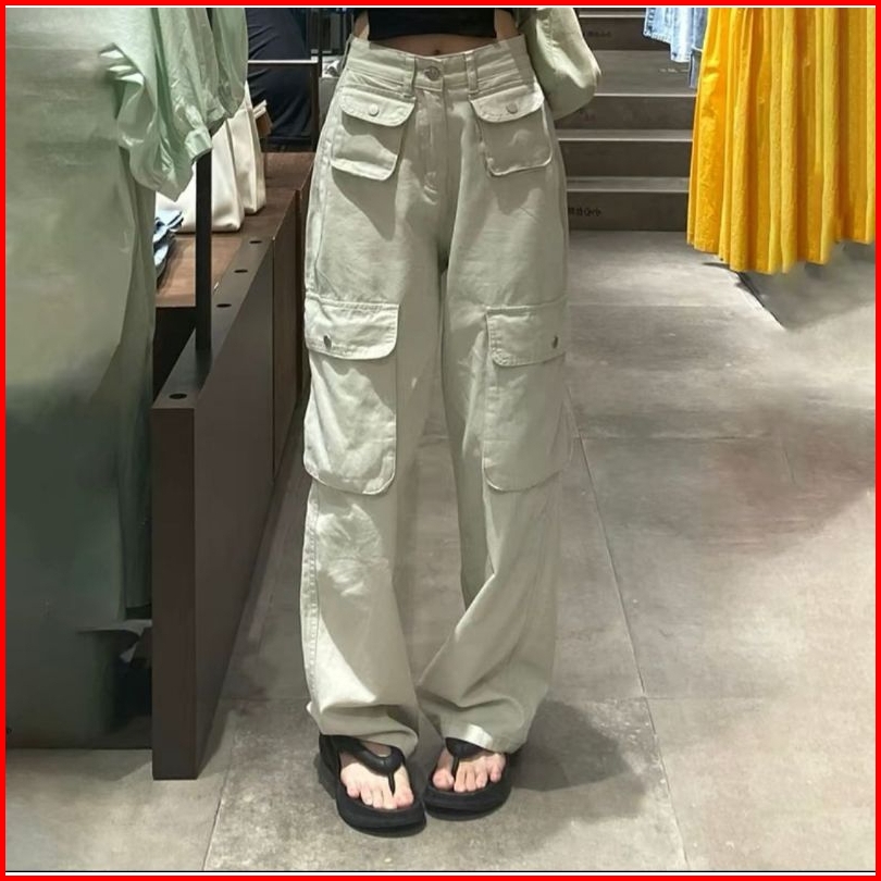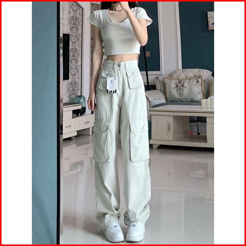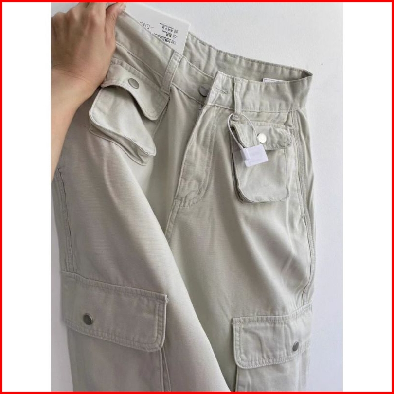 Jeans - Cargo Denim Pasir Putih Highwaist Loose Celana Jeans Wanita Korea Realpict
