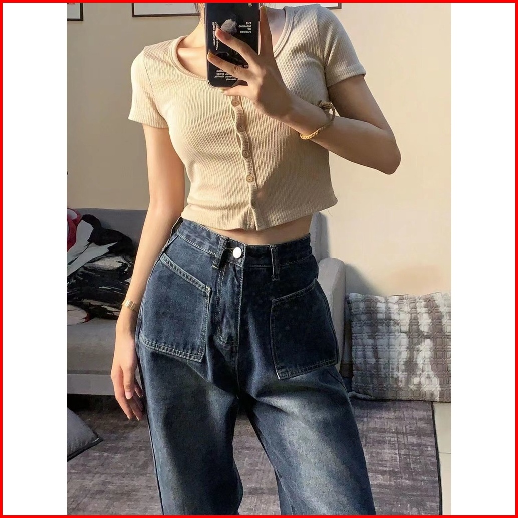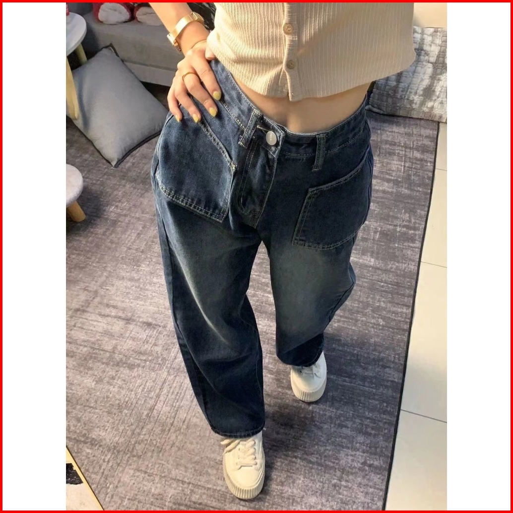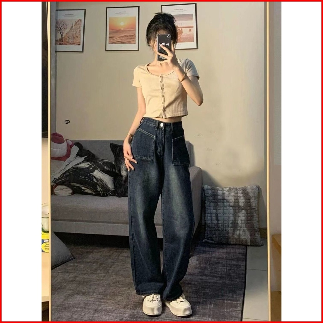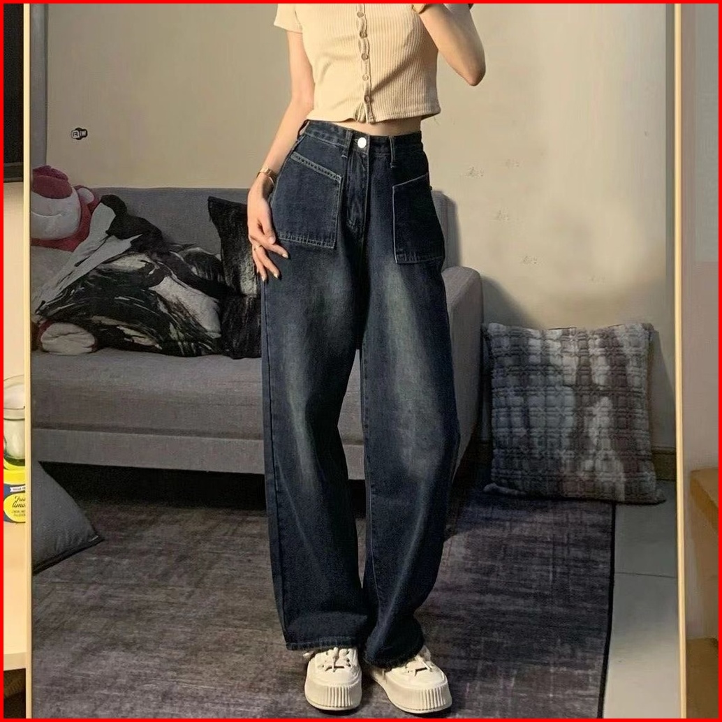 Straight Loose Kulot Denim Celana Jeans Highwaist Biru Retro Korean Style Wanita