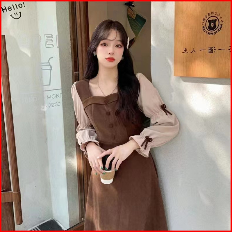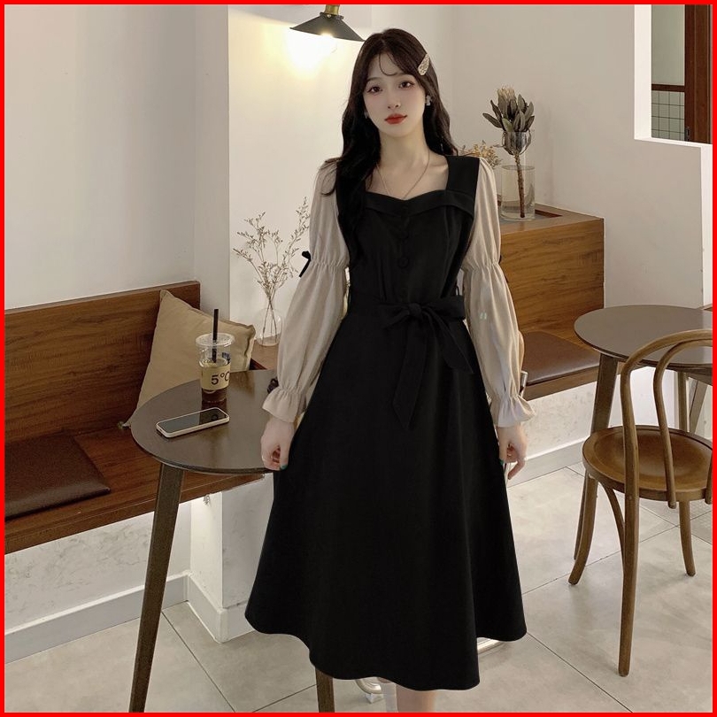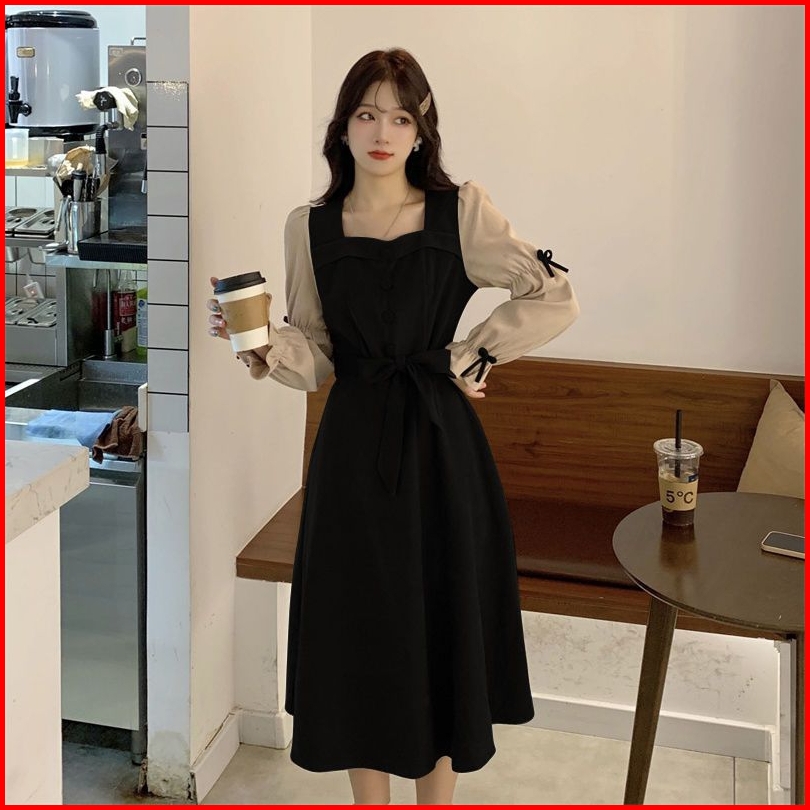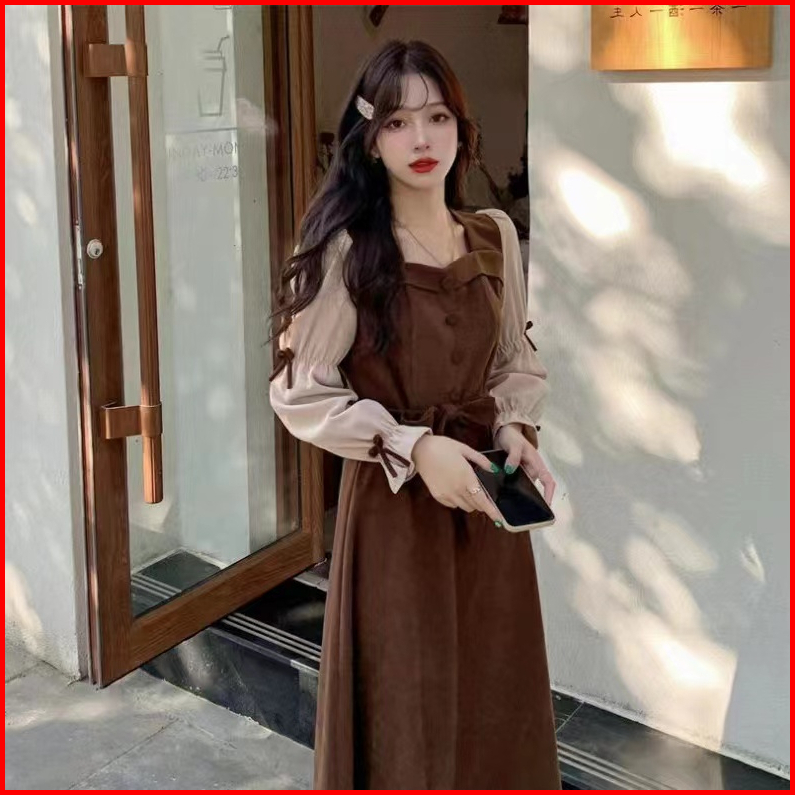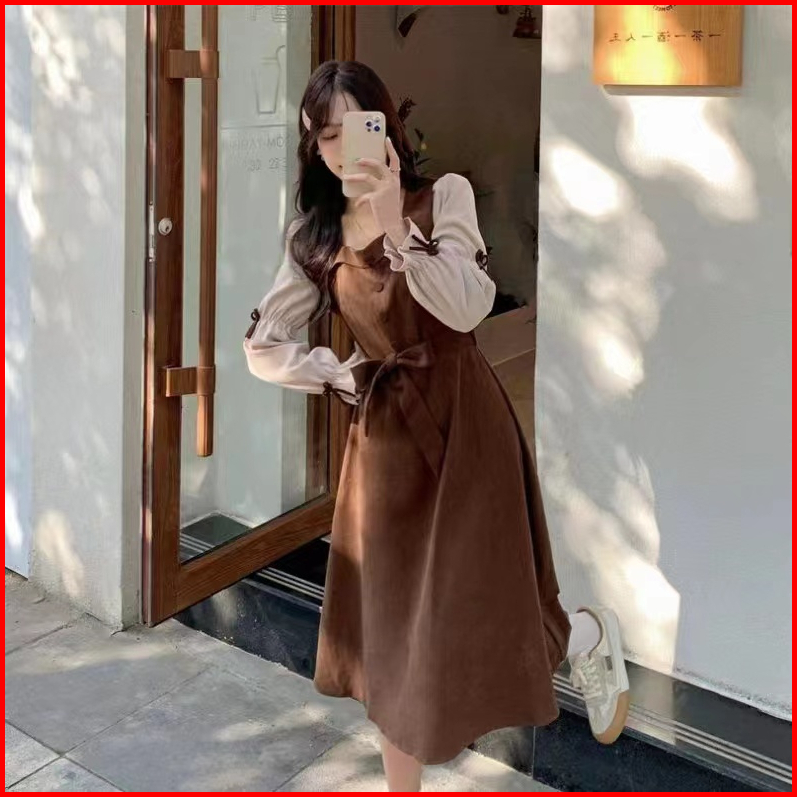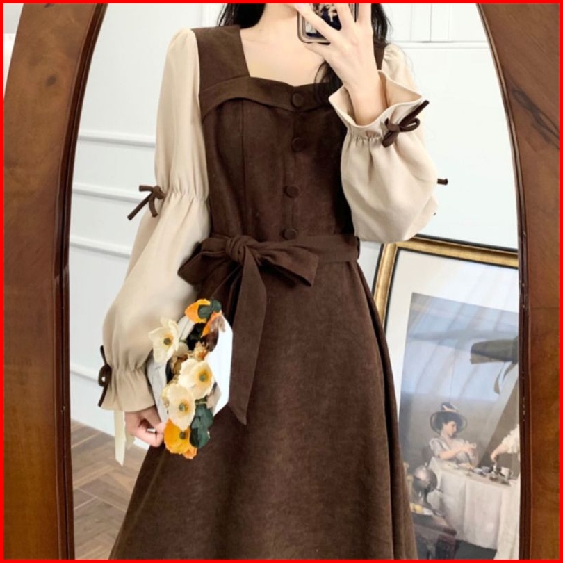 Midi Dress Nilon Retro Kasual Wanita Pinggang Belt