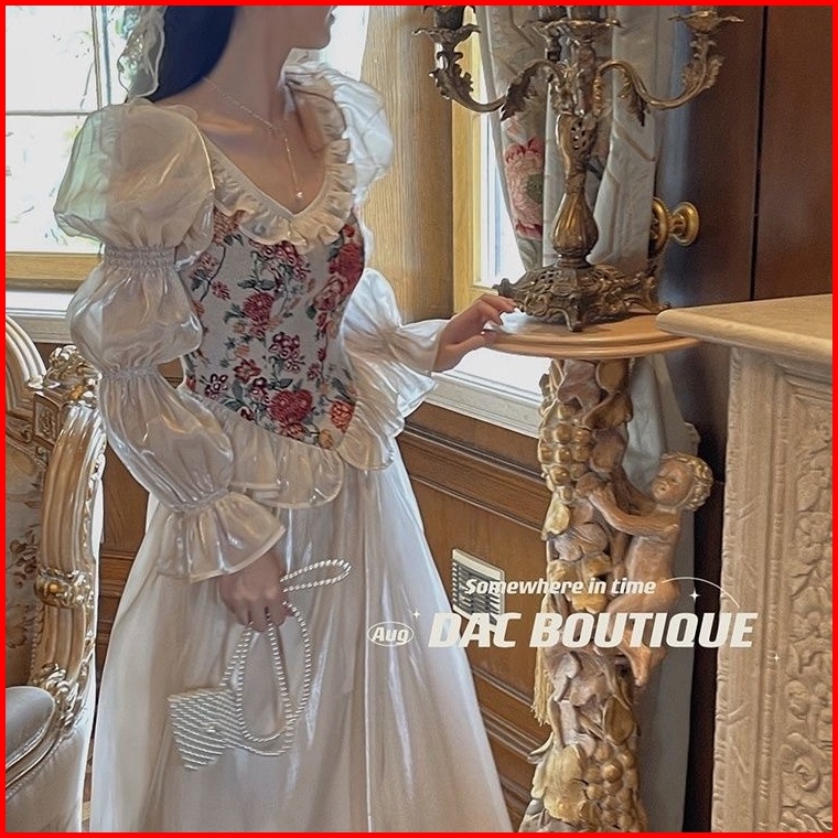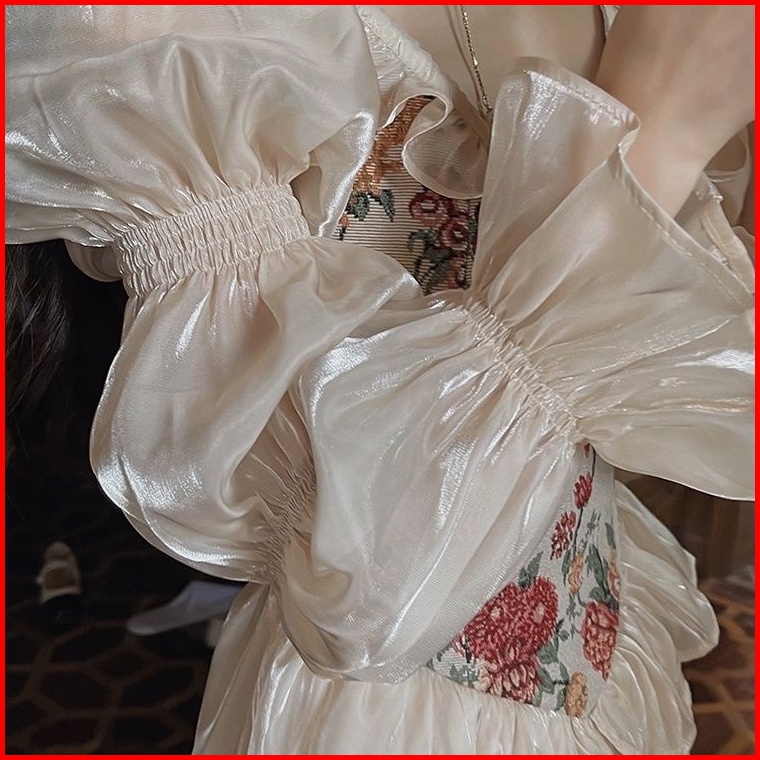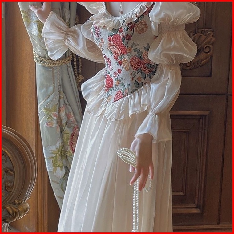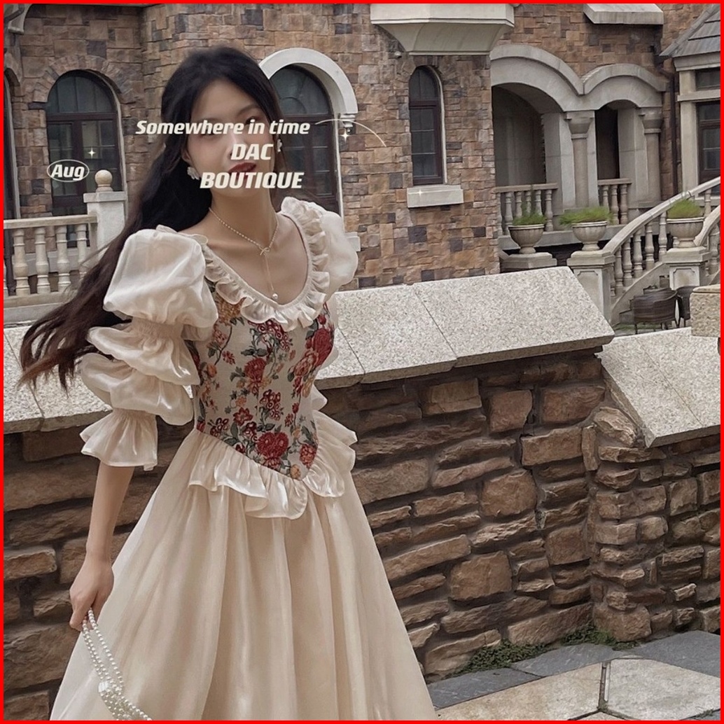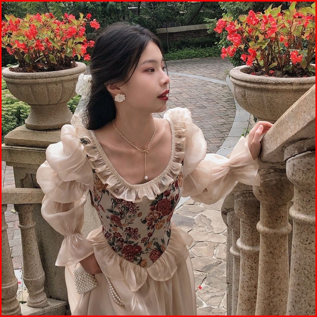Dress Casual Wanita Dress Musim Semi Baru Retro Gaya Leher Bulat Gelembung Lengan Organza Ddrress Vintage M562