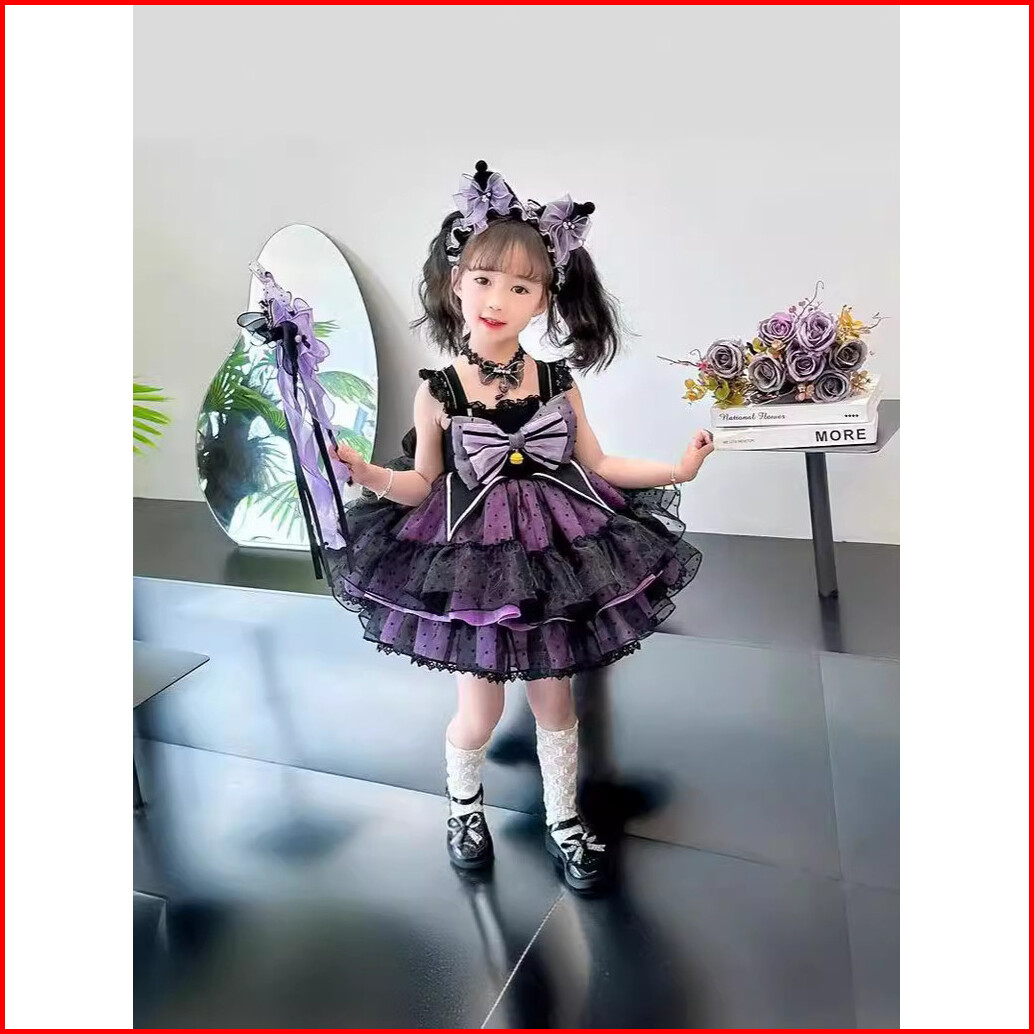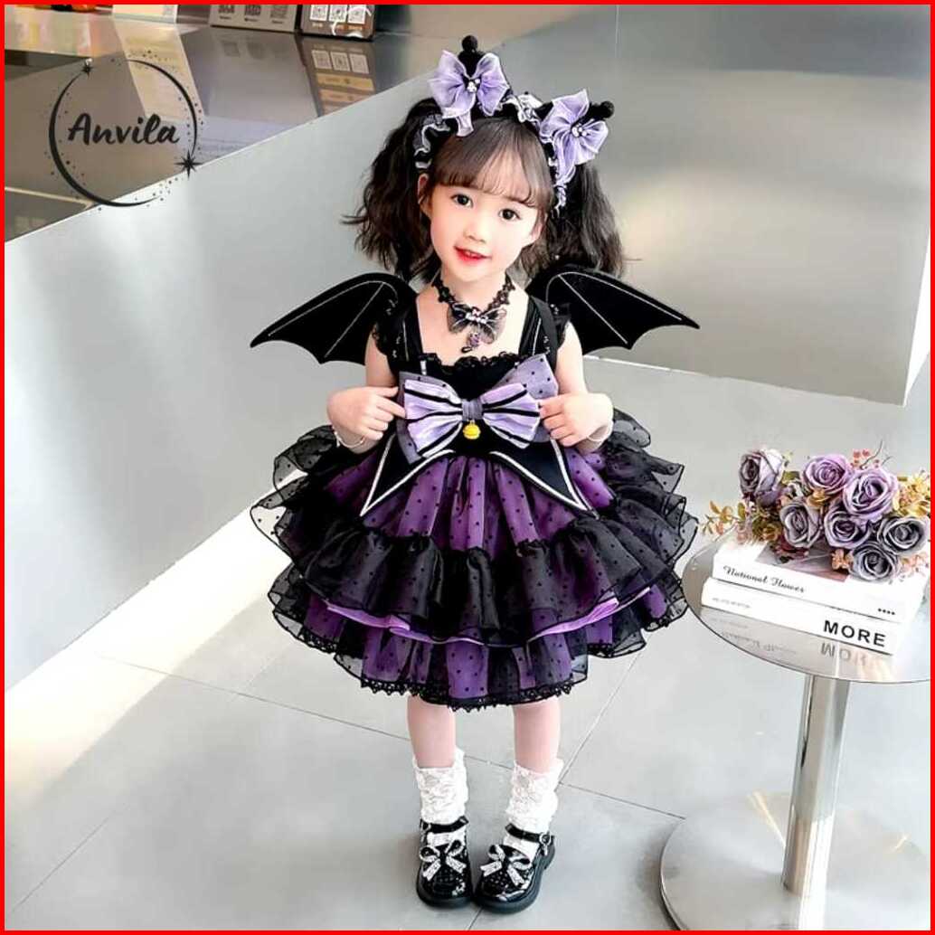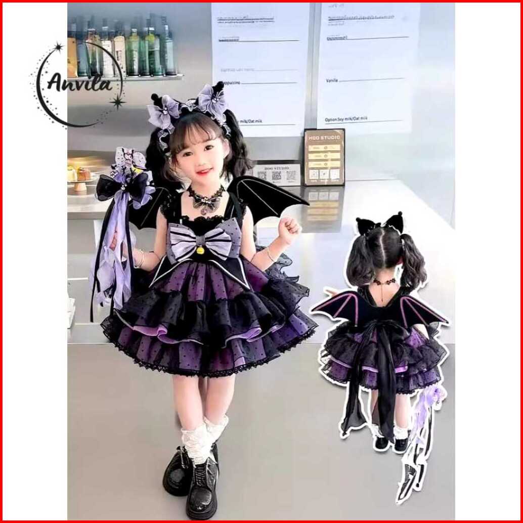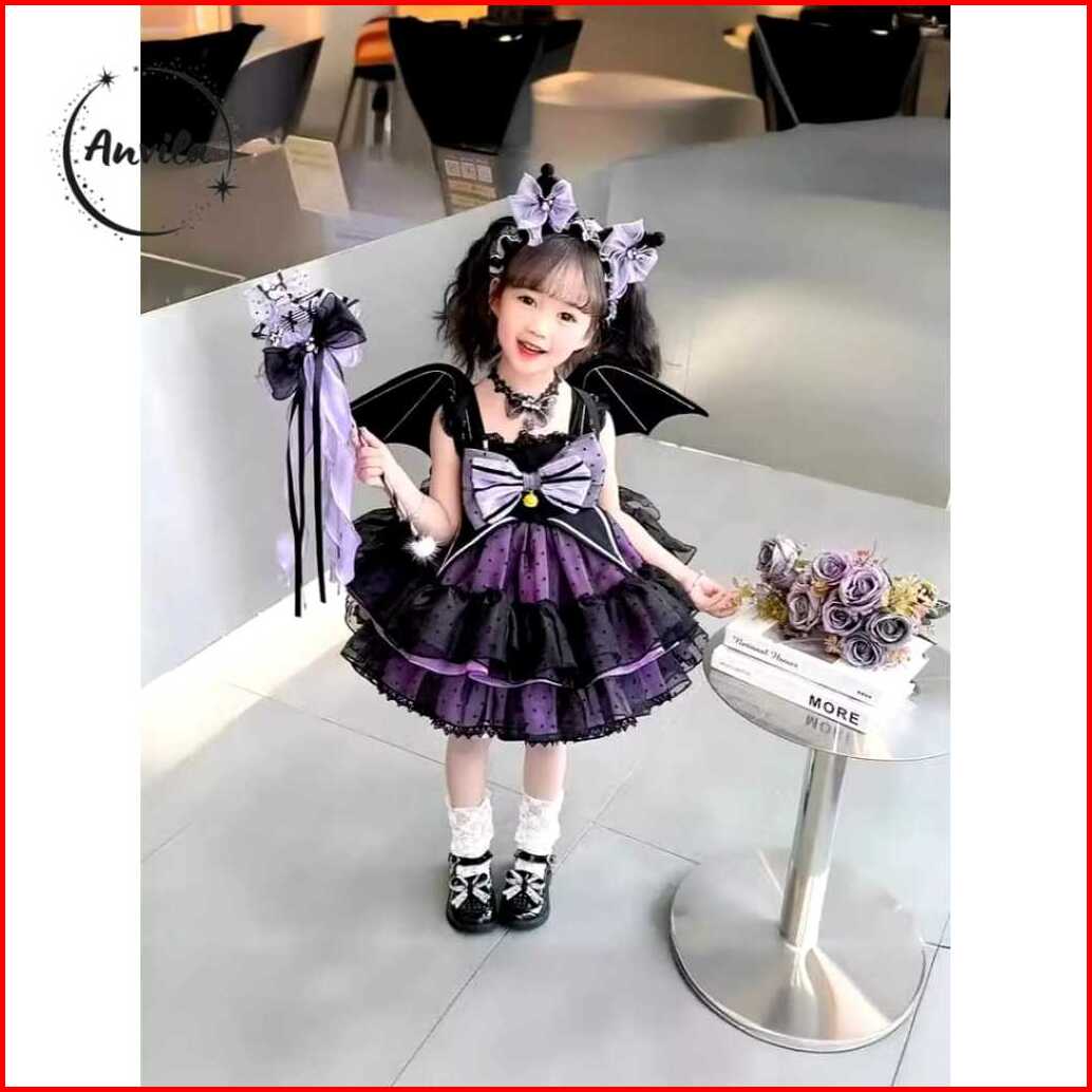 Dress Atau Gaun Anak Perempuan Import Kuromi Karakter Haloween Sayap Pita Dada Cute