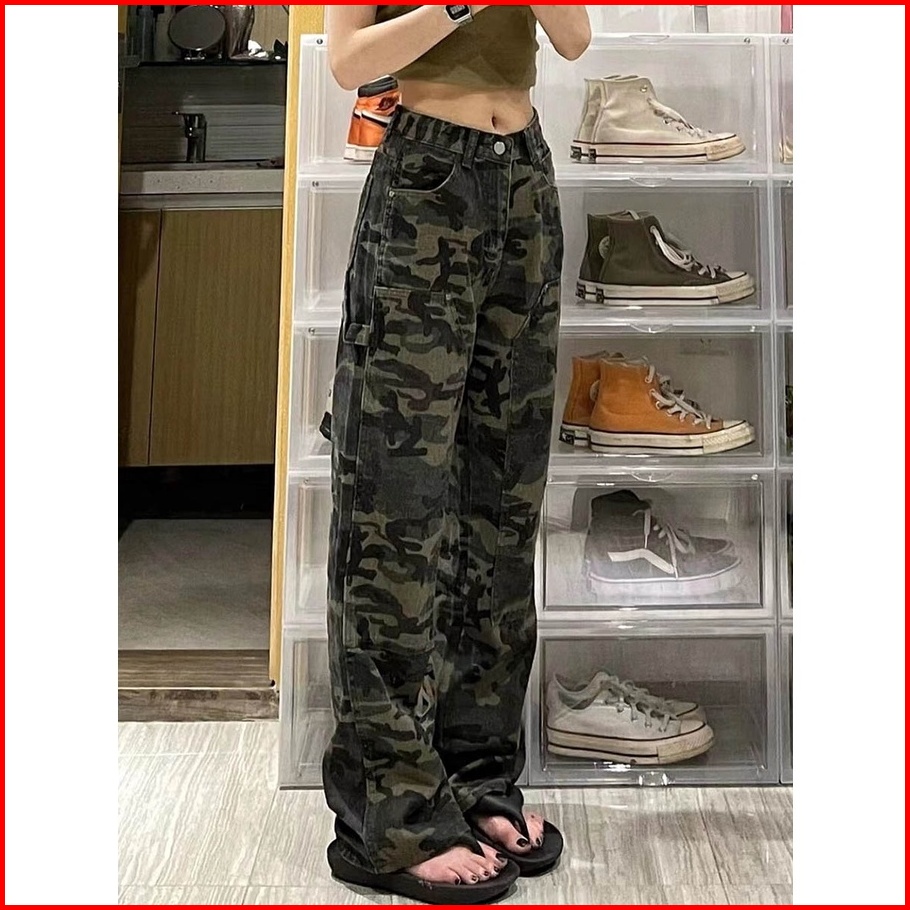 Celana Jeans Cargo Kamuflase Wanita Celana Lurus Longgar Berpinggang Tinggi Celana Kulot Wanita