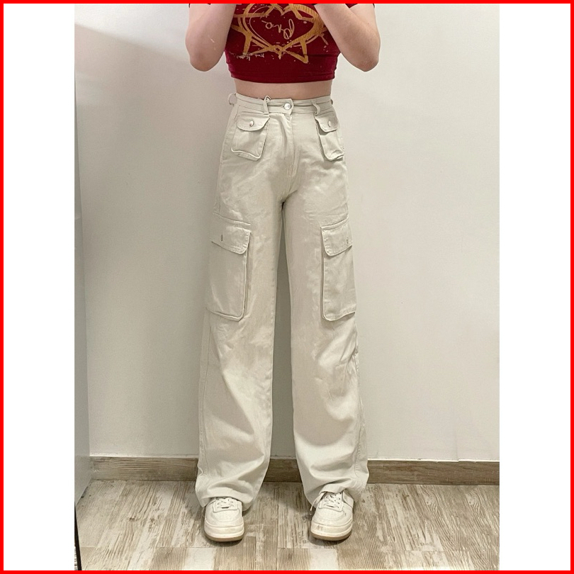 Maweth Cargo Denim Pasir Putih Highwaist Loose Celana Jeans Wanita Korea Cargo Jeans