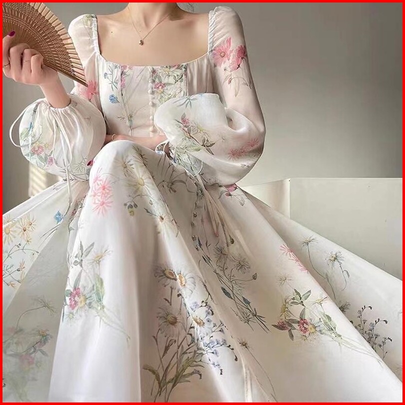 Putih Dress Fairy Floral Dress Kondangan Dress Putih Retro Vintage Dress Elegan Lengan Panjang Dress Putih Pantai Kebaya