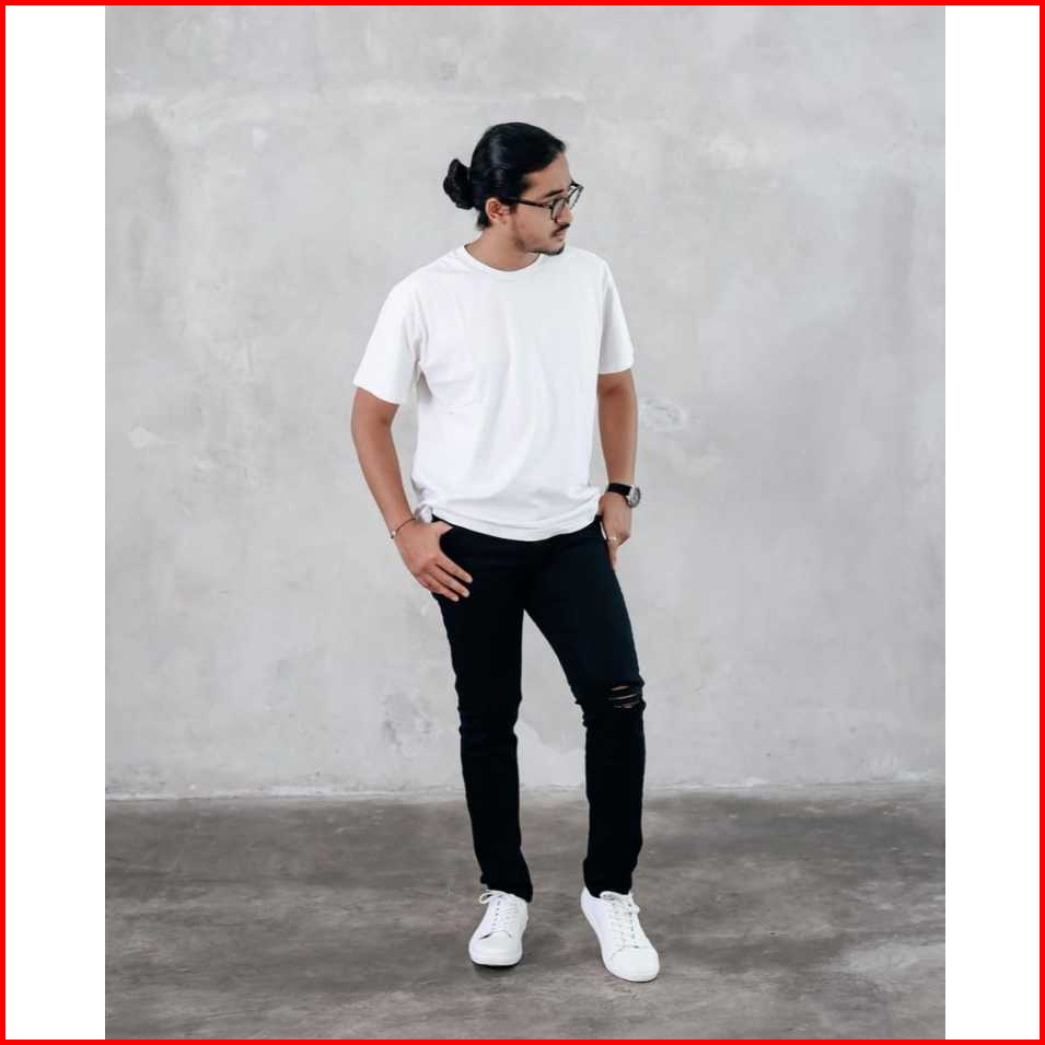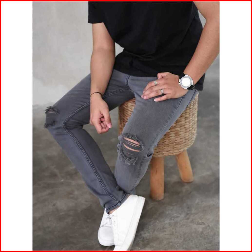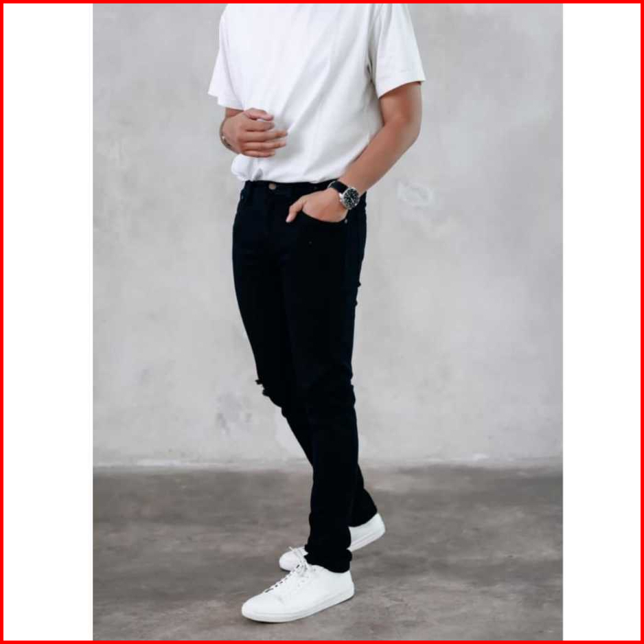 Celana Jeans Sobek Lutut Pria Panjang Robek Ripped Slimfit Melar Hitam 28-38