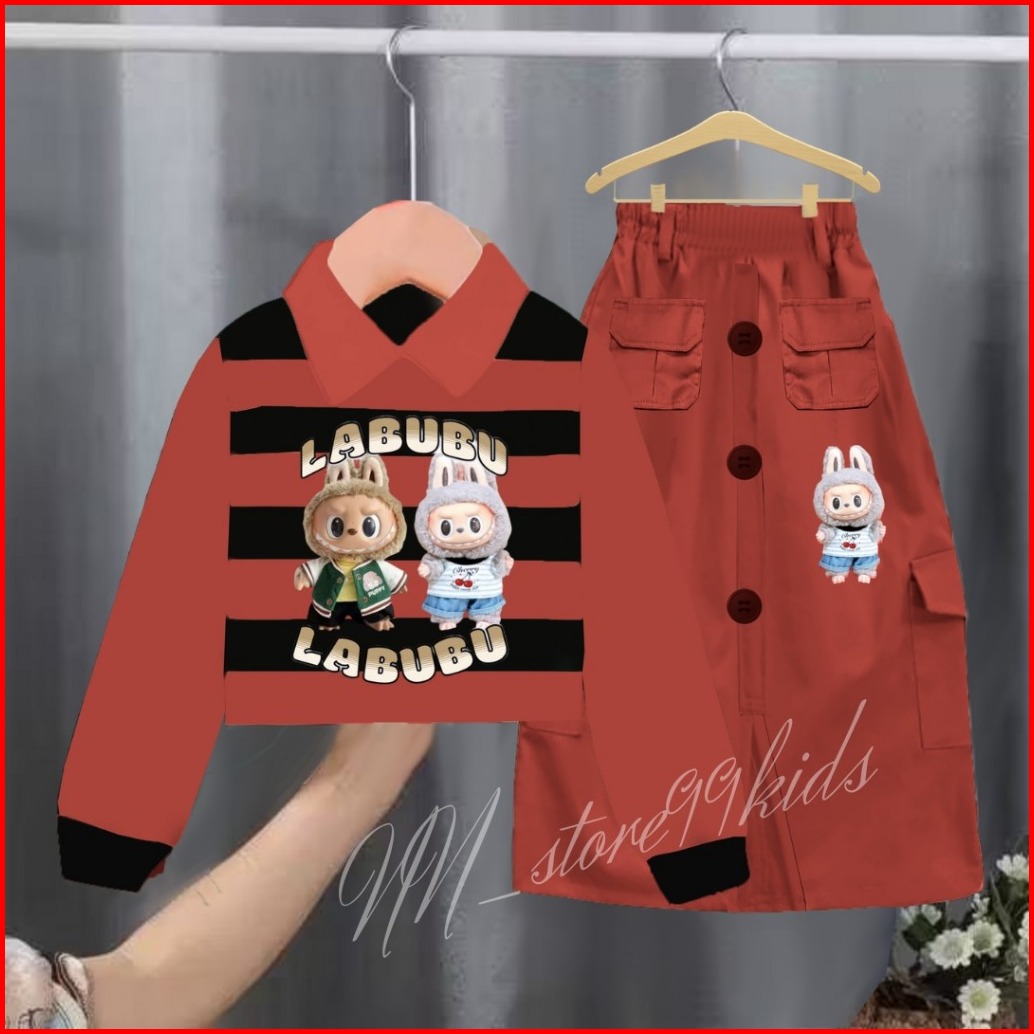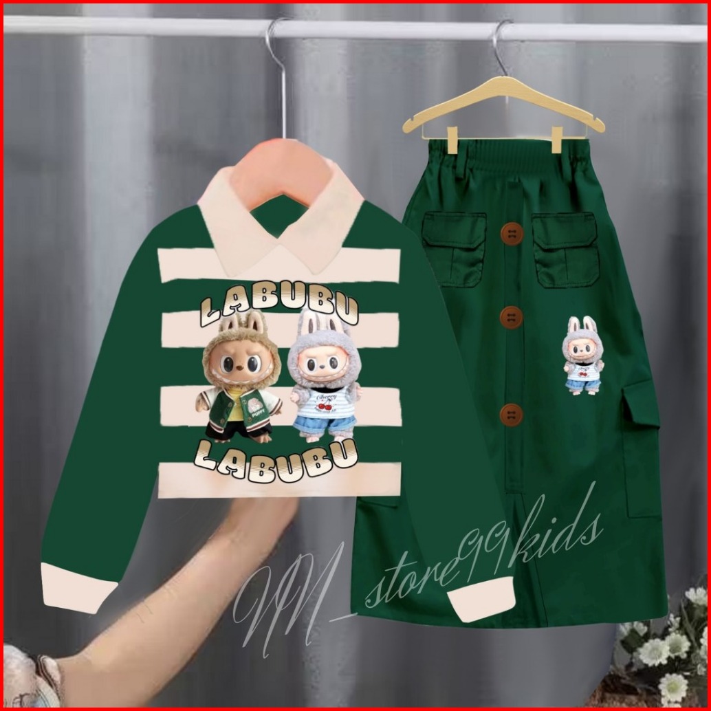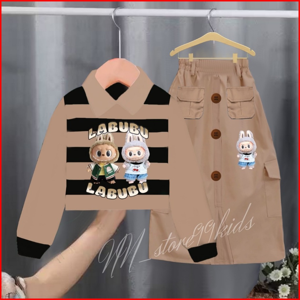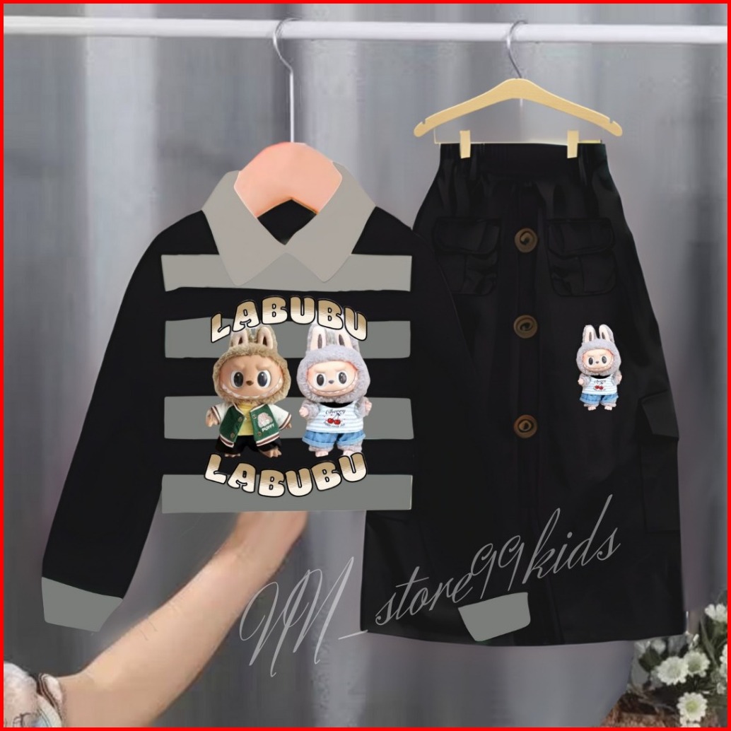 Setelan Sweater Rok Kargo Anak Peremuan Motif Labubu Baju Anak Salur Rok Kargo 2-12 Tahun