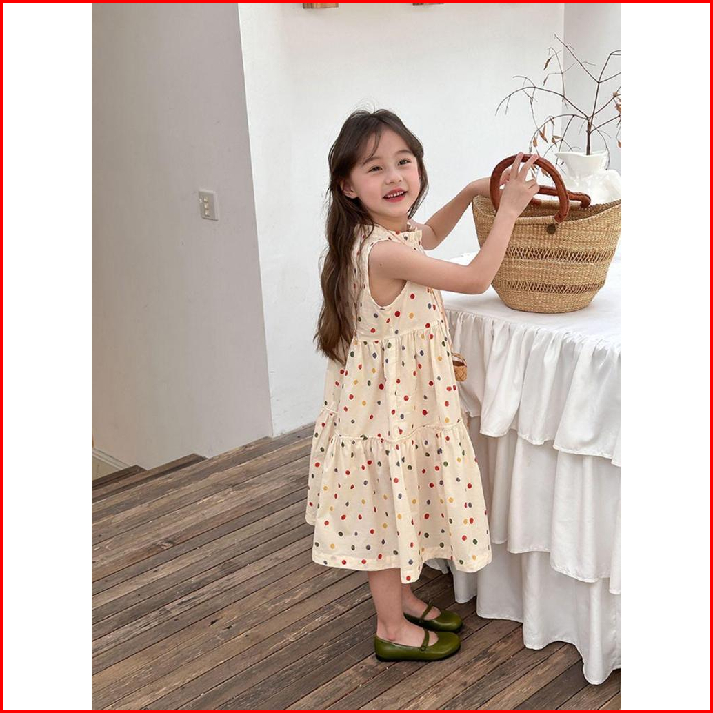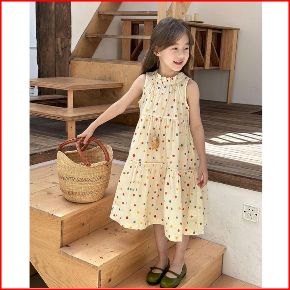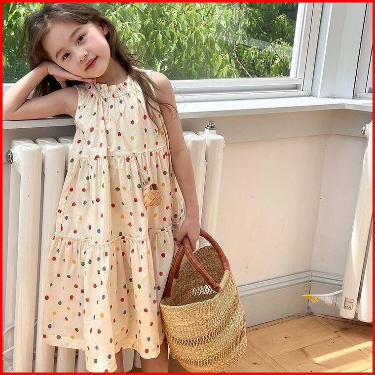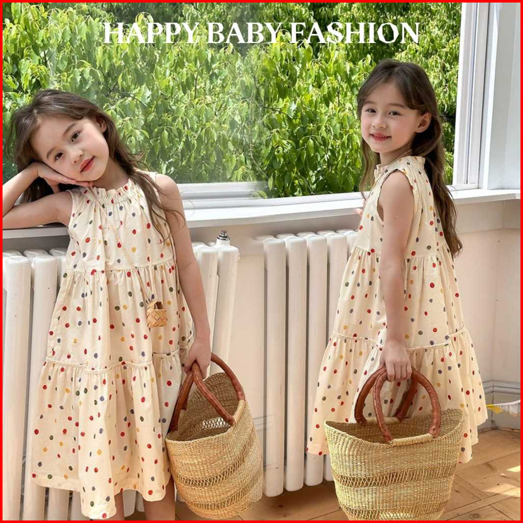 Happy Baby 3-10tahun Dress Anak Perempuan Tanpa Lengan Motif Cream Polkadot Bahan Cotton Adem Import Qz-175
