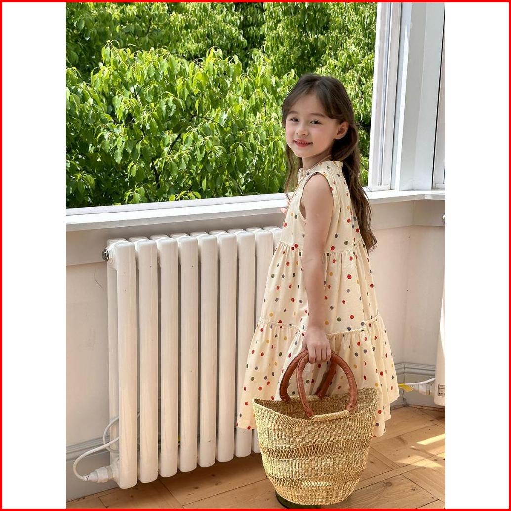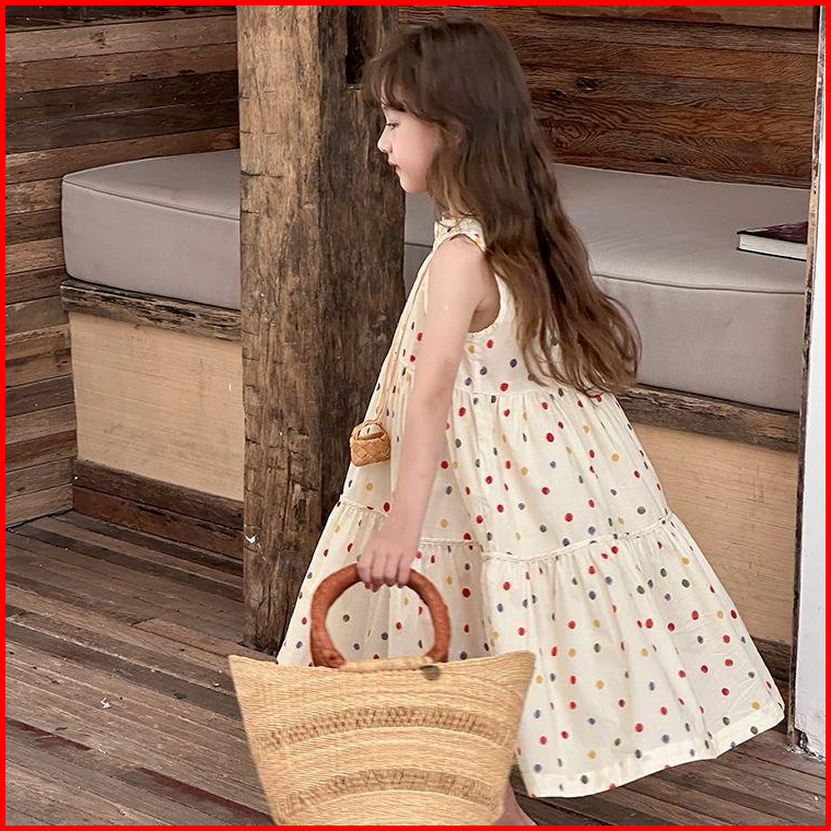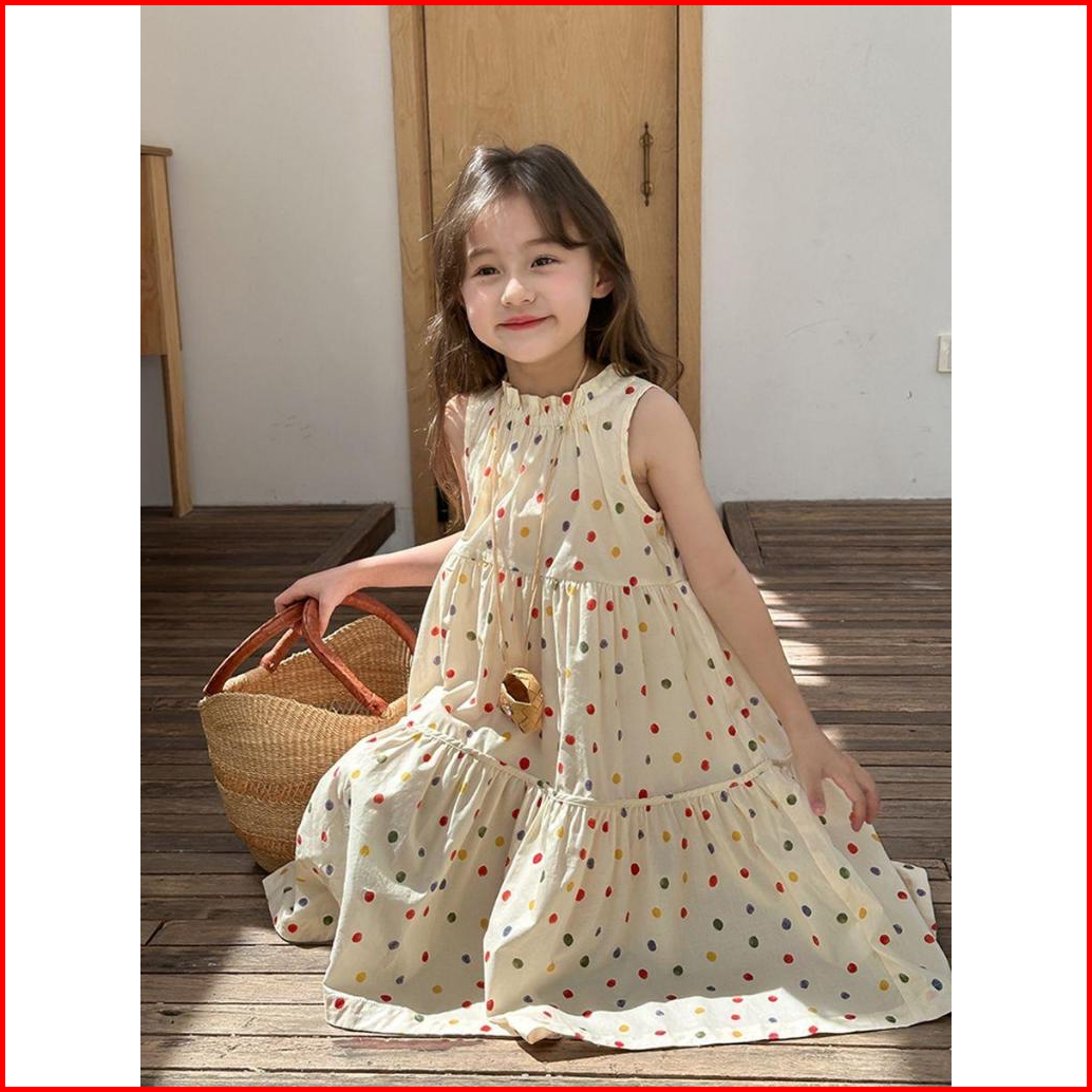 Happy Baby 3-10tahun Dress Anak Perempuan Tanpa Lengan Motif Cream Polkadot Bahan Cotton Adem Import Qz-175