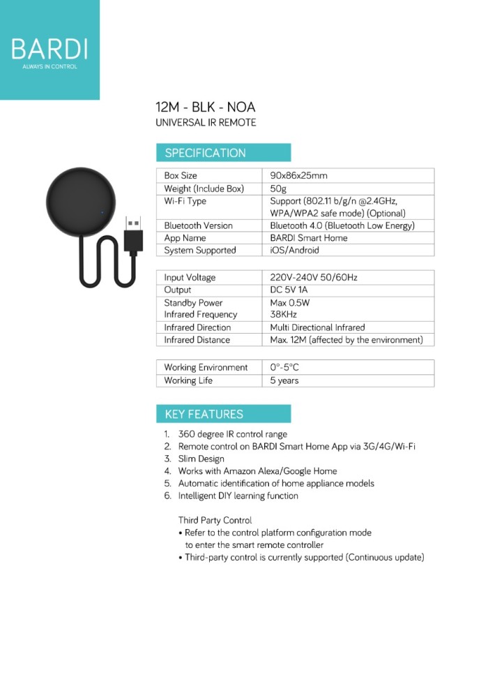 BARDI SMART UNIVERSAL IR REMOTE 12M - INFRA RED REMOTE WIFI MAX 12M