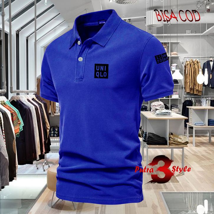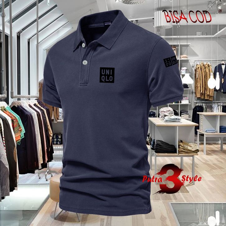 Tshirt Kaos Polo Kerah Uniqlo + Lengan Text Hitam Kaos Polo T Shirt Denim Premium Quality Unisex