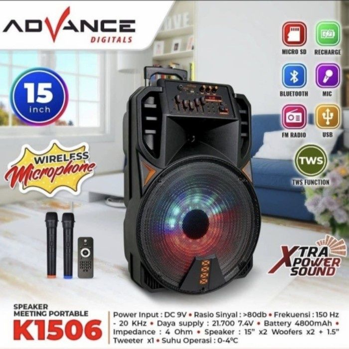Speaker Advance K1506 Bluetooth 15 inch 2 Mic Wireless Speaker Karaoke Speaker Bluetooth Protable Tahan Lama Stylish