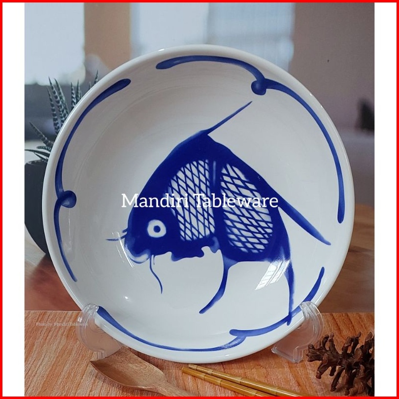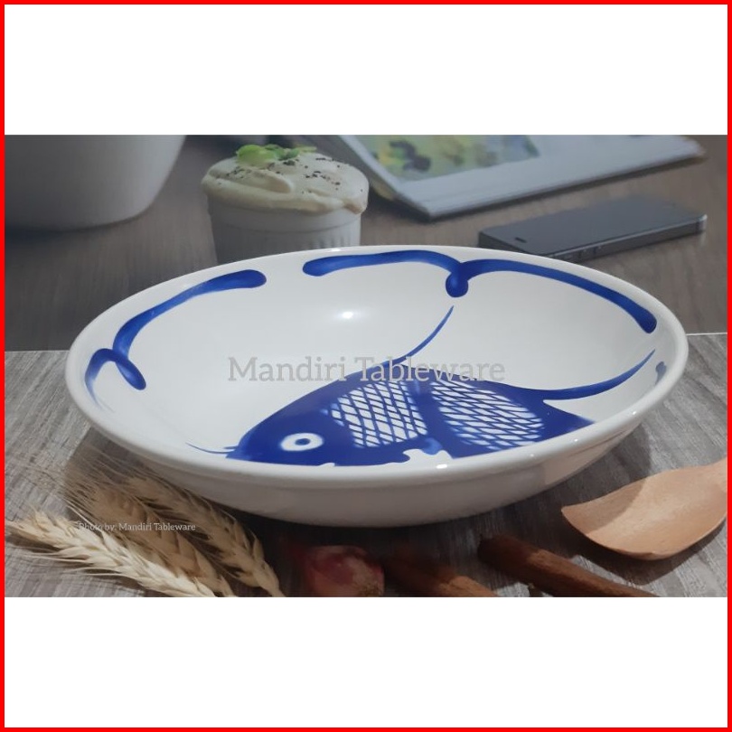 1 Pcs Piring Lontar Keramik 23 Cm Original Piring Papua Mangkok Saji Tebal Motif Blue Fish Best Quality