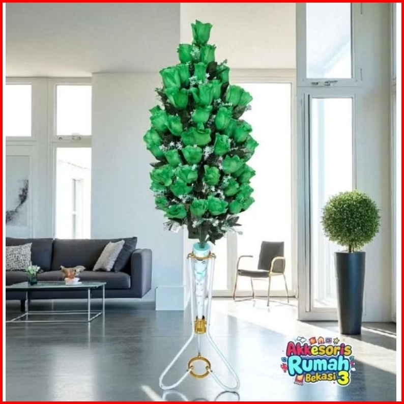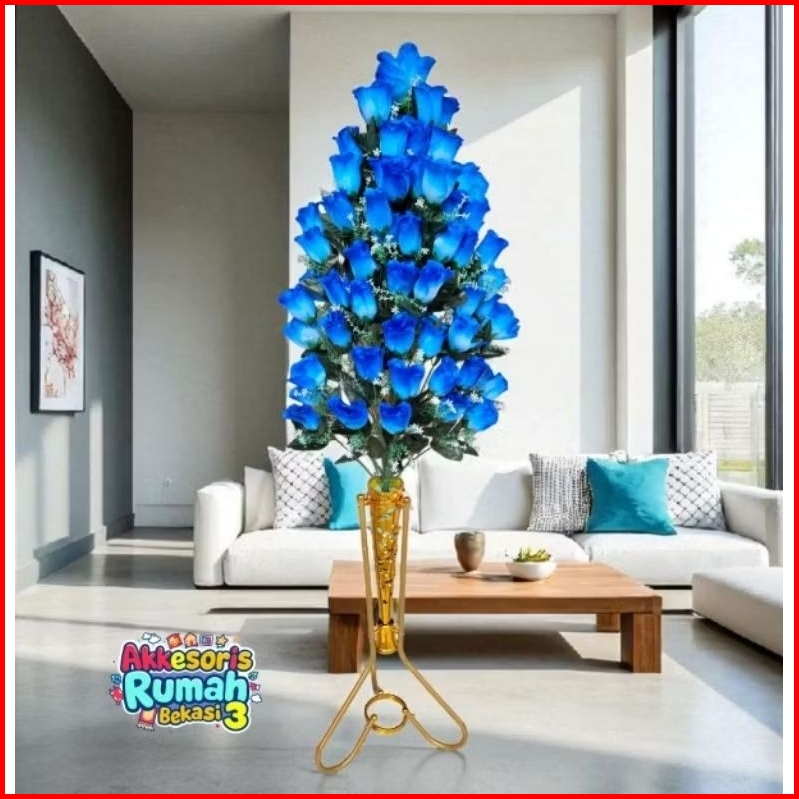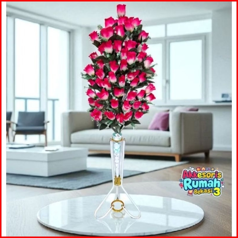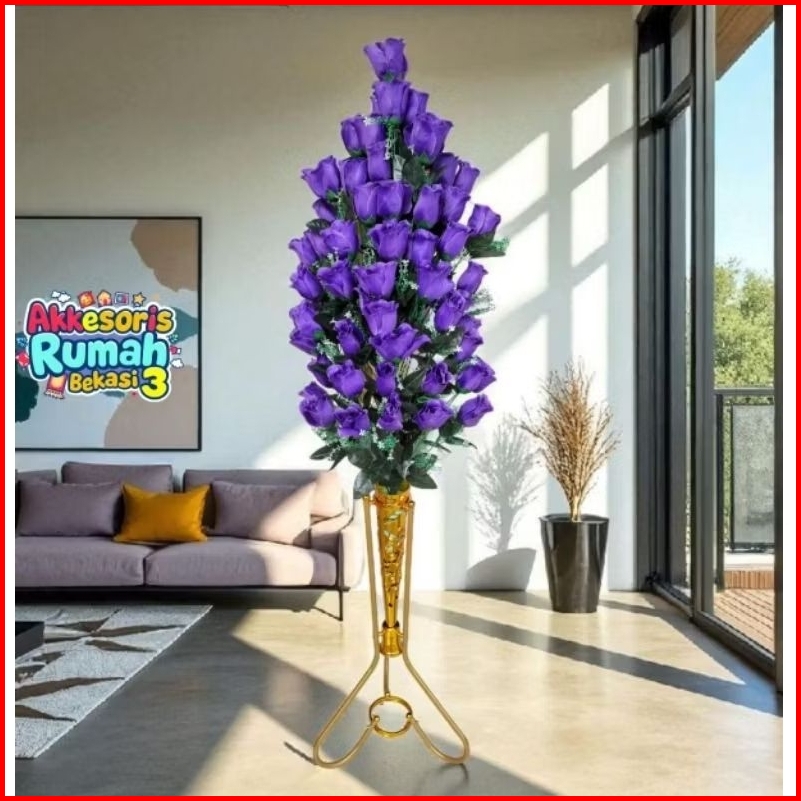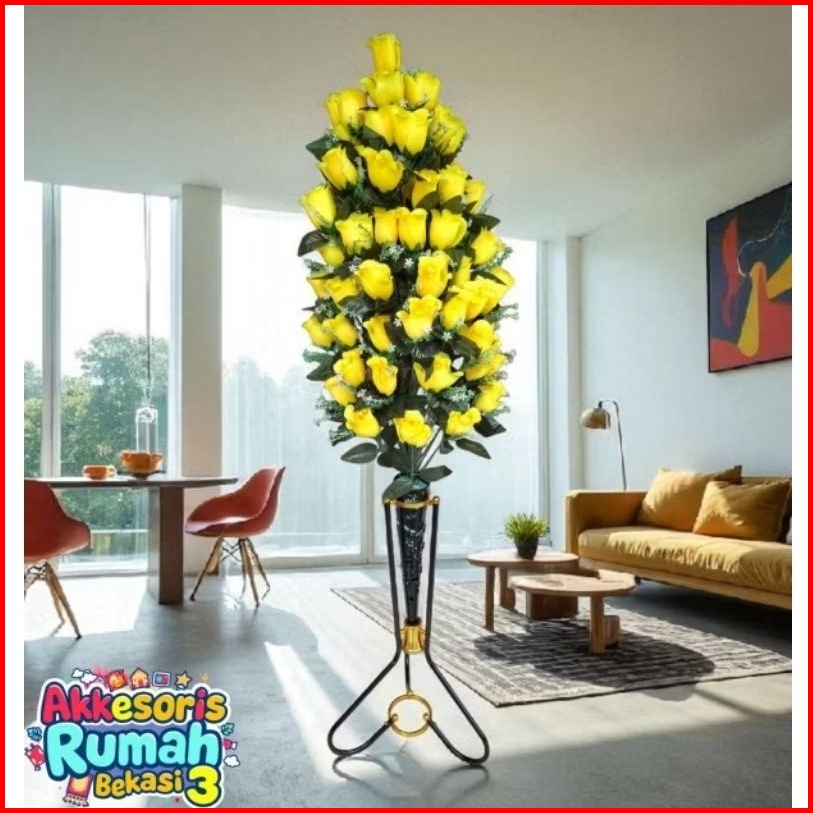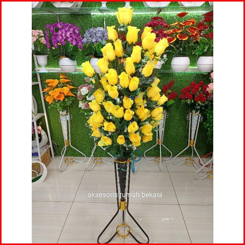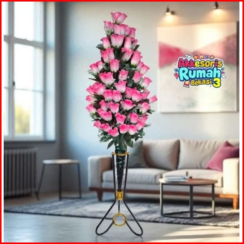 Bunga Sudut Mawar Kuncup Artificial Isi 60 Kuntum Dengan Pot Standing Besi