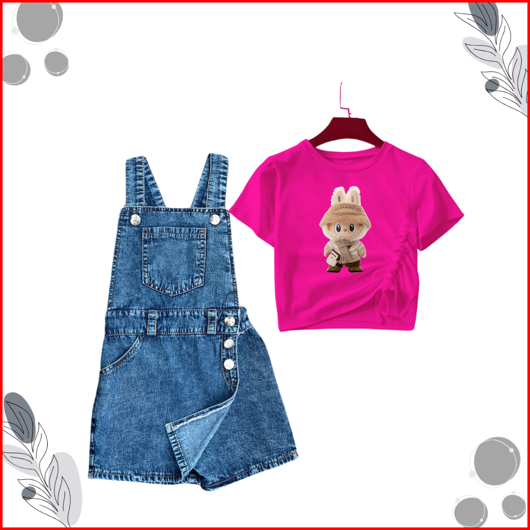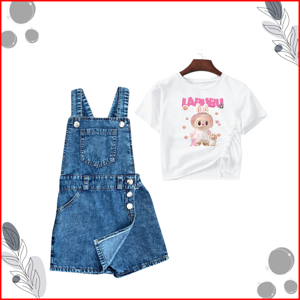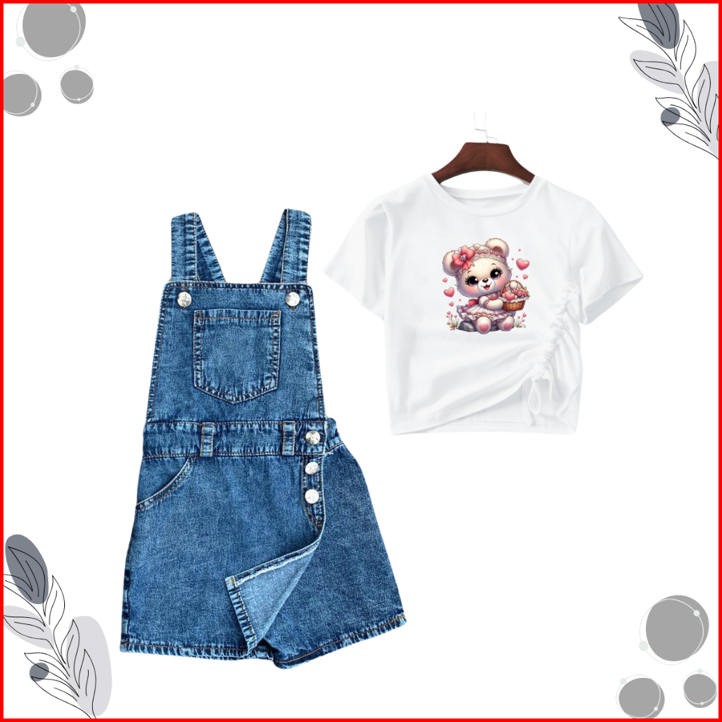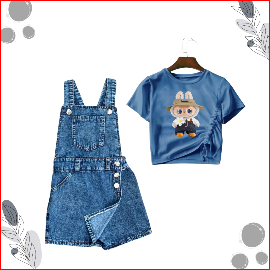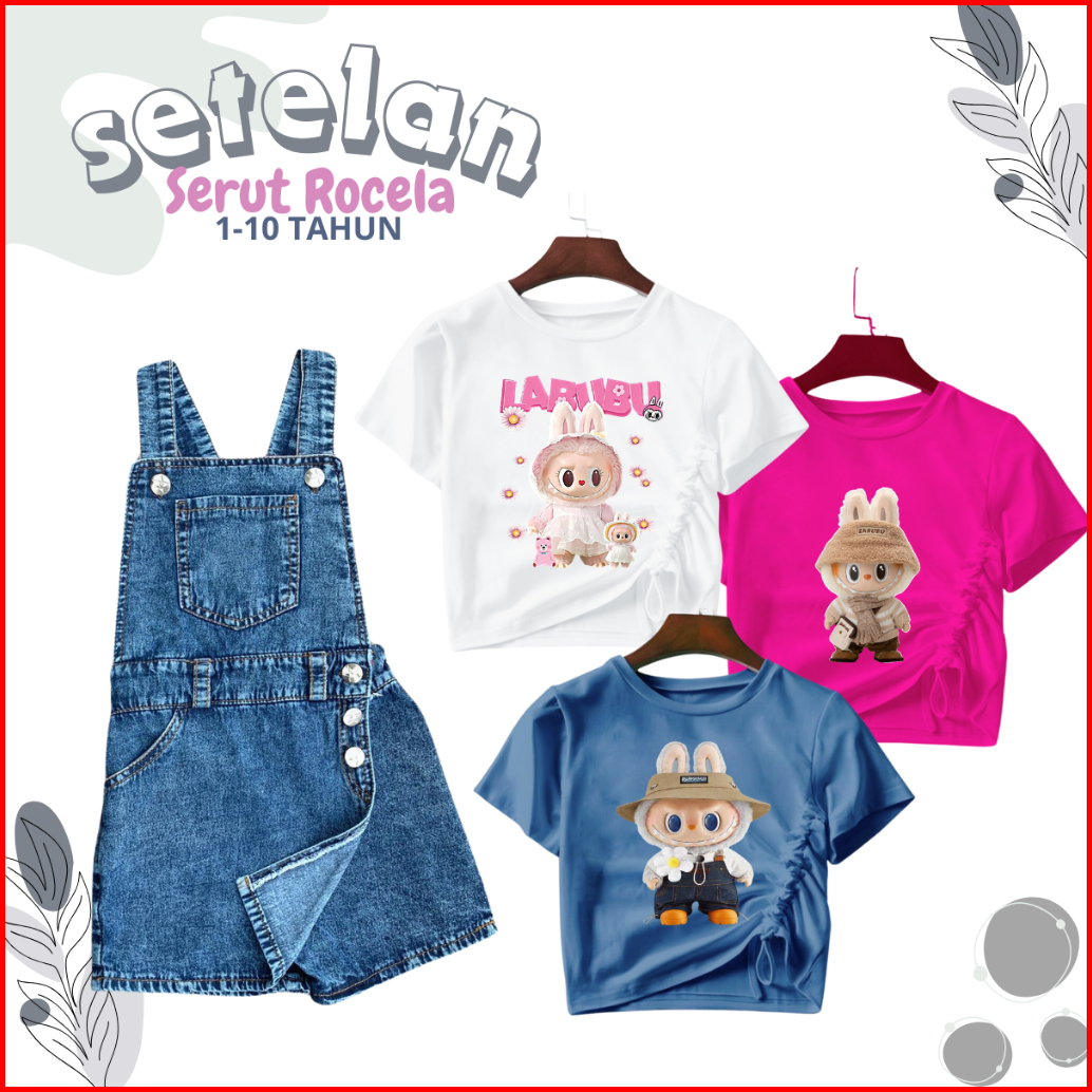 Stelan Overall Rocela Jeans Dan Atasan Croptop Serut Anak Perempuan Usia 1-10 Tahun