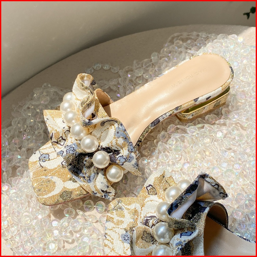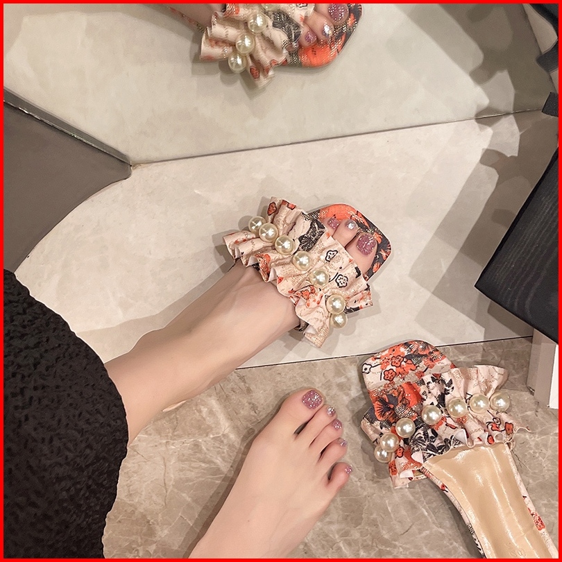 Sandal Bertumit Mutiara Bunga 3cm Terbaru Korea