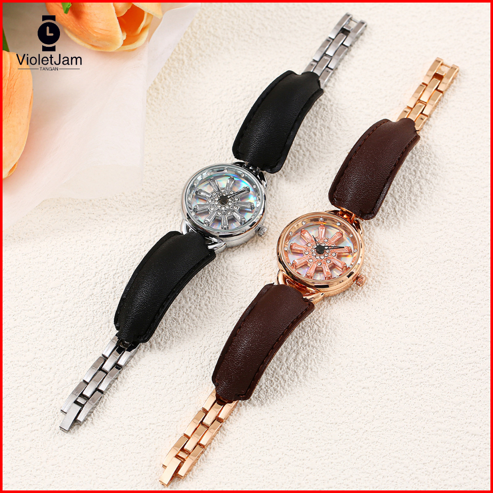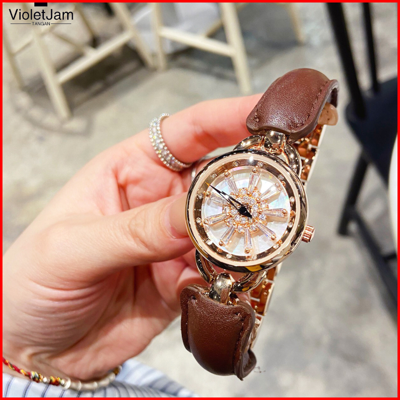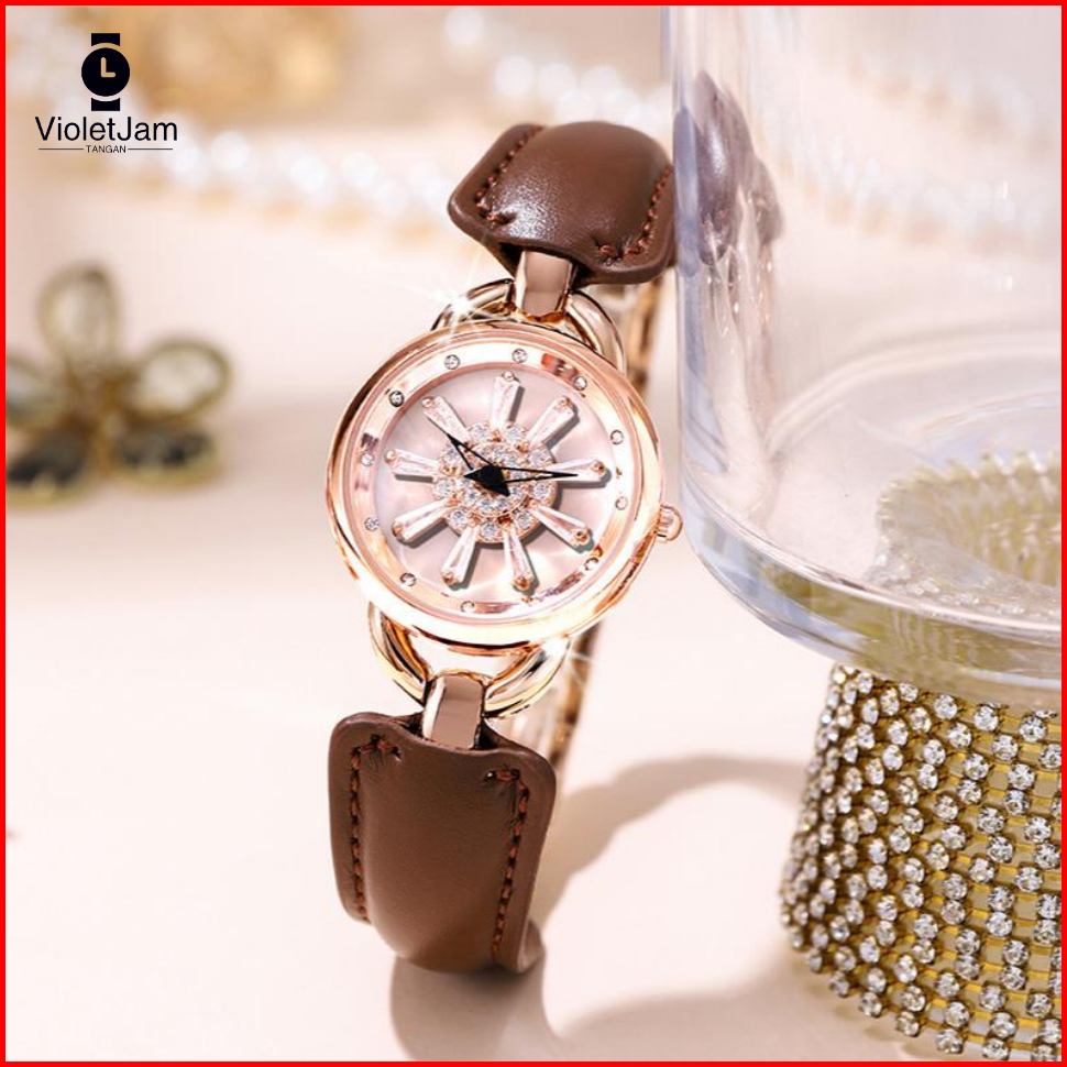 Jam Tangan Wanita Fashion Bulat Strap Kulit Rantai Simple Mewah Anti Air Jam Tangan Berputar
