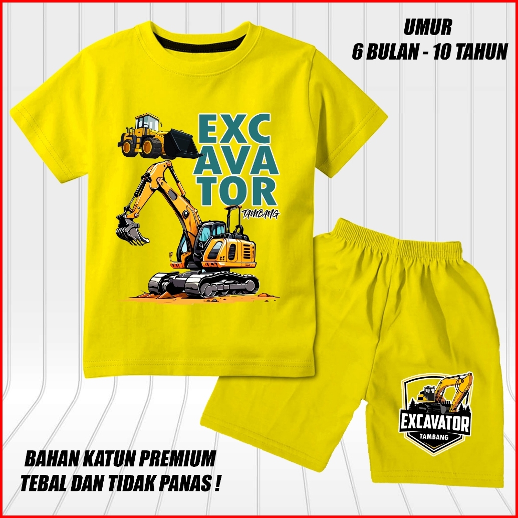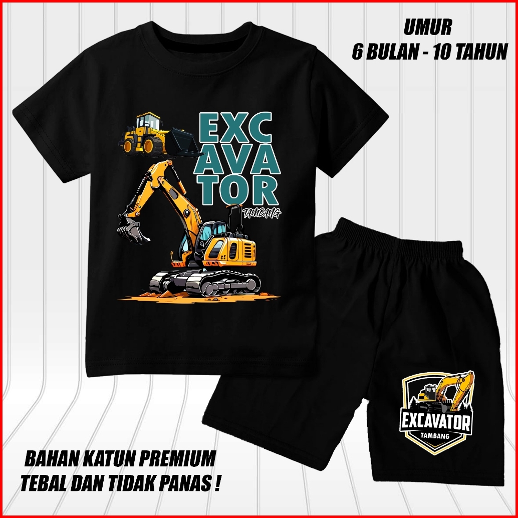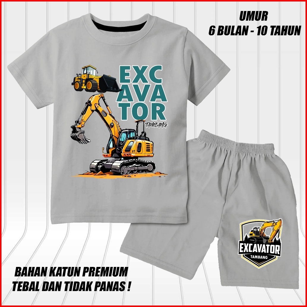 Setelan Lengan Pendek Anak Laki Laki Perempuan Set Baju Kaos Pendek Anak Cowok Motif Excavator 2 Tambang Dtf